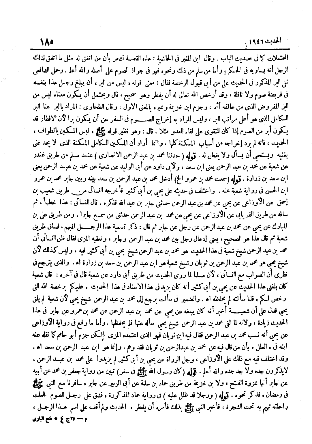 [1946] قَوْلُهُ حَدَّثَنَا مُحَمَّدُ بْنُ عَبْدِ الرَّحْمَنِ الْأَنْصَارِيُّ عِنْدَ مُسْلِمٍ مِنْ طَرِيقِ غُنْدَرٍ عَنْ شُعْبَةَ عَنْ مُحَمَّدِ بن عبد الرَّحْمَن يَعْنِي بن سَعْدٍ وَلِأَبِي دَاوُدَ عَنْ أَبِي الْوَلِيدِ عَنْ شُعْبَةَ عَنْ مُحَمَّدِ بْنِ عَبْدِ الرَّحْمَنِ يَعْنِي بن سَعْدِ بْنِ زُرَارَةَ قَوْلُهُ سَمِعْتُ مُحَمَّدَ بْنَ عَمْرٍو إِلَخْ أَدْخَلَ مُحَمَّدَ بْنَ عَبْدِ الرَّحْمَنِ بْنِ سَعْدٍ بَيْنَهُ وَبَيْنَ جَابِرٍ مُحَمَّدُ بْنُ عَمْرِو بْنِ الْحَسَنِ فِي رِوَايَةِ شُعْبَةَ عَنْهُ وَاخْتُلِفَ فِي حَدِيثِهِ عَلَى يَحْيَى بْنِ أَبِي كَثِيرٍ فَأَخْرَجَهُ النَّسَائِيُّ مِنْ طَرِيقِ شُعَيْبِ بْنِ إِسْحَاقَ عَنِ الْأَوْزَاعِيِّ عَنْ يَحْيَى عَنْ مُحَمَّدِ بْنِ عَبْدِ الرَّحْمَنِ حَدَّثَنِي جَابِرُ بْنُ عَبْدِ اللَّهِ فَذَكَرَهُ قَالَ النَّسَائِيُّ هَذَا خَطَأٌ ثُمَّ سَاقَهُ مِنْ طَرِيقِ الْفِرْيَابِيِّ عَنِ الْأَوْزَاعِيِّ عَنْ يَحْيَى عَنْ مُحَمَّدِ بْنِ عَبْدِ الرَّحْمَنِ حَدَّثَنِي مَنْ سَمِعَ جَابِرًا وَمِنْ طَرِيقِ عَلِيِّ بْنِ الْمُبَارَكِ عَنْ يَحْيَى عَنْ مُحَمَّدِ بْنِ عَبْدِ الرَّحْمَنِ عَنْ رَجُلٍ عَنْ جَابِرٍ ثُمَّ قَالَ ذِكْرُ تَسْمِيَةِ هَذَا الرَّجُلِ الْمُبْهَمِ فَسَاقَ طَرِيقَ شُعْبَةَ ثُمَّ قَالَ هَذَا هُوَ الصَّحِيحُ يَعْنِي إِدْخَالَ رَجُلٍ بَيْنَ مُحَمَّدِ بْنِ عَبْدِ الرَّحْمَنِ وَجَابِرٍ وَتَعَقَّبَهُ الْمِزِّيُّ فَقَالَ ظَنَّ النَّسَائِيُّ أَنَّ مُحَمَّدَ بْنَ عَبْدِ الرَّحْمَنِ شَيْخَ شُعْبَةَ فِي هَذَا الْحَدِيثِ هُوَ مُحَمَّدُ بْنُ عَبْدِ الرَّحْمَنِ شَيْخُ يَحْيَى بْنِ أَبِي كَثِيرٍ فِيهِ وَلَيْسَ كَذَلِكَ لِأَنَّ شَيْخَ يَحْيَى هُوَ مُحَمَّدُ بْنُ عَبْدِ الرَّحْمَنِ بْنِ ثَوْبَانَ وَشَيْخَ شُعْبَةَ هُوَ بْنِ عَبْدِ الرَّحْمَنِ بْنِ سَعْدِ بْنِ زُرَارَةَ اه وَالَّذِي يَتَرَجَّحُ فِي نَظَرِي أَنَّ الصَّوَابَ مَعَ النَّسَائِيِّ لِأَنَّ مُسْلِمًا لَمَّا رَوَى الْحَدِيثَ مِنْ طَرِيقِ أَبِي دَاوُدَ عَنْ شُعْبَةَ قَالَ فِي آخِرِهِ قَالَ شُعْبَةُ كَانَ بَلَغَنِي هَذَا الْحَدِيثُ عَنْ يَحْيَى بْنِ أَبِي كَثِيرٍ أَنَّهُ كَانَ يَزِيدُ فِي هَذَا الْإِسْنَادِ فِي هَذَا الْحَدِيثِ عَلَيْكُمْ بِرُخْصَةِ اللَّهِ الَّتِي رَخَّصَ لَكُمْ فَلَمَّا سَأَلْتُهُ لَمْ يَحْفَظْهُ اه وَالضَّمِيرُ فِي سَأَلْتُ يَرْجِعُ إِلَى مُحَمَّدِ بْنِ عَبْدِ الرَّحْمَنِ شَيْخِ يَحْيَى لِأَنَّ شُعْبَةَ لَمْ يَلْقَ يَحْيَى فَدَلَّ عَلَى أَنَّ شُعْبَةَ أَخْبَرَ أَنَّهُ كَانَ يُبَلِّغُهُ عَنْ يَحْيَى عَنْ مُحَمَّدِ بْنِ عَبْدِ الرَّحْمَنِ عَنْ مُحَمَّدِ بْنِ عَمْرٍو عَنْ جَابِرٍ فِي هَذَا الْحَدِيثِ زِيَادَةٌ وَلِأَنَّهُ لَمَّا لَقِيَ مُحَمَّدَ بْنَ عَبْدِ الرَّحْمَنِ شَيْخَ يَحْيَى سَأَلَهُ عَنْهَا فَلَمْ يَحْفَظْهَا وَأَمَّا مَا وَقَعَ فِي رِوَايَةِ الْأَوْزَاعِيِّ عَنْ يَحْيَى أَنَّهُ نَسَبَ مُحَمَّدَ بْنَ عبد الرَّحْمَن فَقَالَ فِيهِ بن ثَوْبَانَ فَهُوَ الَّذِي اعْتَمَدَهُ الْمِزِّيُّ لَكِنْ جَزَمَ أَبُو حَاتِمٍ كَمَا نَقَلَهُ عَنْهُ ابْنُهُ فِي الْعِلَلِ بِأَنَّ مَنْ قَالَ فِيهِ عَنْ مُحَمَّدِ بْنِ عَبْدِ الرَّحْمَنِ بْنِ ثَوْبَانَ فَقَدْ وَهَمَ وَإِنَّمَا هُوَ بن عَبْدِ الرَّحْمَنِ بْنِ سَعْدٍ اه وَقَدِ اخْتُلِفَ فِيهِ مَعَ ذَلِكَ عَلَى الْأَوْزَاعِيِّ وَجُلُّ الرُّوَاةِ عَنْ يَحْيَى بْنِ أَبِي كَثِيرٍ لَمْ يَزِيدُوا عَلَى مُحَمَّدِ بْنِ عَبْدِ الرَّحْمَنِ لَا يَذْكُرُونَ جَدَّهُ وَلَا جَدَّ جَدِّهِ وَاللَّهُ أَعْلَمُ قَوْلُهُ كَانَ رَسُولُ اللَّهِ صَلَّى اللَّهُ عَلَيْهِ وَسَلَّمَ فِي سَفَرٍ تَبَيَّنَ مِنْ رِوَايَةِ جَعْفَرِ بْنِ مُحَمَّدٍ عَنْ أَب