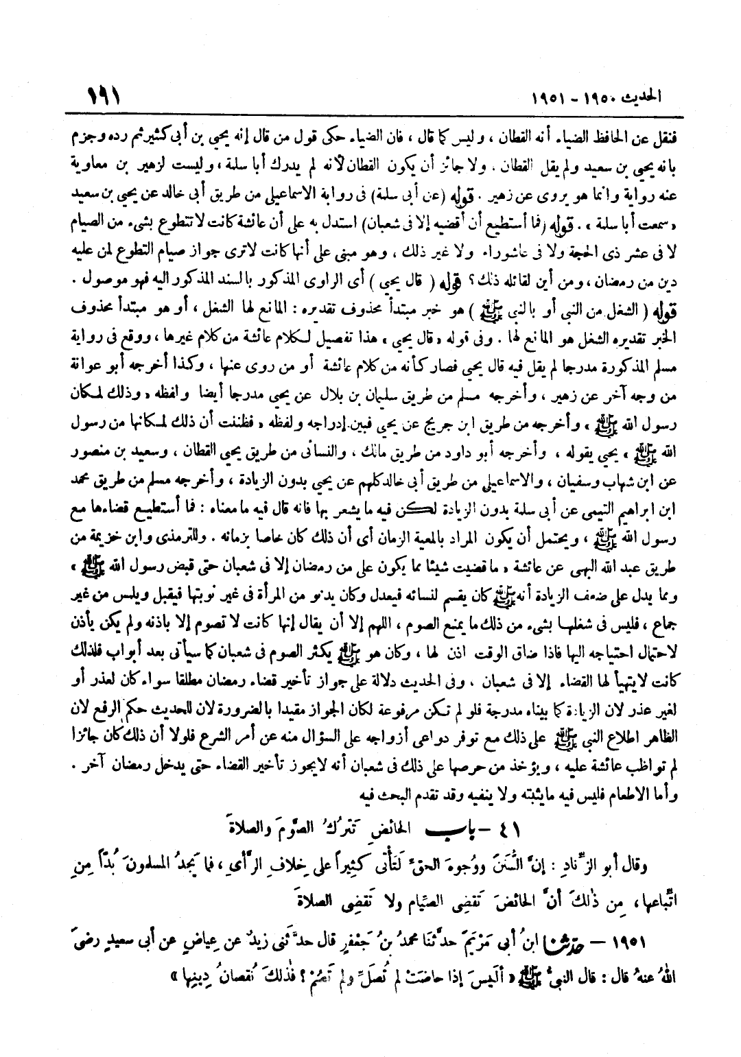 فَنَقَلَ عَنِ الْحَافِظِ الضِّيَاءِ أَنَّهُ الْقَطَّانُ وَلَيْسَ كَمَا قَالَ فَإِنَّ الضِّيَاءَ حَكَى قَوْلَ مَنْ قَالَ إِنَّهُ يَحْيَى بْنُ أَبِي كَثِيرٍ ثُمَّ رَدَّهُ وَجَزَمَ بِأَنَّهُ يَحْيَى بْنُ سَعِيدٍ وَلَمْ يَقُلِ الْقَطَّانَ وَلَا جَائِزٌ أَنْ يَكُونَ الْقَطَّانَ لِأَنَّهُ لَمْ يُدْرِكْ أَبَا سَلَمَةَ وَلَيْسَتْ لِزُهَيْرِ بْنِ مُعَاوِيَةَ عَنْهُ رِوَايَةٌ وَإِنَّمَا هُوَ يَرْوِي عَنْ زُهَيْرٍ قَوْلُهُ عَنْ أَبِي سَلَمَةَ فِي رِوَايَةِ الْإِسْمَاعِيلِيِّ مِنْ طَرِيقِ أَبِي خَالِدٍ عَنْ يَحْيَى بْنِ سَعِيدٍ سَمِعْتُ أَبَا سَلَمَةَ قَوْلُهُ فَمَا أَسْتَطِيعُ أَنْ أَقْضِيَهُ إِلَّا فِي شَعْبَانَ اسْتُدِلَّ بِهِ عَلَى أَنَّ عَائِشَةَ كَانَتْ لَا تَتَطَوَّعُ بِشَيْءٍ مِنَ الصِّيَامِ لَا فِي عَشْرِ ذِي الْحِجَّةِ وَلَا فِي عَاشُورَاءَ وَلَا غَيْرِ ذَلِكَ وَهُوَ مَبْنِيٌّ عَلَى أَنَّهَا كَانَتْ لَا تَرَى جَوَازَ صِيَامِ التَّطَوُّعِ لِمَنْ عَلَيْهِ دَيْنٌ مِنْ رَمَضَانَ وَمِنْ أَيْنَ لِقَائِلِهِ ذَلِكَ قَوْلُهُ قَالَ يَحْيَى أَيِ الرَّاوِي الْمَذْكُورُ بِالسَّنَدِ الْمَذْكُورِ إِلَيْهِ فَهُوَ مَوْصُولٌ قَوْلُهُ الشُّغْلُ مِنَ النَّبِيِّ أَوْ بِالنَّبِيِّ صَلَّى اللَّهُ عَلَيْهِ وَسَلَّمَ هُوَ خَبَرُ مُبْتَدَأٍ مَحْذُوفٍ تَقْدِيرُهُ الْمَانِعُ لَهَا الشُّغْلُ أَوْ هُوَ مُبْتَدَأٌ مَحْذُوفُ الْخَبَرِ تَقْدِيرُهُ الشُّغْلُ هُوَ الْمَانِعُ لَهَا وَفِي قَوْلِهِ قَالَ يَحْيَى هَذَا تَفْصِيلٌ لِكَلَامِ عَائِشَةَ مِنْ كَلَامِ غَيْرِهَا وَوَقَعَ فِي رِوَايَةِ مُسْلِمٍ الْمَذْكُورَةِ مُدْرَجًا لَمْ يَقُلْ فِيهِ قَالَ يَحْيَى فَصَارَ كَأَنَّهُ مِنْ كَلَامِ عَائِشَةَ أَوْ مَنْ رَوَى عَنْهَا وَكَذَا أَخْرَجَهُ أَبُو عَوَانَةَ مِنْ وَجْهٍ آخَرَ عَنْ زُهَيْرٍ وَأَخْرَجَهُ مُسْلِمٌ مِنْ طَرِيقِ سُلَيْمَانَ بْنِ بِلَالٍ عَنْ يَحْيَى مُدْرَجًا أَيْضًا وَلَفْظُهُ وَذَلِكَ لِمَكَانِ رَسُولِ اللَّهِ صَلَّى اللَّهُ عَلَيْهِ وَسَلَّمَ وَأَخْرَجَهُ من طَرِيق بن جُرَيْجٍ عَنْ يَحْيَى فَبَيَّنَ إِدْرَاجَهُ وَلَفْظُهُ فَظَنَنْتُ أَنَّ ذَلِكَ لِمَكَانِهَا مِنْ رَسُولِ اللَّهِ صَلَّى اللَّهُ عَلَيْهِ وَسَلَّمَ يَحْيَى يَقُولُهُ وَأَخْرَجَهُ أَبُو دَاوُدَ مِنْ طَرِيقِ مَالِكٍ وَالنَّسَائِيُّ مِنْ طَرِيقِ يحيى الْقطَّان وَسَعِيد بن مَنْصُور عَن بن شِهَابٍ وَسُفْيَانُ وَالْإِسْمَاعِيلِيُّ مِنْ طَرِيقِ أَبِي خَالِدٍ كُلُّهُمْ عَنْ يَحْيَى بِدُونِ الزِّيَادَةِ وَأَخْرَجَهُ مُسْلِمٌ مِنْ طَرِيقِ مُحَمَّدِ بْنِ إِبْرَاهِيمَ التَّيْمِيِّ عَنْ أَبِي سَلَمَةَ بِدُونِ الزِّيَادَةِ لَكِنْ فِيهِ مَا يُشْعِرُ بِهَا فَإِنَّهُ قَالَ فِيهِ مَا مَعْنَاهُ فَمَا أَسْتَطِيعُ قَضَاءَهَا مَعَ رَسُولِ اللَّهِ صَلَّى اللَّهُ عَلَيْهِ وَسَلَّمَ وَيُحْتَمَلُ أَنْ يَكُونَ الْمُرَادُ بِالْمَعِيَّةِ الزَّمَانَ أَيْ إِنَّ ذَلِكَ كَانَ خَاصًّا بِزَمَانِهِ وللترمذي وبن خُزَيْمَةَ مِنْ طَرِيقِ عَبْدِ اللَّهِ الْبَهِيِّ عَنْ عَائِشَةَ مَا قَضَيْتُ شَيْئًا مِمَّا يَكُونُ عَلَيَّ مِنْ رَمَضَانَ إِلَّا فِي شَعْبَانَ حَتَّى قُبِضَ رَسُولُ اللَّهِ صَلَّى اللَّهُ عَلَيْهِ وَسَلَّمَ وَمِمَّا يَدُلُّ عَلَى ضَعْفِ الزِّيَادَةِ أَنَّهُ صَلَّى اللَّهُ عَلَيْهِ وَسَلَّمَ كَانَ يَقْسِمُ لِنِسَائِهِ فَيَعْدِلُ وَكَانَ يَدْنُو مِنَ الْمَرْأَةِ فِي غَيْرِ نَوْبَتِهَا فَيُقَبِّلُ وَيَلْمِسُ مِنْ غَيْرِ جِمَاعٍ فَلَيْسَ فِي شُغْلِهَا بِشَيْءٍ مِنْ ذَلِكَ مَا يَمْنَعُ الصَّوْمَ اللَّهُمَّ إِلَّا أَنْ يُقَالَ إِنَّهَا كَانَتْ لَا تَصُومُ إِلَّا بِإِذْنِهِ وَلَمْ يَكُنْ يَأْذَنُ لِاحْتِمَالِ احْتِيَاجِهِ إِلَيْهَا فَإِ