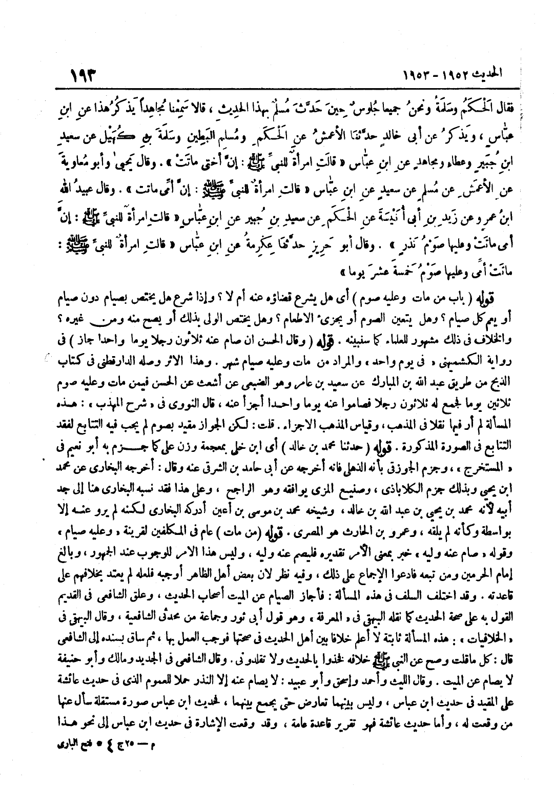 أَيْ هَلْ يُشْرَعُ قَضَاؤُهُ عَنْهُ أَمْ لَا وَإِذَا شُرِعَ هَلْ يَخْتَصُّ بِصِيَامٍ دُونَ صِيَامٍ أَوْ يَعُمُّ كُلَّ صِيَامٍ وَهَلْ يَتَعَيَّنُ الصَّوْمُ أَوْ يُجْزِئُ الْإِطْعَامُ وَهَلْ يَخْتَصُّ الْوَلِيُّ بِذَلِكَ أَوْ يَصِحُّ مِنْهُ وَمِنْ غَيْرِهِ وَالْخِلَافُ فِي ذَلِكَ مَشْهُورٌ لِلْعُلَمَاءِ كَمَا سَنُبَيِّنُهُ قَوْلُهُ وَقَالَ الْحَسَنُ إِنْ صَامَ عَنْهُ ثَلَاثُونَ رَجُلًا يَوْمًا وَاحِدًا جَازَ فِي رِوَايَةِ الْكُشْمِيهَنِيِّ فِي يَوْمٍ وَاحِدٍ وَالْمُرَادُ مَنْ مَاتَ وَعَلَيْهِ صِيَامُ شَهْرٍ وَهَذَا الْأَثَرُ وَصَلَهُ الدَّارَقُطْنِيُّ فِي كِتَابِ الذَّبْحِ مِنْ طَرِيقِ عَبْدِ اللَّهِ بْنِ الْمُبَارَكِ عَنْ سَعِيدِ بْنِ عَامِرٍ وَهُوَ الضُّبَعِيُّ عَنْ أَشْعَثَ عَنِ الْحَسَنِ فِيمَنْ مَاتَ وَعَلَيْهِ صَوْمُ ثَلَاثِينَ يَوْمًا فَجُمِعَ لَهُ ثَلَاثُونَ رَجُلًا فَصَامُوا عَنْهُ يَوْمًا وَاحِدًا أَجْزَأَ عَنْهُ قَالَ النَّوَوِيُّ فِي شَرْحِ الْمُهَذَّبِ هَذِهِ الْمَسْأَلَةُ لَمْ أَرَ فِيهَا نَقْلًا فِي الْمَذْهَبِ وَقِيَاسُ الْمَذْهَبِ الْإِجْزَاءُ قُلْتُ لَكِنَّ الْجَوَازَ مُقَيَّدٌ بِصَوْمٍ لَمْ يَجِبْ فِيهِ التَّتَابُعُ لِفَقْدِ التَّتَابُعِ فِي الصُّورَةِ الْمَذْكُورَةِ