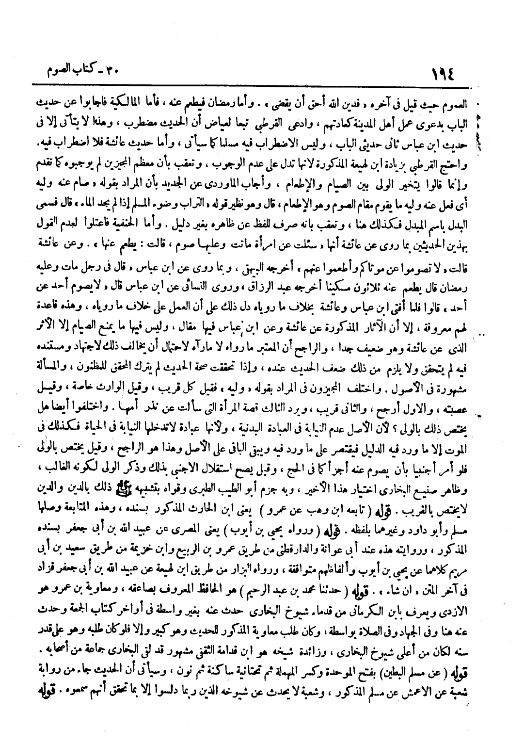 الْعُمُومِ حَيْثُ قِيلَ فِي آخِرِهِ فَدَيْنُ اللَّهِ أَحَقُّ أَنْ يُقْضَى وَأَمَّا رَمَضَانُ فَيُطْعِمُ عَنْهُ فَأَمَّا الْمَالِكِيَّةُ فَأَجَابُوا عَنْ حَدِيثِ الْبَابِ بِدَعْوَى عَمَلِ أَهْلِ الْمَدِينَةِ كَعَادَتِهِمْ وَادَّعَى الْقُرْطُبِيُّ تَبَعًا لِعِيَاضٍ أَنَّ الْحَدِيثَ مُضْطَرِبٌ وَهَذَا لَا يَتَأَتَّى إِلَّا فِي حَدِيث بن عَبَّاسٍ ثَانِي حَدِيثَيِ الْبَابِ وَلَيْسَ الِاضْطِرَابُ فِيهِ مُسَلَّمًا كَمَا سَيَأْتِي وَأَمَّا حَدِيثُ عَائِشَةَ فَلَا اضْطِرَاب فِيهِ وَاحْتج الْقُرْطُبِيّ بِزِيَادَة بن لَهِيعَةَ الْمَذْكُورَةِ لِأَنَّهَا تَدُلُّ عَلَى عَدَمِ الْوُجُوبِ وَتُعُقِّبَ بِأَنَّ مُعْظَمَ الْمُجِيزِينَ لَمْ يُوجِبُوهُ كَمَا تَقَدَّمَ وَإِنَّمَا قَالُوا يَتَخَيَّرُ الْوَلِيُّ بَيْنَ الصِّيَامِ وَالْإِطْعَامِ وَأَجَابَ الْمَاوَرْدِيُّ عَنِ الْجَدِيدِ بِأَنَّ الْمُرَادَ بِقَوْلِهِ صَامَ عَنْهُ وَلِيُّهُ أَيْ فَعَلَ عَنْهُ وَلِيُّهُ مَا يَقُومُ مَقَامَ الصَّوْمِ وَهُوَ الْإِطْعَامُ قَالَ وَهُوَ نَظِيرُ قَوْلِهِ التُّرَابُ وَضُوءُ الْمُسْلِمِ إِذَا لَمْ يَجِدِ الْمَاءَ قَالَ فَسَمَّى الْبَدَلَ بِاسْمِ الْمُبْدَلِ فَكَذَلِكَ هُنَا وَتُعُقِّبَ بِأَنَّهُ صَرْفٌ لِلَّفْظِ عَنْ ظَاهِرِهِ بِغَيْرِ دَلِيلٍ وَأَمَّا الْحَنَفِيَّةُ فَاعْتَلُّوا لِعَدَمِ الْقَوْلِ بِهَذَيْنِ الْحَدِيثِينَ بِمَا رُوِيَ عَنْ عَائِشَةَ أَنَّهَا سُئِلَتْ عَنِ امْرَأَةٍ مَاتَتْ وَعَلَيْهَا صَوْمٌ قَالَتْ يُطْعَمُ عَنْهَا وَعَنْ عَائِشَةَ قَالَتْ لَا تَصُومُوا عَنْ مَوْتَاكُمْ وَأَطْعِمُوا عَنْهُمْ أخرجه الْبَيْهَقِيّ وَبِمَا رُوِيَ عَن بن عَبَّاسٍ قَالَ فِي رَجُلٍ مَاتَ وَعَلَيْهِ رَمَضَانُ قَالَ يُطْعَمُ عَنْهُ ثَلَاثُونَ مِسْكِينًا أَخْرَجَهُ عَبْدُ الرَّزَّاق وروى النَّسَائِيّ عَن بن عَبَّاسٍ قَالَ لَا يَصُومُ أَحَدٌ عَنْ أَحَدٍ قَالُوا فَلَمَّا أفتى بن عَبَّاسٍ وَعَائِشَةُ بِخِلَافِ مَا رَوَيَاهُ دَلَّ ذَلِكَ عَلَى أَنَّ الْعَمَلَ عَلَى خِلَافِ مَا رَوَيَاهُ وَهَذِهِ قَاعِدَةٌ لَهُمْ مَعْرُوفَةٌ إِلَّا أَنَّ الْآثَارَ الْمَذْكُورَة عَن عَائِشَة وَعَن بن عَبَّاسٍ فِيهَا مَقَالٌ وَلَيْسَ فِيهَا مَا يَمْنَعُ الصِّيَامَ إِلَّا الْأَثَرُ الَّذِي عَنْ عَائِشَةَ وَهُوَ ضَعِيفٌ جِدًّا وَالرَّاجِحُ أَنَّ الْمُعْتَبَرَ مَا رَوَاهُ لَا ماراه لاحْتِمَال أَن يُخَالف ذَلِك لاجتهاد وَمُسْتَنَدُهُ فِيهِ لَمْ يَتَحَقَّقْ وَلَا يَلْزَمُ مِنْ ذَلِكَ ضَعْفُ الْحَدِيثِ عِنْدَهُ وَإِذَا تَحَقَّقَتْ صِحَّةُ الْحَدِيثِ لَمْ يُتْرَكِ الْمُحَقَّقُ لِلْمَظْنُونِ وَالْمَسْأَلَةُ مَشْهُورَةٌ فِي الْأُصُولِ وَاخْتَلَفَ الْمُجِيزُونَ فِي الْمُرَادِ بِقَوْلِهِ وَلِيُّهُ فَقِيلَ كُلُّ قَرِيبٍ وَقِيلَ الْوَارِثُ خَاصَّةً وَقِيلَ عَصَبَتُهُ وَالْأَوَّلُ أَرْجَحُ وَالثَّانِي قَرِيبٌ وَيَرُدُّ الثَّالِثَ قِصَّةُ الْمَرْأَةِ الَّتِي سَأَلَتْ عَنْ نَذْرِ أُمِّهَا وَاخْتَلَفُوا أَيْضًا هَلْ يَخْتَصُّ ذَلِكَ بِالْوَلِيِّ لِأَنَّ الْأَصْلَ عَدَمُ النِّيَابَةِ فِي الْعِبَادَةِ الْبَدَنِيَّةِ وَلِأَنَّهَا عِبَادَةٌ لَا تَدْخُلُهَا النِّيَابَةُ فِي الْحَيَاةِ فَكَذَلِكَ فِي الْمَوْتِ إِلَّا مَا وَرَدَ فِيهِ الدَّلِيلُ فَيُقْتَصَرُ عَلَى مَا وَرَدَ فِيهِ وَيَبْقَى الْبَاقِي عَلَى الْأَصْلِ وَهَذَا هُوَ الرَّاجِحُ وَقِيلَ يَخْتَصُّ بِالْوَلِيِّ فَلَوْ أَمَرَ أَجْنَبِيًّا بِأَنْ يَصُومَ عَنْهُ أَجْزَأَ كَمَا فِي الْحَجِّ وَقِيلَ يَصِحُّ اسْتِقْلَالُ الْأَجْنَبِيِّ بِذَلِكَ وَذَكَرَ الْوَلِيَّ لِكَوْنِهِ الْغَالِبَ وَظَاهِرُ صَنِيعِ الْبُخَارِيِّ اخْتِيَارُ هَذَا الْأَخِيرِ وَبِهِ جَزَمَ أَبُو 