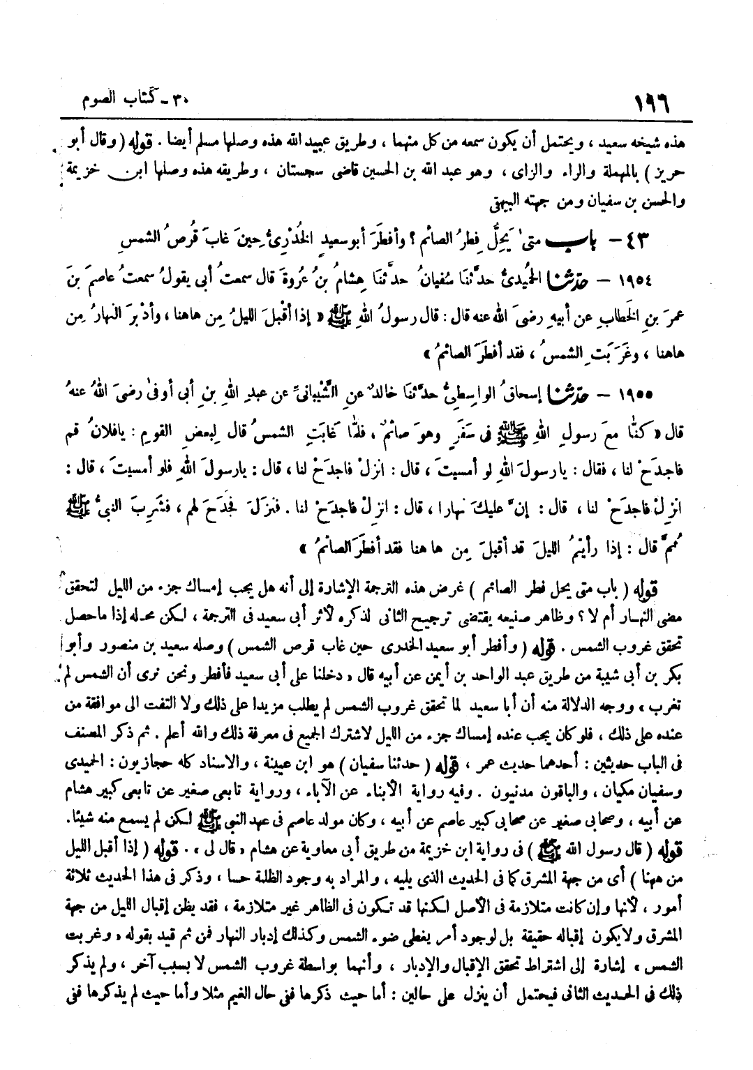 [1954] قَوْله حَدثنَا سُفْيَان هُوَ بن عُيَيْنَةَ وَالْإِسْنَادُ كُلُّهُ حِجَازِيُّونَ الْحُمَيْدِيُّ وَسُفْيَانُ مَكِّيَّانِ وَالْبَاقُونَ مَدَنِيُّونَ وَفِيهِ رِوَايَةُ الْأَبْنَاءِ عَنِ الْآبَاءِ وَرِوَايَةُ تَابِعِيٍّ صَغِيرٍ عَنْ تَابِعِيٍّ كَبِيرٍ هِشَامٍ عَنْ أَبِيهِ وَصَحَابِيٍّ صَغِيرٍ عَنْ صَحَابِيٍّ كَبِيرٍ عَاصِمٍ عَنْ أَبِيهِ وَكَانَ مَوْلِدُ عَاصِمٍ فِي عَهْدِ النَّبِيِّ صَلَّى اللَّهُ عَلَيْهِ وَسَلَّمَ لَكِنْ لَمْ يَسْمَعْ مِنْهُ شَيْئًا قَوْلُهُ قَالَ رَسُولُ اللَّهِ صَلَّى اللَّهُ عَلَيْهِ وَسَلَّمَ فِي رِوَايَةِ بن خُزَيْمَةَ مِنْ طَرِيقِ أَبِي مُعَاوِيَةَ عَنْ هِشَامٍ قَالَ لِي قَوْلُهُ إِذَا أَقْبَلَ اللَّيْلُ مِنْ هَا هُنَا أَيْ مِنْ جِهَةِ الْمَشْرِقِ كَمَا فِي الْحَدِيثِ الَّذِي يَلِيهِ وَالْمُرَادُ بِهِ وُجُودُ الظُّلْمَةِ حِسًّا وَذَكَرَ فِي هَذَا الْحَدِيثِ ثَلَاثَةَ أُمُورٍ لِأَنَّهَا وَإِنْ كَانَتْ مُتَلَازِمَةً فِي الْأَصْلِ لَكِنَّهَا قَدْ تَكُونُ فِي الظَّاهِرِ غَيْرَ مُتَلَازِمَةٍ فَقَدْ يُظَنُّ إِقْبَالُ اللَّيْلِ مِنْ جِهَةِ الْمَشْرِقِ وَلَا يَكُونُ إِقْبَالُهُ حَقِيقَةً بَلْ لِوُجُودِ أَمْرٍ يُغَطِّي ضَوْءَ الشَّمْسِ وَكَذَلِكَ إِدْبَارُ النَّهَارِ فَمِنْ ثَمَّ قَيَّدَ بِقَوْلِهِ وَغَرَبَتِ الشَّمْسُ إِشَارَةً إِلَى اشْتِرَاطِ تَحَقُّقِ الْإِقْبَالِ وَالْإِدْبَارِ وَأَنَّهُمَا بِوَاسِطَةِ غُرُوبِ الشَّمْسِ لَا بِسَبَبٍ آخَرَ وَلَمْ يَذْكُرْ ذَلِكَ فِي الْحَدِيثِ الثَّانِي فَيُحْتَمَلُ أَنْ يُنَزَّلَ عَلَى حَالَيْنِ أَمَّا حَيْثُ ذَكَرَهَا فَفِي حَالِ الْغَيْمِ مَثَلًا وَأَمَّا حَيْثُ لَمْ يَذْكُرْهَا فَفِي