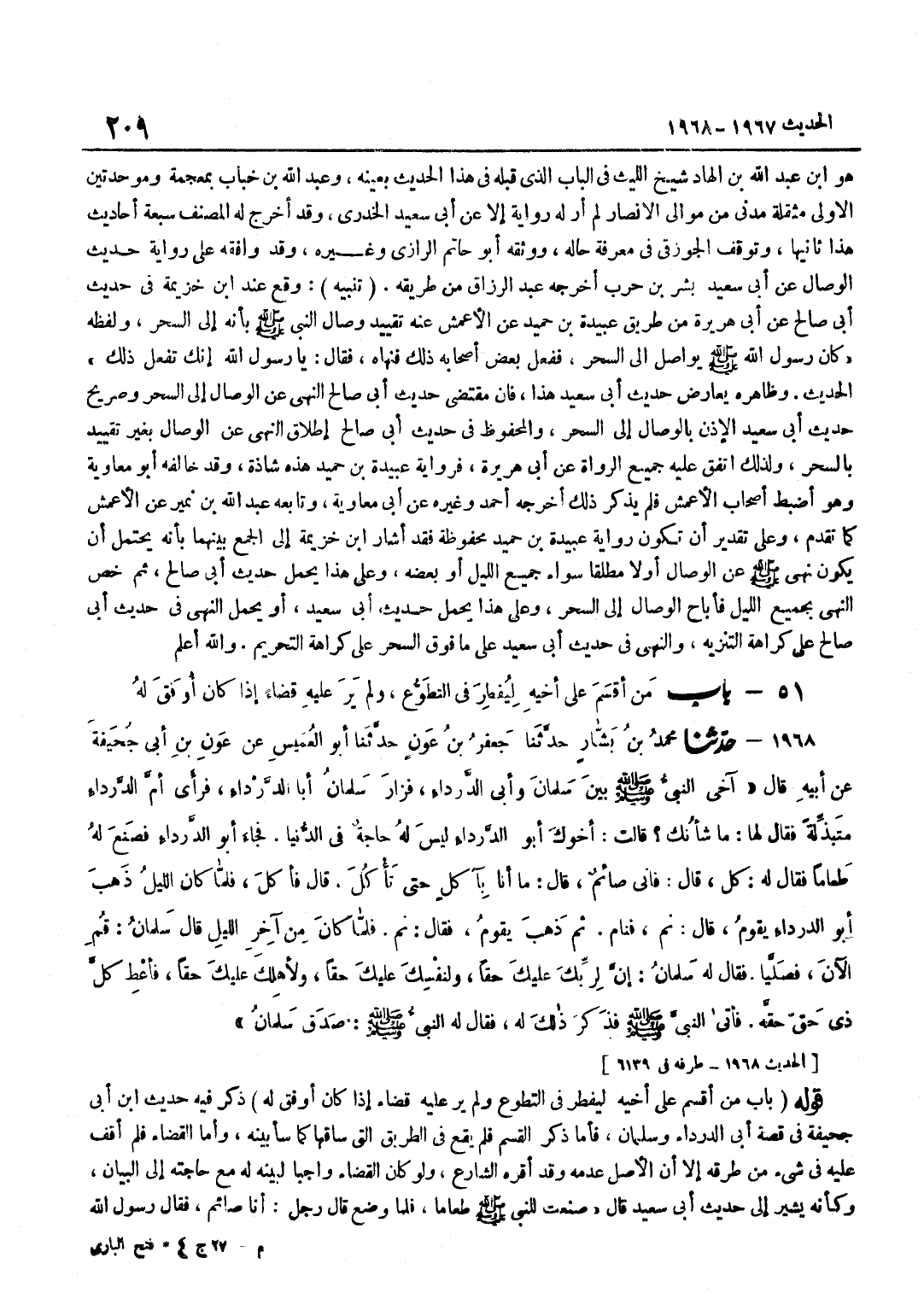 هُوَ بن عَبْدِ اللَّهِ بْنِ الْهَادِ شَيْخُ اللَّيْثِ فِي الْبَابِ الَّذِي قَبْلَهُ فِي هَذَا الْحَدِيثِ بِعَيْنِهِ وَعَبْدُ اللَّهِ بْنِ خَبَّابٍ بِمُعْجَمَةٍ وَمُوَحَّدَتَيْنِ الْأُولَى مُثَقَّلَةٌ مَدَنِيٌّ مِنْ مَوَالِي الْأَنْصَارِ لَمْ أَرَ لَهُ رِوَايَةً إِلَّا عَنْ أَبِي سَعِيدٍ الْخُدْرِيِّ وَقَدْ أَخْرَجَ لَهُ الْمُصَنِّفُ سَبْعَةَ أَحَادِيثَ هَذَا ثَانِيهَا وَتَوَقَّفَ الْجَوْزَقِيُّ فِي مَعْرِفَةِ حَالِهِ وَوَثَّقَهُ أَبُو حَاتِمٍ الرَّازِيُّ وَغَيْرُهُ وَقَدْ وَافَقَهُ عَلَى رِوَايَةِ حَدِيثِ الْوِصَالِ عَنْ أَبِي سَعِيدٍ بِشْرُ بْنُ حَرْبٍ أَخْرَجَهُ عَبْدُ الرَّزَّاقِ مِنْ طَرِيقِهِ تَنْبِيه وَقع عِنْد بن خُزَيْمَةَ فِي حَدِيثِ أَبِي صَالِحٍ عَنْ أَبِي هُرَيْرَةَ مِنْ طَرِيقِ عُبَيْدَةَ بْنِ حُمَيْدٍ عَنِ الْأَعْمَشِ عَنْهُ تَقْيِيدُ وِصَالِ النَّبِيِّ صَلَّى اللَّهُ عَلَيْهِ وَسَلَّمَ بِأَنَّهُ إِلَى السَّحَرِ وَلَفْظُهُ كَانَ رَسُولُ اللَّهِ صَلَّى اللَّهُ عَلَيْهِ وَسَلَّمَ يُوَاصِلُ إِلَى السَّحَرِ فَفَعَلَ بَعْضُ أَصْحَابِهِ ذَلِكَ فَنَهَاهُ فَقَالَ يَا رَسُولَ اللَّهِ إِنَّكَ تَفْعَلُ ذَلِكَ الْحَدِيثَ وَظَاهِرُهُ يُعَارِضُ حَدِيثَ أَبِي سَعِيدٍ هَذَا فَإِنَّ مُقْتَضَى حَدِيثِ أَبِي صَالِحٍ النَّهْيُ عَنِ الْوِصَالِ إِلَى السَّحَرِ وَصَرِيحَ حَدِيثِ أَبِي سَعِيدٍ الْإِذْنُ بِالْوِصَالِ إِلَى السَّحَرِ وَالْمَحْفُوظَ فِي حَدِيثِ أَبِي صَالِحٍ إِطْلَاقُ النَّهْيِ عَنِ الْوِصَالِ بِغَيْرِ تَقْيِيدٍ بِالسَّحَرِ وَلِذَلِكَ اتَّفَقَ عَلَيْهِ جَمِيعُ الرُّوَاةِ عَنْ أَبِي هُرَيْرَةَ فَرِوَايَةُ عُبَيْدَةَ بْنِ حُمَيْدٍ هَذِهِ شَاذَّةٌ وَقَدْ خَالَفَهُ أَبُو مُعَاوِيَةَ وَهُوَ أَضْبَطُ أَصْحَابِ الْأَعْمَشِ فَلَمْ يَذْكُرْ ذَلِكَ أَخْرَجَهُ أَحْمَدُ وَغَيْرُهُ عَنْ أَبِي مُعَاوِيَةَ وَتَابَعَهُ عَبْدُ اللَّهِ بْنُ نُمَيْرٍ عَنِ الْأَعْمَشِ كَمَا تَقَدَّمَ وَعَلَى تَقْدِيرِ أَنْ تَكُونَ رِوَايَةُ عُبَيْدَةَ بْنِ حميد مَحْفُوظَة فقد أَشَارَ بن خُزَيْمَةَ إِلَى الْجَمْعِ بَيْنَهُمَا بِأَنَّهُ يُحْتَمَلُ أَنْ يَكُونَ نَهَى صَلَّى اللَّهُ عَلَيْهِ وَسَلَّمَ عَنِ الْوِصَالِ أَوَّلًا مُطْلَقًا سَوَاءٌ جَمِيعَ اللَّيْلِ أَوْ بَعْضَهُ وَعَلَى هَذَا يُحْمَلُ حَدِيثُ أَبِي صَالِحٍ ثُمَّ خُصَّ النَّهْيُ بِجَمِيعِ اللَّيْلِ فَأَبَاحَ الْوِصَالَ إِلَى السَّحَرِ وَعَلَى هَذَا يُحْمَلُ حَدِيثُ أَبِي سَعِيدٍ أَوْ يُحْمَلُ النَّهْيُ فِي حَدِيثِ أَبِي صَالِحٍ عَلَى كَرَاهَةِ التَّنْزِيهِ وَالنَّهْيُ فِي حَدِيثِ أَبِي سَعِيدٍ عَلَى مَا فَوْقَ السَّحَرِ عَلَى كَرَاهَة التَّحْرِيم وَالله أعلم