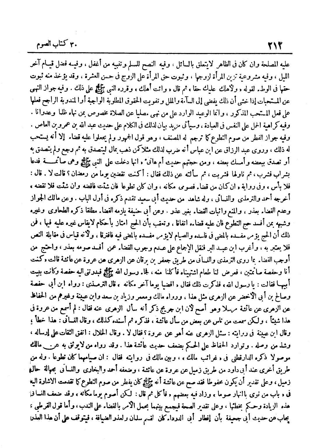 عَلَيْهِ الْمَصْلَحَةُ وَإِنْ كَانَ فِي الظَّاهِرِ لَا يَتَعَلَّقُ بِالسَّائِلِ وَفِيهِ النُّصْحُ لِلْمُسْلِمِ وَتَنْبِيهُ مَنْ أَغْفَلَ وَفِيهِ فَضْلُ قِيَامِ آخِرِ اللَّيْلِ وَفِيهِ مَشْرُوعِيَّةُ تَزَيُّنِ الْمَرْأَةِ لِزَوْجِهَا وَثُبُوتُ حَقِّ الْمَرْأَةِ عَلَى الزَّوْجِ فِي حُسْنِ الْعِشْرَةِ وَقَدْ يُؤْخَذُ مِنْهُ ثُبُوتُ حَقِّهَا فِي الْوَطْءِ لِقَوْلِهِ وَلِأَهْلِكَ عَلَيْكَ حَقًّا ثُمَّ قَالَ وَائْتِ أَهْلَكَ وَقَرَّرَهُ النَّبِيِّ صَلَّى اللَّهُ عَلَيْهِ وَسَلَّمَ عَلَى ذَلِكَ وَفِيهِ جَوَازُ النَّهْيِ عَنِ الْمُسْتَحَبَّاتِ إِذَا خَشِيَ أَنَّ ذَلِكَ يُفْضِي إِلَى السَّآمَةِ وَالْمَلَلِ وَتَفْوِيتِ الْحُقُوقِ الْمَطْلُوبَةِ الْوَاجِبَةِ أَوِ الْمَنْدُوبَةِ الرَّاجِحِ فِعْلُهَا عَلَى فِعْلِ الْمُسْتَحَبِّ الْمَذْكُورِ وَإِنَّمَا الْوَعِيدُ الْوَارِدُ عَلَى مِنْ نَهَى مُصَلِّيًا عَنِ الصَّلَاةِ مَخْصُوصٌ بِمَنْ نَهَاهُ ظُلْمًا وَعُدْوَانًا وَفِيهِ كَرَاهِيَةُ الْحَمْلِ عَلَى النَّفْسِ فِي الْعِبَادَةِ وَسَيَأْتِي مَزِيدُ بَيَانٍ لِذَلِكَ فِي الْكَلَامِ عَلَى حَدِيثِ عَبْدِ اللَّهِ بْنِ عَمْرِو بْنِ الْعَاصِ وَفِيهِ جَوَازُ الْفِطْرِ مِنْ صَوْمِ التَّطَوُّعِ كَمَا تَرْجَمَ لَهُ الْمُصَنِّفُ وَهُوَ قَوْلُ الْجُمْهُورِ وَلَمْ يَجْعَلُوا عَلَيْهِ قَضَاءً إِلَّا أَنَّهُ يُسْتَحَبُّ لَهُ ذَلِكَ وَرَوَى عَبْدُ الرَّزَّاق عَن بن عَبَّاسٍ أَنَّهُ ضَرَبَ لِذَلِكَ مَثَلًا كَمَنْ ذَهَبَ بِمَالٍ لِيَتَصَدَّقَ بِهِ ثُمَّ رَجَعَ وَلَمْ يَتَصَدَّقْ بِهِ أَوْ تَصَدَّقَ بِبَعْضِهِ وَأَمْسَكَ بَعْضَهُ وَمِنْ حُجَّتِهِمْ حَدِيثُ أُمِّ هَانِئٍ أَنَّهَا دَخَلَتْ عَلَى النَّبِيِّ صَلَّى اللَّهُ عَلَيْهِ وَسَلَّمَ وَهِيَ صَائِمَةٌ فَدَعَا بِشَرَابٍ فَشَرِبَ ثُمَّ نَاوَلَهَا فَشَرِبَتْ ثُمَّ سَأَلَتْهُ عَنْ ذَلِكَ فَقَالَ أَكُنْتِ تَقْضِينَ يَوْمًا مِنْ رَمَضَانَ قَالَتْ لَا قَالَ فَلَا بَأْسَ وَفِي رِوَايَةٍ إِنْ كَانَ مِنْ قَضَاءٍ فَصَوْمِي مَكَانَهُ وَإِنْ كَانَ تَطَوُّعًا فَإِنْ شِئْتِ فَاقْضِهِ وَإِنْ شِئْتِ فَلَا تَقْضِهِ أَخْرَجَهُ أَحْمَدُ وَالتِّرْمِذِيّ وَالنَّسَائِيُّ وَلَهُ شَاهِدٌ مِنْ حَدِيثِ أَبِي سَعِيدٍ تَقَدَّمَ ذِكْرُهُ فِي أَوَّلِ الْبَابِ وَعَنْ مَالِكٍ الْجَوَازُ وَعَدَمُ الْقَضَاءِ بِعُذْرٍ وَالْمَنْعُ وَإِثْبَاتُ الْقَضَاءِ بِغَيْرِ عُذْرٍ وَعَنْ أَبِي حَنِيفَةَ يَلْزَمُهُ الْقَضَاءُ مُطلقًا ذكره الطَّحَاوِيّ وَغَيره وَشبهه بِمن أفسد حج التَّطَوُّع فَإِن عَلَيْهِ قَضَاؤُهُ اتِّفَاقًا وَتُعُقِّبَ بِأَنَّ الْحَجَّ امْتَازَ بِأَحْكَامٍ لَا يُقَاسُ غَيْرُهُ عَلَيْهِ فِيهَا فَمِنْ ذَلِكَ أَنَّ الْحَجَّ يُؤْمَرُ مُفْسِدُهُ بِالْمُضِيِّ فِي فَاسِدِهِ وَالصِّيَامُ لَا يُؤْمَرُ مُفْسِدُهُ بِالْمُضِيِّ فِيهِ فَافْتَرَقَا وَلِأَنَّهُ قِيَاسٌ فِي مُقَابَلَةِ النَّصِّ فَلَا يُعْتَبَرُ بِهِ وَأغْرب بن عَبْدِ الْبَرِّ فَنَقَلَ الْإِجْمَاعَ عَلَى عَدَمِ وُجُوبِ الْقَضَاءِ عَمَّنْ أَفْسَدَ صَوْمَهُ بِعُذْرٍ وَاحْتَجَّ مَنْ أَوْجَبَ الْقَضَاءَ بِمَا رَوَى التِّرْمِذِيُّ وَالنَّسَائِيُّ مِنْ طَرِيقِ جَعْفَرِ بْنِ بَرْقَانَ عَنِ الزُّهْرِيِّ عَنْ عُرْوَةَ عَنْ عَائِشَةَ قَالَتْ كُنْتُ أَنَا وَحَفْصَةُ صَائِمَتَيْنِ فَعُرِضَ لَنَا طَعَامٌ اشْتَهَيْنَاهُ فَأَكَلْنَا مِنْهُ فَجَاءَ رَسُولُ اللَّهِ صَلَّى اللَّهُ عَلَيْهِ وَسَلَّمَ فَبَدَرَتْنِي إِلَيْهِ حَفْصَةُ وَكَانَتْ بِبَيْتِ أَبِيهَا فَقَالَتْ يَا رَسُولَ اللَّهِ فَذَكَرَتْ ذَلِكَ فَقَالَ اقْضِيَا يَوْمًا آخر مَكَانَهُ قَالَ التِّرْمِذِيّ رَوَاهُ بن أَبِي حَفْصَةَ وَصَالِحُ بْنُ أَبِي ال