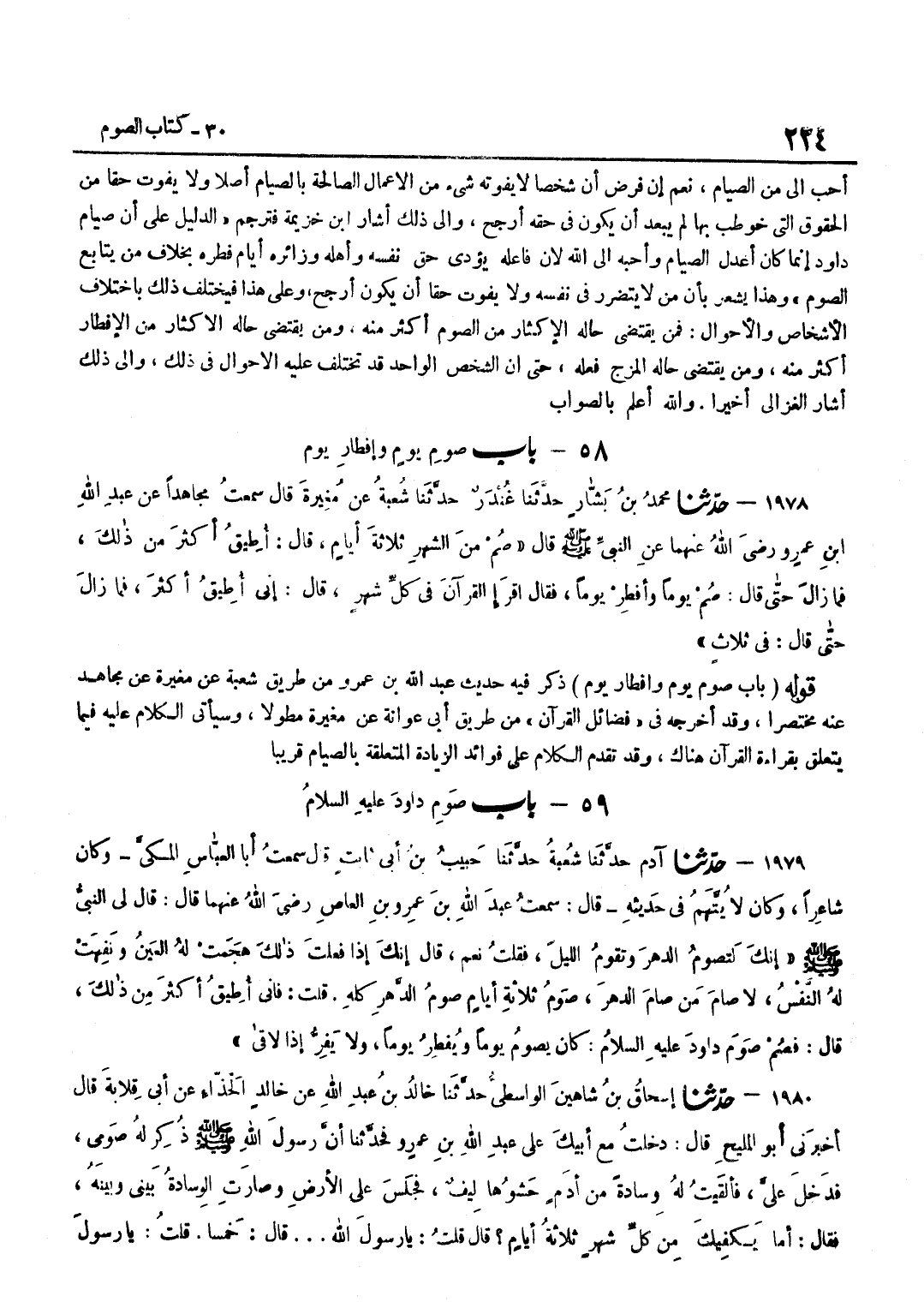 أَحَبُّ إِلَيَّ مِنَ الصِّيَامِ نَعَمْ إِنْ فُرِضَ أَنَّ شَخْصًا لَا يَفُوتُهُ شَيْءٌ مِنَ الْأَعْمَالِ الصَّالِحَةِ بِالصِّيَامِ أَصْلًا وَلَا يُفَوِّتُ حَقًّا مِنَ الْحُقُوقِ الَّتِي خُوطِبَ بِهَا لَمْ يَبْعُدْ أَنْ يَكُونَ فِي حَقِّهِ أَرْجَحَ وَإِلَى ذَلِكَ أَشَارَ بن خُزَيْمَةَ فَتَرْجَمَ الدَّلِيلُ عَلَى أَنَّ صِيَامَ دَاوُدَ إِنَّمَا كَانَ أَعْدَلَ الصِّيَامِ وَأَحَبَّهُ إِلَى اللَّهِ لِأَنَّ فَاعِلَهُ يُؤَدِّي حَقَّ نَفْسِهِ وَأَهْلِهِ وَزَائِرِهِ أَيَّامَ فِطْرِهِ بِخِلَافِ مِنْ يُتَابِعُ الصَّوْمَ وَهَذَا يُشْعِرُ بِأَنَّ مَنْ لَا يَتَضَرَّرُ فِي نَفْسِهِ وَلَا يُفَوِّتُ حَقًّا أَنْ يَكُونَ أَرْجَحَ وَعَلَى هَذَا فَيَخْتَلِفُ ذَلِكَ بِاخْتِلَافِ الْأَشْخَاصِ وَالْأَحْوَالِ فَمَنْ يَقْتَضِي حَالُهُ الْإِكْثَارَ مِنَ الصَّوْمِ أَكْثَرَ مِنْهُ وَمَنْ يَقْتَضِي حَالُهُ الْإِكْثَارَ مِنَ الْإِفْطَارِ أَكْثَرَ مِنْهُ وَمَنْ يَقْتَضِي حَالُهُ الْمَزْجَ فَعَلَهُ حَتَّى إِنَّ الشَّخْصَ الْوَاحِدَ قَدْ تَخْتَلِفُ عَلَيْهِ الْأَحْوَالُ فِي ذَلِكَ وَإِلَى ذَلِكَ أَشَارَ الْغَزَالِيُّ أَخِيرًا وَالله أعلم بِالصَّوَابِ