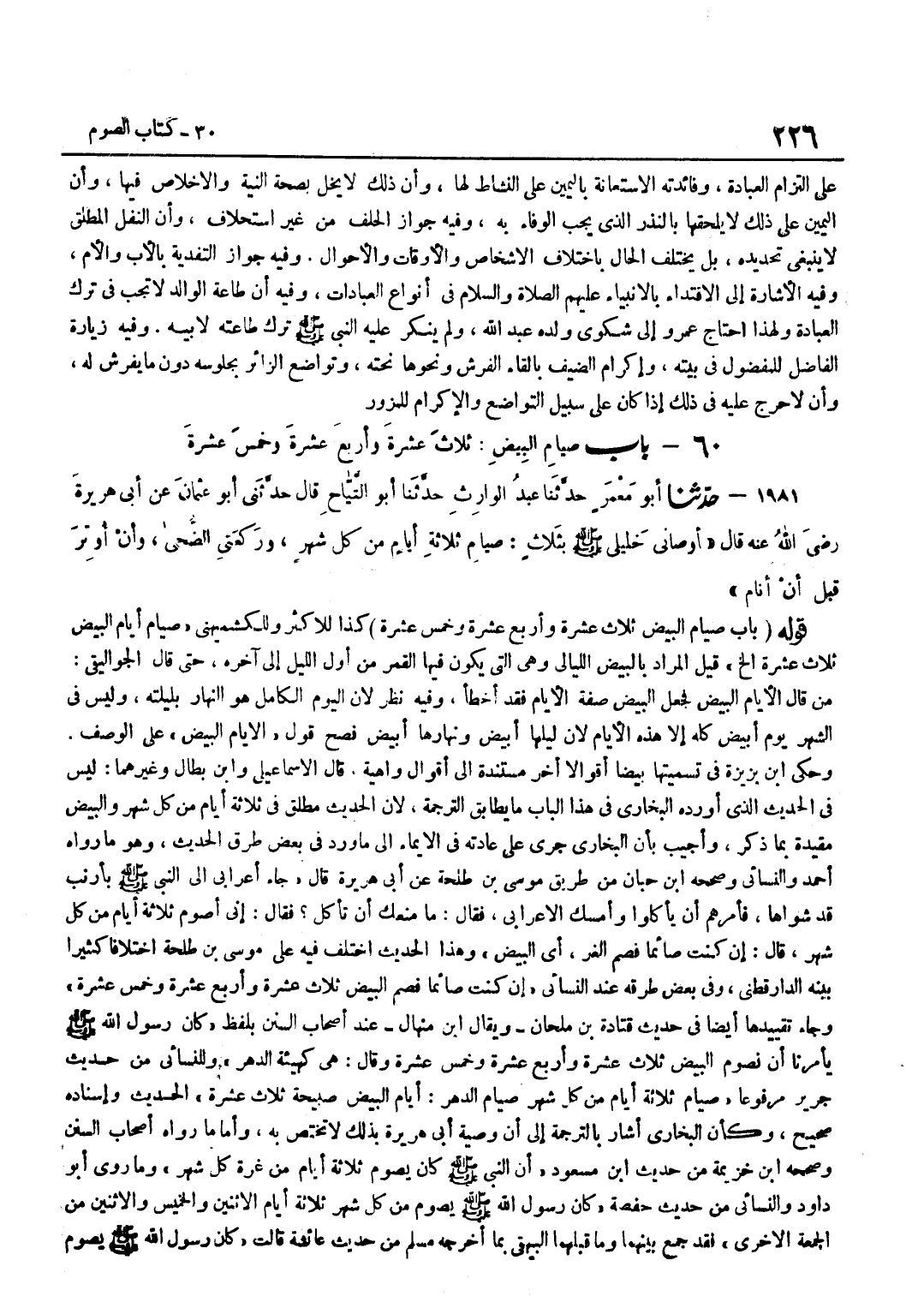 كَذَا لِلْأَكْثَرِ ولِلْكُشْمِيهَنِيِّ صِيَامُ أَيَّامِ الْبِيضِ ثَلَاثَ عَشْرَةَ إِلَخْ قِيلَ الْمُرَادُ بِالْبِيضِ اللَّيَالِي وَهِيَ الَّتِي يَكُونُ فِيهَا الْقَمَرُ مِنْ أَوَّلِ اللَّيْلِ إِلَى آخِرِهِ حَتَّى قَالَ الْجَوَالِيقِيُّ مَنْ قَالَ الْأَيَّامَ الْبِيضَ فَجَعَلَ الْبِيضَ صِفَةَ الْأَيَّامِ فَقَدْ أَخْطَأَ وَفِيهِ نَظَرٌ لِأَنَّ الْيَوْم الْكَامِلَ هُوَ النَّهَارُ بِلَيْلَتِهِ وَلَيْسَ فِي الشَّهْرِ يَوْمٌ أَبْيَضُ كُلُّهُ إِلَّا هَذِهِ الْأَيَّامُ لِأَنَّ لَيْلَهَا أَبْيَضُ وَنَهَارَهَا أَبْيَضُ فَصَحَّ قَوْلُ الْأَيَّامِ الْبيض على الْوَصْف وَحكى بن بَزِيزَةَ فِي تَسْمِيَتِهَا بِيضًا أَقْوَالًا أُخَرَ مُسْتَنِدَةً إِلَى أَقْوَال واهية قَالَ الْإِسْمَاعِيلِيّ وبن بَطَّالٍ وَغَيْرُهُمَا لَيْسَ فِي الْحَدِيثِ الَّذِي أَوْرَدَهُ الْبُخَارِيُّ فِي هَذَا الْبَابِ مَا يُطَابِقُ التَّرْجَمَةَ لِأَنَّ الْحَدِيثَ مُطْلَقٌ فِي ثَلَاثَةِ أَيَّامٍ مِنْ كُلِّ شَهْرٍ وَالْبِيضُ مُقَيَّدَةٌ بِمَا ذُكِرَ وَأُجِيبَ بِأَنَّ الْبُخَارِيَّ جَرَى عَلَى عَادَتِهِ فِي الْإِيمَاءِ إِلَى مَا وَرَدَ فِي بَعْضِ طُرُقِ الْحَدِيثِ وَهُوَ مَا رَوَاهُ أَحْمد وَالنَّسَائِيّ وَصَححهُ بن حِبَّانَ مِنْ طَرِيقِ مُوسَى بْنِ طَلْحَةَ عَنْ أَبِي هُرَيْرَةَ قَالَ جَاءَ أَعْرَابِيٌّ إِلَى النَّبِيِّ صَلَّى اللَّهُ عَلَيْهِ وَسَلَّمَ بِأَرْنَبٍ قَدْ شَوَاهَا فَأَمَرَهُمْ أَنْ يَأْكُلُوا وَأَمْسَكَ الْأَعْرَابِيُّ فَقَالَ مَا مَنَعَكَ أَنْ تَأْكُلَ فَقَالَ إِنِّي أَصُومُ ثَلَاثَةَ أَيَّامٍ مِنْ كُلِّ شَهْرٍ قَالَ إِنْ كُنْتَ صَائِمًا فَصُمِ الْغُرَّ أَيِ الْبِيضَ وَهَذَا الْحَدِيثُ اخْتُلِفَ فِيهِ عَلَى مُوسَى بْنِ طَلْحَةَ اخْتِلَافًا كَثِيرًا بَيَّنَهُ الدَّارَقُطْنِيُّ وَفِي بَعْضِ طُرُقِهِ عِنْدَ النَّسَائِيِّ إِنْ كُنْتَ صَائِمًا فَصُمِ الْبِيضَ ثَلَاثَ عَشْرَةَ وَأَرْبَعَ عَشْرَةَ وَخَمْسَ عَشْرَةَ وَجَاءَ تَقْيِيدُهَا أَيْضًا فِي حَدِيثِ قَتَادَةَ بْنِ مِلْحَانَ وَيُقَالُ بن مِنْهَالٍ عِنْدَ أَصْحَابِ السُّنَنِ بِلَفْظِ كَانَ رَسُولُ اللَّهِ صَلَّى اللَّهُ عَلَيْهِ وَسَلَّمَ يَأْمُرُنَا أَنْ نَصُومَ الْبِيضَ ثَلَاثَ عَشْرَةَ وَأَرْبَعَ عَشْرَةَ وَخَمْسَ عَشْرَةَ وَقَالَ هِيَ كَهَيْئَةِ الدَّهْرِ وَلِلنَّسَائِيِّ مِنْ حَدِيثِ جَرِيرٍ مَرْفُوعًا صِيَامُ ثَلَاثَةِ أَيَّامٍ مِنْ كُلِّ شَهْرٍ صِيَامُ الدَّهْرِ أَيَّامُ الْبِيضِ صَبِيحَةَ ثَلَاثَ عَشْرَةَ الْحَدِيثَ وَإِسْنَادُهُ صَحِيحٌ وَكَأَنَّ الْبُخَارِيَّ أَشَارَ بِالتَّرْجَمَةِ إِلَى أَنَّ وَصِيَّةَ أَبِي هُرَيْرَةَ بذلك لَا تخْتَص بِهِ وأماما رَوَاهُ أَصْحَاب السّنَن وَصَححهُ بن خُزَيْمَة من حَدِيث بن مَسْعُودٍ أَنَّ النَّبِيَّ صَلَّى اللَّهُ عَلَيْهِ وَسَلَّمَ كَانَ يَصُومُ ثَلَاثَةَ أَيَّامٍ مِنْ غُرَّةَ كُلِّ شَهْرٍ وَمَا رَوَى أَبُو دَاوُدَ وَالنَّسَائِيُّ مِنْ حَدِيثِ حَفْصَةَ كَانَ رَسُولُ اللَّهِ صَلَّى اللَّهُ عَلَيْهِ وَسَلَّمَ يَصُومُ مِنْ كُلِّ شَهْرٍ ثَلَاثَةَ أَيَّامٍ الِاثْنَيْنِ وَالْخَمِيسَ وَالِاثْنَيْنِ مِنَ الْجُمُعَةِ الْأُخْرَى فَقَدْ جَمَعَ بَيْنَهُمَا وَمَا قَبْلَهُمَا الْبَيْهَقِيُّ بِمَا أَخْرَجَهُ مُسْلِمٌ مِنْ حَدِيثِ عَائِشَةَ قَالَتْ كَانَ رَسُولُ اللَّهِ صَلَّى اللَّهُ عَلَيْهِ وَسَلَّمَ يَصُوم