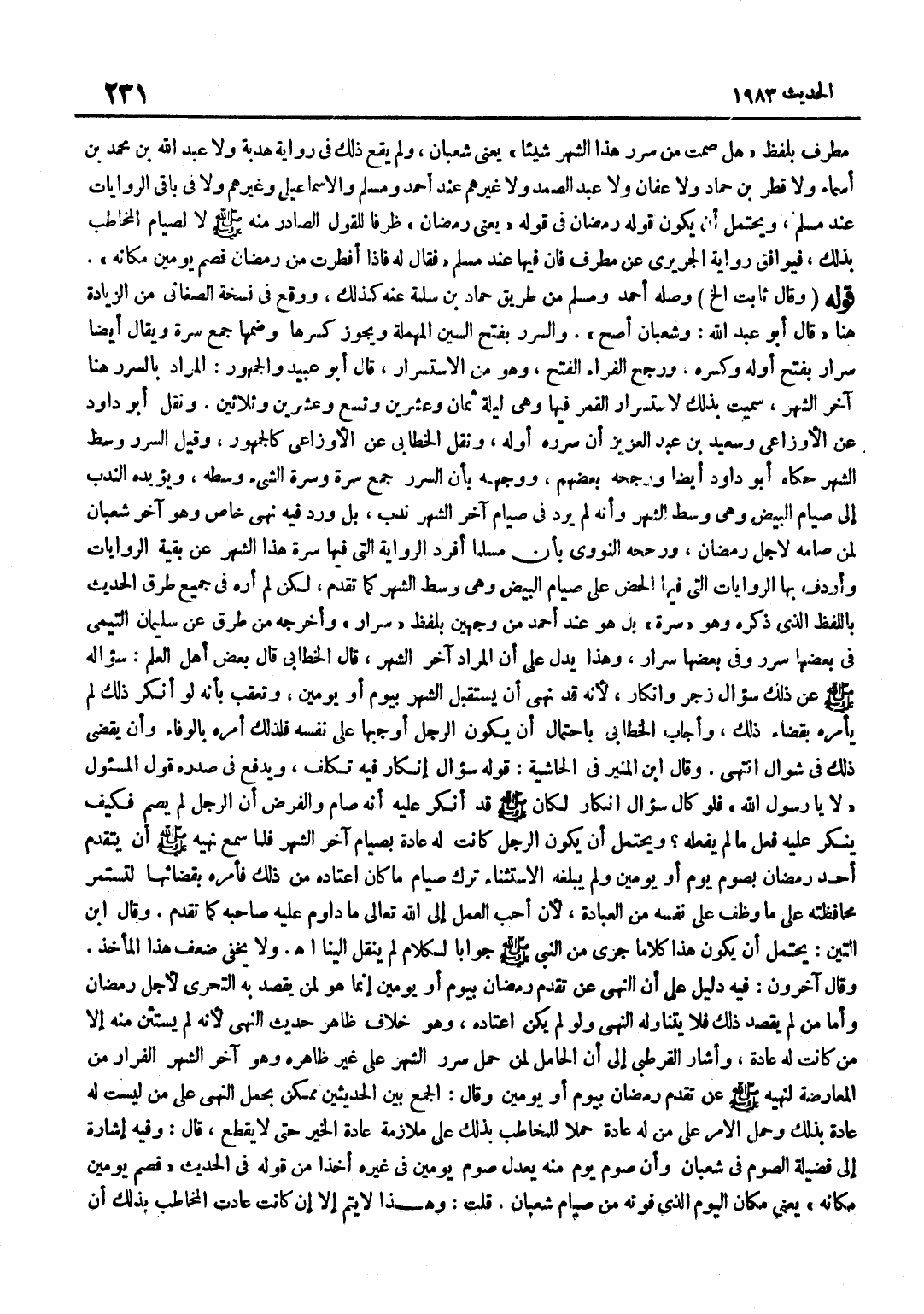 مُطَرِّفٍ بِلَفْظِ هَلْ صُمْتَ مِنْ سُرَرِ هَذَا الشَّهْرِ شَيْئًا يَعْنِي شَعْبَانَ وَلَمْ يَقَعْ ذَلِكَ فِي رِوَايَةِ هُدْبَةَ وَلَا عَبْدِ اللَّهِ بْنِ مُحَمَّدِ بْنِ أَسْمَاءَ وَلَا قُطْرِ بْنِ حَمَّادٍ وَلَا عَفَّانَ وَلَا عَبْدِ الصَّمَدِ وَلَا غَيْرِهِمْ عِنْدَ أَحْمَدَ وَمُسْلِمٍ وَالْإِسْمَاعِيلِيِّ وَغَيْرِهِمْ وَلَا فِي بَاقِي الرِّوَايَاتِ عِنْدَ مُسْلِمٍ وَيُحْتَمَلُ أَنْ يَكُونَ قَوْلُهُ رَمَضَانَ فِي قَوْلِهِ يَعْنِي رَمَضَانَ ظَرْفًا لِلْقَوْلِ الصَّادِرِ مِنْهُ صَلَّى اللَّهُ عَلَيْهِ وَسَلَّمَ لَا لِصِيَامِ الْمُخَاطَبِ بِذَلِكَ فَيُوَافِقُ رِوَايَةَ الْجُرَيْرِيِّ عَنْ مُطَرِّفٍ فَإِنَّ فِيهَا عِنْدَ مُسْلِمٍ فَقَالَ لَهُ فَإِذَا أَفْطَرْتَ مِنْ رَمَضَانَ فَصُمْ يَوْمَيْنِ مَكَانَهُ قَوْلُهُ وَقَالَ ثَابِتٌ إِلَخْ وَصَلَهُ أَحْمَدُ وَمُسْلِمٌ مِنْ طَرِيقِ حَمَّادِ بْنِ سَلَمَةَ عَنْهُ كَذَلِكَ وَوَقَعَ فِي نُسْخَةِ الصَّغَانِيِّ مِنَ الزِّيَادَةِ هُنَا قَالَ أَبُو عَبْدِ اللَّهِ وَشَعْبَانُ أَصَحُّ والسرر بِفَتْحِ السِّينِ الْمُهْمَلَةِ وَيَجُوزُ كَسْرُهَا وَضَمُّهَا جَمْعُ سُرَّةٍ وَيُقَالُ أَيْضًا سَرَارٌ بِفَتْحِ أَوَّلِهِ وَكَسْرِهِ وَرَجَّحَ الْفَرَّاءُ الْفَتْحَ وَهُوَ مِنَ الِاسْتِسْرَارِ قَالَ أَبُو عُبَيْدٍ وَالْجُمْهُورُ الْمُرَادُ بِالسُّرَرِ هُنَا آخِرُ الشَّهْرِ سُمِّيَتْ بِذَلِكَ لِاسْتِسْرَارِ الْقَمَرِ فِيهَا وَهِيَ لَيْلَةُ ثَمَانٍ وَعِشْرِينَ وَتِسْعٍ وَعِشْرِينَ وَثَلَاثِينَ وَنَقَلَ أَبُو دَاوُدَ عَنِ الْأَوْزَاعِيِّ وَسَعِيدِ بْنِ عَبْدِ الْعَزِيزِ أَنَّ سُرَرُهُ أَوَّلُهُ وَنَقَلَ الْخَطَّابِيُّ عَنِ الْأَوْزَاعِيِّ كَالْجُمْهُورِ وَقِيلَ السُّرَرُ وَسَطُ الشَّهْرِ حَكَاهُ أَبُو دَاوُدَ أَيْضًا وَرَجَّحَهُ بَعْضُهُمْ وَوَجَّهَهُ بِأَنَّ السُّرَرَ جَمْعُ سُرَّةٍ وَسُرَّةُ الشَّيْءِ وَسَطُهُ وَيُؤَيِّدُهُ النَّدْبُ إِلَى صِيَامِ الْبِيضِ وَهِيَ وَسَطُ الشَّهْرِ وَأَنَّهُ لَمْ يَرِدْ فِي صِيَامِ آخِرِ الشَّهْرِ نَدْبٌ بَلْ وَرَدَ فِيهِ نَهْيٌ خَاصٌّ وَهُوَ آخِرُ شَعْبَانَ لِمَنْ صَامَهُ لِأَجْلِ رَمَضَانَ وَرَجَّحَهُ النَّوَوِيُّ بِأَنَّ مُسْلِمًا أَفْرَدَ الرِّوَايَةَ الَّتِي فِيهَا سُرَّةُ هَذَا الشَّهْرِ عَنْ بَقِيَّةِ الرِّوَايَاتِ وَأَرْدَفَ بِهَا الرِّوَايَاتِ الَّتِي فِيهَا الْحَضُّ عَلَى صِيَامِ الْبِيضِ وَهِيَ وَسَطُ الشَّهْرِ كَمَا تَقَدَّمَ لَكِنْ لَمْ أَرَهُ فِي جَمِيعِ طُرُقِ الْحَدِيثِ بِاللَّفْظِ الَّذِي ذَكَرَهُ وَهُوَ سُرَّةٌ بَلْ هُوَ عِنْدَ أَحْمَدَ مِنْ وَجْهَيْنِ بِلَفْظِ سِرَارٍ وَأَخْرَجَهُ مِنْ طُرُقٍ عَنْ سُلَيْمَانَ التَّيْمِيِّ فِي بَعْضِهَا سُرَرٌ وَفِي بَعْضِهَا سِرَارٌ وَهَذَا يَدُلُّ عَلَى أَنَّ الْمُرَادَ آخِرُ الشَّهْرِ قَالَ الْخَطَّابِيُّ قَالَ بَعْضُ أَهْلِ الْعِلْمِ سُؤَالُهُ صَلَّى اللَّهُ عَلَيْهِ وَسَلَّمَ عَنْ ذَلِكَ سُؤَالُ زَجْرٍ وَإِنْكَارٍ لِأَنَّهُ قَدْ نَهَى أَنْ يُسْتَقْبَلَ الشَّهْرُ بِيَوْمٍ أَوْ يَوْمَيْنِ وَتُعُقِّبَ بِأَنَّهُ لَوْ أَنْكَرَ ذَلِكَ لَمْ يَأْمُرْهُ بِقَضَاءِ ذَلِكَ وَأَجَابَ الْخَطَّابِيُّ بِاحْتِمَالِ أَنْ يَكُونَ الرَّجُلُ أَوْجَبَهَا عَلَى نَفْسِهِ فَلِذَلِكَ أَمَرَهُ بِالْوَفَاءِ وَأَنْ يَقْضِي ذَلِكَ فِي شَوَّالٍ انْتَهَى وَقَالَ بن الْمُنِيرِ فِي الْحَاشِيَةِ قَوْلُهُ سُؤَالُ إِنْكَارٍ فِيهِ تَكَلُّفٌ وَيَدْفَعُ فِي صَدْرِهِ قَوْلُ الْمَسْئُولِ لَا يَا رَسُولَ اللَّهِ فَلَوْ كَانَ سُؤَالَ إِنْكَارٍ لَكَانَ صَلَّى اللَّهُ عَلَيْهِ وَسَلَّمَ قَدْ أَنْكَرَ عَلَيْهِ أَنَّهُ صَامَ والْفَرْضُ أَنَّ الرَّجُلَ لَمْ يَصُمْ فَكَيْ