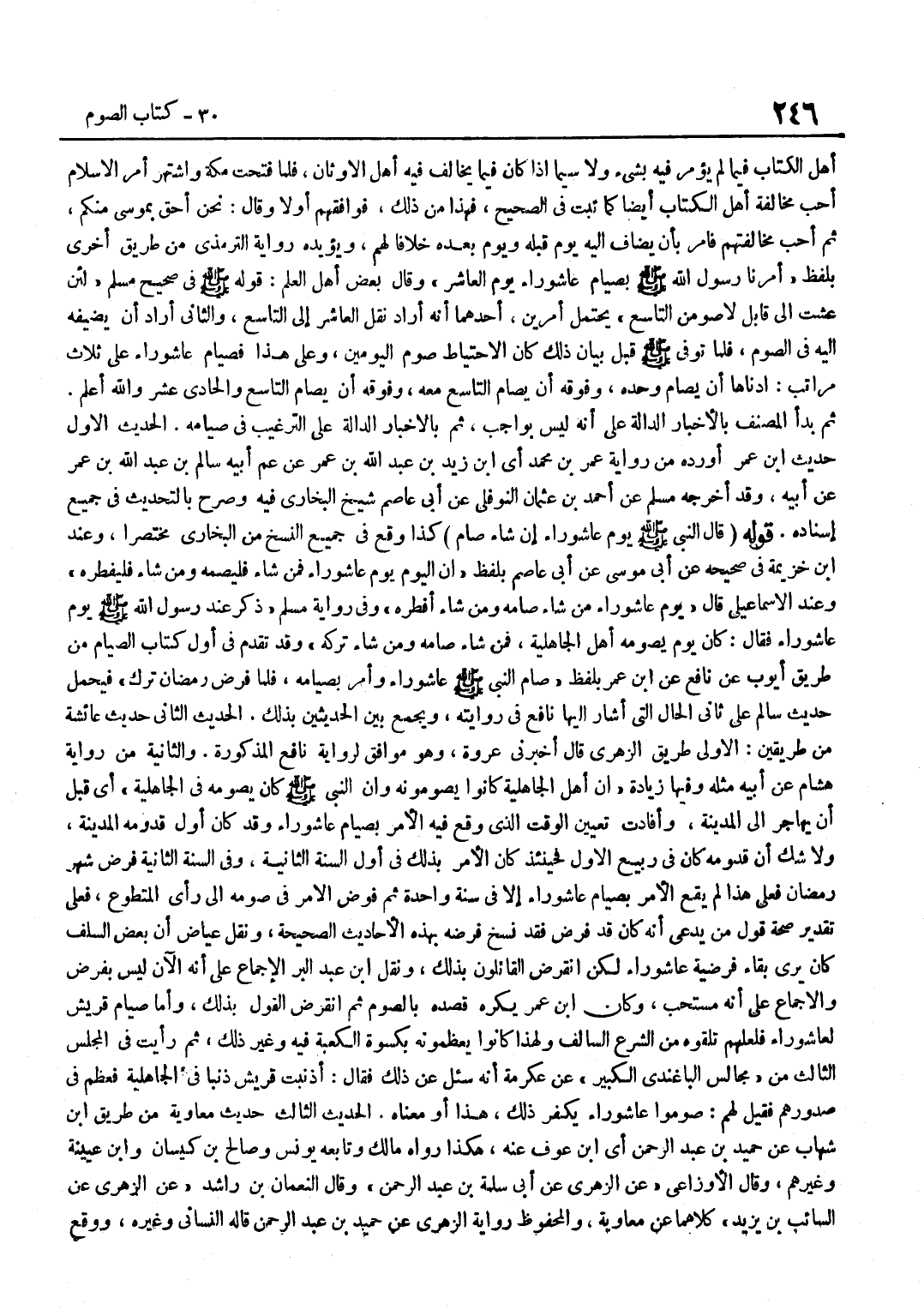 أَهْلِ الْكِتَابِ فِيمَا لَمْ يُؤْمَرْ فِيهِ بِشَيْءِ وَلَا سِيَّمَا إِذَا كَانَ فِيمَا يُخَالِفُ فِيهِ أَهْلَ الْأَوْثَانِ فَلَمَّا فُتِحَتْ مَكَّةُ وَاشْتُهِرَ أَمْرُ الْإِسْلَامِ أَحَبَّ مُخَالَفَةَ أَهْلِ الْكِتَابِ أَيْضًا كَمَا ثَبَتَ فِي الصَّحِيحِ فَهَذَا مِنْ ذَلِكَ فَوَافَقَهُمْ أَو لَا وَقَالَ نَحْنُ أَحَقُّ بِمُوسَى مِنْكُمْ ثُمَّ أَحَبَّ مُخَالَفَتَهُمْ فَأَمَرَ بِأَنْ يُضَافَ إِلَيْهِ يَوْمٌ قَبْلَهُ وَيَوْمٌ بَعْدَهُ خِلَافًا لَهُمْ وَيُؤَيِّدُهُ رِوَايَةُ التِّرْمِذِيِّ مِنْ طَرِيقٍ أُخْرَى بِلَفْظِ أَمَرَنَا رَسُولُ اللَّهِ صَلَّى اللَّهُ عَلَيْهِ وَسَلَّمَ بِصِيَامِ عَاشُورَاءَ يَوْمَ الْعَاشِرِ وَقَالَ بَعْضُ أَهْلِ الْعِلْمِ قَوْلُهُ صَلَّى اللَّهُ عَلَيْهِ وَسَلَّمَ فِي صَحِيحِ مُسْلِمٍ لَئِنْ عِشْتُ إِلَى قَابِلٍ لَأَصُومَنَّ التَّاسِعَ يَحْتَمِلُ أَمْرَيْنِ أَحَدُهُمَا أَنَّهُ أَرَادَ نَقْلَ الْعَاشِرِ إِلَى التَّاسِعِ وَالثَّانِي أَرَادَ أَنْ يُضِيفَهُ إِلَيْهِ فِي الصَّوْمِ فَلَمَّا تُوُفِّيَ صَلَّى اللَّهُ عَلَيْهِ وَسَلَّمَ قَبْلَ بَيَانِ ذَلِكَ كَانَ الِاحْتِيَاطُ صَوْمَ الْيَوْمَيْنِ وَعَلَى هَذَا فَصِيَامُ عَاشُورَاءَ عَلَى ثَلَاثِ مَرَاتِبَ أَدْنَاهَا أَنْ يُصَامَ وَحْدَهُ وَفَوْقَهُ أَنْ يُصَامَ التَّاسِعُ مَعَهُ وَفَوْقَهُ أَنْ يُصَامَ التَّاسِعُ وَالْحَادِي عَشَرَ وَاللَّهُ أَعْلَمُ ثُمَّ بَدَأَ الْمُصَنِّفُ بِالْأَخْبَارِ الدَّالَّةِ عَلَى أَنَّهُ لَيْسَ بِوَاجِبٍ ثُمَّ بِالْأَخْبَارِ الدَّالَّةِ عَلَى التَّرْغِيبِ فِي صِيَامِهِ الْحَدِيثُ الْأَوَّلُ حَدِيثُ بن عُمَرَ أَوْرَدَهُ مِنْ رِوَايَةِ عُمَرَ بْنِ مُحَمَّدٍ أَي بْنَ زَيْدِ بْنِ عَبْدِ اللَّهِ بْنِ عُمَرَ عَنْ عَمِّ أَبِيهِ سَالِمِ بْنِ عَبْدِ اللَّهِ بْنِ عُمَرَ عَنْ أَبِيهِ وَقَدْ أَخْرَجَهُ مُسْلِمٌ عَنْ أَحْمَدَ بْنِ عُثْمَانَ النَّوْفَلِيِّ عَنْ أَبِي عَاصِمٍ شَيْخِ الْبُخَارِيِّ فِيهِ وَصَرَّحَ بِالتَّحْدِيثِ فِي جَمِيعِ إِسْنَادِهِ