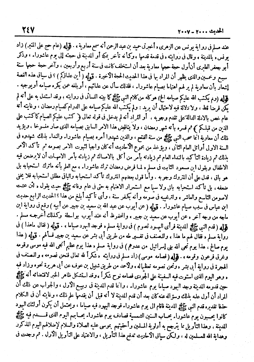 [2003] قَوْلُهُ عَامَ حَجَّ عَلَى الْمِنْبَرِ زَادَ يُونُس بِالْمَدِينَةِ وَقَالَ فِي رِوَايَته فِي قَدْمَةٍ قَدِمَهَا وَكَأَنَّهُ تَأَخَّرَ بِمَكَّةَ أَوِ الْمَدِينَةِ فِي حَجَّتِهِ إِلَى يَوْمِ عَاشُورَاءَ وَذَكَرَ أَبُو جَعْفَرٍ الطَّبَرِيُّ أَنَّ أَوَّلَ حَجَّةٍ حَجَّهَا مُعَاوِيَةُ بَعْدَ أَنِ اسْتُخْلِفَ كَانَتْ فِي سَنَةِ أَرْبَعٍ وَأَرْبَعِينَ وَآخِرَ حَجَّةٍ حَجَّهَا سَنَةَ سَبْعٍ وَخَمْسِينَ وَالَّذِي يَظْهَرُ أَنَّ الْمُرَادَ بِهَا فِي هَذَا الْحَدِيثِ الْحَجَّةُ الْأَخِيرَةُ قَوْلُهُ أَيْنَ عُلَمَاؤُكُمْ فِي سِيَاقِ هَذِهِ الْقِصَّةِ إِشْعَارٌ بِأَنَّ مُعَاوِيَةَ لَمْ يَرَ لَهُمُ اهْتِمَامًا بِصِيَامِ عَاشُورَاءَ فَلِذَلِكَ سَأَلَ عَنْ عُلَمَائِهِمْ أَوْ بَلَغَهُ عَمَّنْ يَكْرَهُ صِيَامَهُ أَوْ يُوجِبُهُ قَوْلُهُ وَلَمْ يَكْتُبِ اللَّهُ عَلَيْكُمْ صِيَامَهُ إِلَخْ هُوَ كُلُّهُ مِنْ كَلَامِ النَّبِيِّ صَلَّى اللَّهُ عَلَيْهِ وَسَلَّمَ كَمَا بَيَّنَهُ النَّسَائِيُّ فِي رِوَايَتِهِ وَقَدِ اسْتُدِلَّ بِهِ عَلَى أَنَّهُ لَمْ يَكُنْ فَرْضًا قَطُّ وَلَا دَلَالَةَ فِيهِ لِاحْتِمَالِ أَنْ يُرِيدَ وَلَمْ يَكْتُبِ اللَّهُ عَلَيْكُمْ صِيَامَهُ عَلَى الدَّوَامِ كَصِيَامِ رَمَضَانَ وَغَايَتُهُ أَنَّهُ عَامٌّ خُصَّ بِالْأَدِلَّةِ الدَّالَّةِ عَلَى تَقَدُّمِ وُجُوبِهِ أَوِ الْمُرَادُ أَنَّهُ لَمْ يَدْخُلْ فِي قَوْلِهِ تَعَالَى كُتِبَ عَلَيْكُمُ الصِّيَامُ كَمَا كُتِبَ عَلَى الَّذِينَ من قبلكُمْ ثُمَّ فَسَّرَهُ بِأَنَّهُ شَهْرُ رَمَضَانَ وَلَا يُنَاقِضُ هَذَا الْأَمْرُ السَّابِقُ بِصِيَامِهِ الَّذِي صَارَ مَنْسُوخًا وَيُؤَيِّدُ ذَلِكَ أَنَّ مُعَاوِيَةَ إِنَّمَا صَحِبَ النَّبِيَّ صَلَّى اللَّهُ عَلَيْهِ وَسَلَّمَ مِنْ سَنَةِ الْفَتْحِ وَالَّذِينَ شَهِدُوا أَمْرَهُ بِصِيَامِ عَاشُورَاءَ وَالنِّدَاءَ بِذَلِكَ شَهِدُوهُ فِي السَّنَةِ الْأُولَى أَوَائِلَ الْعَامِ الثَّانِي وَيُؤْخَذُ مِنْ مَجْمُوعِ الْأَحَادِيثِ أَنَّهُ كَانَ وَاجِبًا لِثُبُوتِ الْأَمْرِ بِصَوْمِهِ ثُمَّ تَأَكَّدَ الْأَمْرُ بِذَلِكَ ثُمَّ زِيَادَةُ التَّأْكِيدِ بِالنِّدَاءِ الْعَامِّ ثُمَّ زِيَادَتُهُ بِأَمْرِ مَنْ أَكَلَ بِالْإِمْسَاكِ ثُمَّ زِيَادَتُهُ بِأَمْرِ الْأُمَّهَاتِ أَنْ لَا يُرْضِعْنَ فِيهِ الْأَطْفَالَ وَبِقَوْلِ بن مَسْعُودٍ الثَّابِتِ فِي مُسْلِمٍ لَمَّا فُرِضَ رَمَضَانُ تُرِكَ عَاشُورَاءُ مَعَ الْعِلْمِ بِأَنَّهُ مَا تُرِكَ اسْتِحْبَابُهُ بَلْ هُوَ بَاقٍ فَدَلَّ عَلَى أَنَّ الْمَتْرُوكَ وُجُوبُهُ وَأَمَّا قَوْلُ بَعْضِهِمُ الْمَتْرُوكُ تَأَكُّدُ اسْتِحْبَابِهِ وَالْبَاقِي مُطْلَقُ اسْتِحْبَابِهِ فَلَا يَخْفَى ضَعْفُهُ بل تاكد اسْتِحْبَابه بَاقٍ وَلَا سِيمَا مَعَ اسْتِمْرَارُ الِاهْتِمَامِ بِهِ حَتَّى فِي عَامِ وَفَاتِهِ صَلَّى اللَّهُ عَلَيْهِ وَسَلَّمَ حَيْثُ يَقُولُ لَئِنْ عِشْت لأ صومن التَّاسِعَ وَالْعَاشِرَ وَلِتَرْغِيبِهِ فِي صَوْمِهِ وَأَنَّهُ يُكَفِّرُ سَنَةً وَأَيُّ تَأْكِيدٍ أَبْلَغُ مِنْ هَذَا الْحَدِيثُ الرَّابِع حَدِيث بن عَبَّاسٍ فِي سَبَبِ صِيَامِ عَاشُورَاءَ