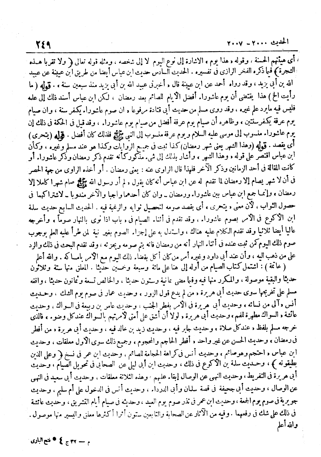 [2006] قَوْلُهُ مَا رَأَيْتُ إِلَخْ هَذَا يَقْتَضِي أَنَّ يَوْمَ عَاشُورَاءَ أَفْضَلُ الْأَيَّام للصَّائِم بعد رَمَضَان لَكِن بن عَبَّاسٍ أَسْنَدَ ذَلِكَ إِلَى عِلْمِهِ فَلَيْسَ فِيهِ مَا يَرُدُّ عِلْمَ غَيْرِهِ وَقَدْ رَوَى مُسْلِمٌ مِنْ حَدِيثِ أَبِي قَتَادَةَ مَرْفُوعًا إِنَّ صَوْمَ عَاشُورَاءَ يُكَفِّرُ سَنَةً وَإِنَّ صِيَامَ يَوْمِ عَرَفَةَ يُكَفِّرُ سَنَتَيْنِ وَظَاهِرُهُ أَنَّ صِيَامَ يَوْمِ عَرَفَةَ أَفْضَلُ مِنْ صِيَامِ يَوْمِ عَاشُورَاءَ وَقَدْ قِيلَ فِي الْحِكْمَةِ فِي ذَلِكَ إِنَّ يَوْمَ عَاشُورَاءَ مَنْسُوبٌ إِلَى مُوسَى عَلَيْهِ السَّلَامُ وَيَوْمَ عَرَفَةَ مَنْسُوبٌ إِلَى النَّبِيِّ صَلَّى اللَّهُ عَلَيْهِ وَسَلَّمَ فَلِذَلِكَ كَانَ أَفْضَلَ قَوْلُهُ يَتَحَرَّى أَيْ يَقْصِدُ قَوْلُهُ وَهَذَا الشَّهْرُ يَعْنِي شَهْرَ رَمَضَانَ كَذَا ثَبَتَ فِي جَمِيعِ الرِّوَايَاتِ وَكَذَا هُوَ عِنْدَ مُسلم وَغَيره وَكَأن بن عَبَّاسٍ اقْتَصَرَ عَلَى قَوْلِهِ وَهَذَا الشَّهْرُ وَأَشَارَ بِذَلِكَ إِلَى شَيْءٍ مَذْكُورٍ كَأَنَّهُ تَقَدَّمَ ذِكْرُ رَمَضَانَ وَذِكْرُ عَاشُورَاءَ أَوْ كَانَتِ الْمَقَالَةُ فِي أَحَدِ الزَّمَانَيْنِ وَذَكَرَ الْآخَرَ فَلِهَذَا قَالَ الرَّاوِي عَنْهُ يَعْنِي رَمَضَانَ أَوْ أَخَذَهُ الرَّاوِي مِنْ جِهَةِ الْحَصْرِ فِي أَنْ لَا شَهْرَ يُصَامُ الا رَمَضَان لما تقدم لَهُ عَن بن عَبَّاسٍ أَنَّهُ كَانَ يَقُولُ لَمْ أَرَ رَسُولَ اللَّهِ صَلَّى اللَّهُ عَلَيْهِ وَسَلَّمَ صَامَ شَهْرًا كَامِلا الا رَمَضَان وَإِنَّمَا جمع بن عَبَّاسٍ بَيْنَ عَاشُورَاءَ وَرَمَضَانَ وَإِنْ كَانَ أَحَدُهُمَا وَاجِبًا وَالْآخَرُ مَنْدُوبًا لِاشْتِرَاكِهِمَا فِي حُصُولِ الثَّوَابِ لِأَنَّ مَعْنَى يَتَحَرَّى أَيْ يَقْصِدُ صَوْمَهُ لِتَحْصِيلِ ثَوَابِهِ وَالرَّغْبَةِ فِيهِ الْحَدِيثُ السَّابِعُ حَدِيثُ سَلَمَةَ بْنِ الْأَكْوَعِ فِي الْأَمْرِ بِصَوْمِ عَاشُورَاءَ وَقَدْ تَقَدَّمَ فِي أَثْنَاءِ الصِّيَامِ فِي بَابٌ إِذَا نَوَى بِالنَّهَارِ صَوْمًا وَأَخْرَجَهُ عَالِيًا أَيْضًا ثُلَاثِيًّا وَقَدْ تَقَدَّمَ الْكَلَامُ عَلَيْهِ هُنَاكَ وَاسْتَدَلَّ بِهِ عَلَى إِجْزَاءِ الصَّوْمِ بِغَيْرِ نِيَّةٍ لِمَنْ طَرَأَ عَلَيْهِ الْعِلْمُ بِوُجُوبِ صَوْمِ ذَلِكَ الْيَوْمِ كَمَنْ ثَبَتَ عِنْدَهُ فِي أَثْنَاءِ النَّهَارِ أَنَّهُ مِنْ رَمَضَانَ فَإِنَّهُ يُتِمُّ صَوْمَهُ وَيُجْزِئُهُ وَقَدْ تَقَدَّمَ الْبَحْثُ فِي ذَلِكَ وَالرَّدُّ عَلَى مَنْ ذَهَبَ إِلَيْهِ وَأَنَّ عِنْدَ أَبِي دَاوُدَ وَغَيْرِهِ أَمْرَ مَنْ كَانَ أَكَلَ بِقَضَاءِ ذَلِكَ الْيَوْمِ مَعَ الْأَمْرِ بِإِمْسَاكِهِ وَاللَّهُ أَعْلَمُ خَاتِمَةٌ اشْتَمَلَ كِتَابُ الصِّيَامِ مِنْ أَوَّلِهِ إِلَى هُنَا عَلَى مِائَةٍ وَسَبْعَةٍ وَخَمْسِينَ حَدِيثًا الْمُعَلَّقُ مِنْهَا سِتَّةٌ وَثَلَاثُونَ حَدِيثًا وَالْبَقِيَّةُ مَوْصُولَةٌ وَالْمُكَرَّرُ مِنْهَا فِيهِ وَفِيمَا مَضَى ثَمَانِيَةٌ وَسِتُّونَ حَدِيثًا وَالْخَالِصُ تِسْعَةٌ وَثَمَانُونَ حَدِيثًا وَافَقَهُ مُسْلِمٌ عَلَى تَخْرِيجِهَا سِوَى حَدِيثِ أَبِي هُرَيْرَةَ مَنْ لَمْ يَدَعْ قَوْلَ الزُّورِ وَحَدِيثِ عَمَّارٍ فِي صَوْمِ يَوْمِ الشَّكِّ وَحَدِيثِ أَنَسٍ آلَى مِنْ نِسَائِهِ وَحَدِيثِ أَبِي هُرَيْرَةَ فِي الْأَمْرِ بِفِطْرِ الْجُنُبِ وَحَدِيثِ عَامِرِ بْنِ رَبِيعَةَ فِي السِّوَاكِ وَحَدِيثِ عَائِشَةَ السِّوَاكُ مَطْهَرَةٌ لِلْفَمِ وَحَدِيثِ أَبِي هُرَيْرَةَ لَوْلَا أَنْ أَشُقَّ عَلَى أُمَّتِي لَأَمَرْتُهُمْ بِالسِّوَاكِ عِنْدَ كُلِّ وُضُوءٍ فَالَّذِي خَرَّجَهُ مُسْلِمٌ بِلَفْظِ عِنْدَ كُلِّ صَلَاةٍ وَحَدِيثِ جَابِرٍ فِيهِ وَحَدِيثِ زَيْدِ بْنِ خَالِدٍ فِيهِ وَحَ