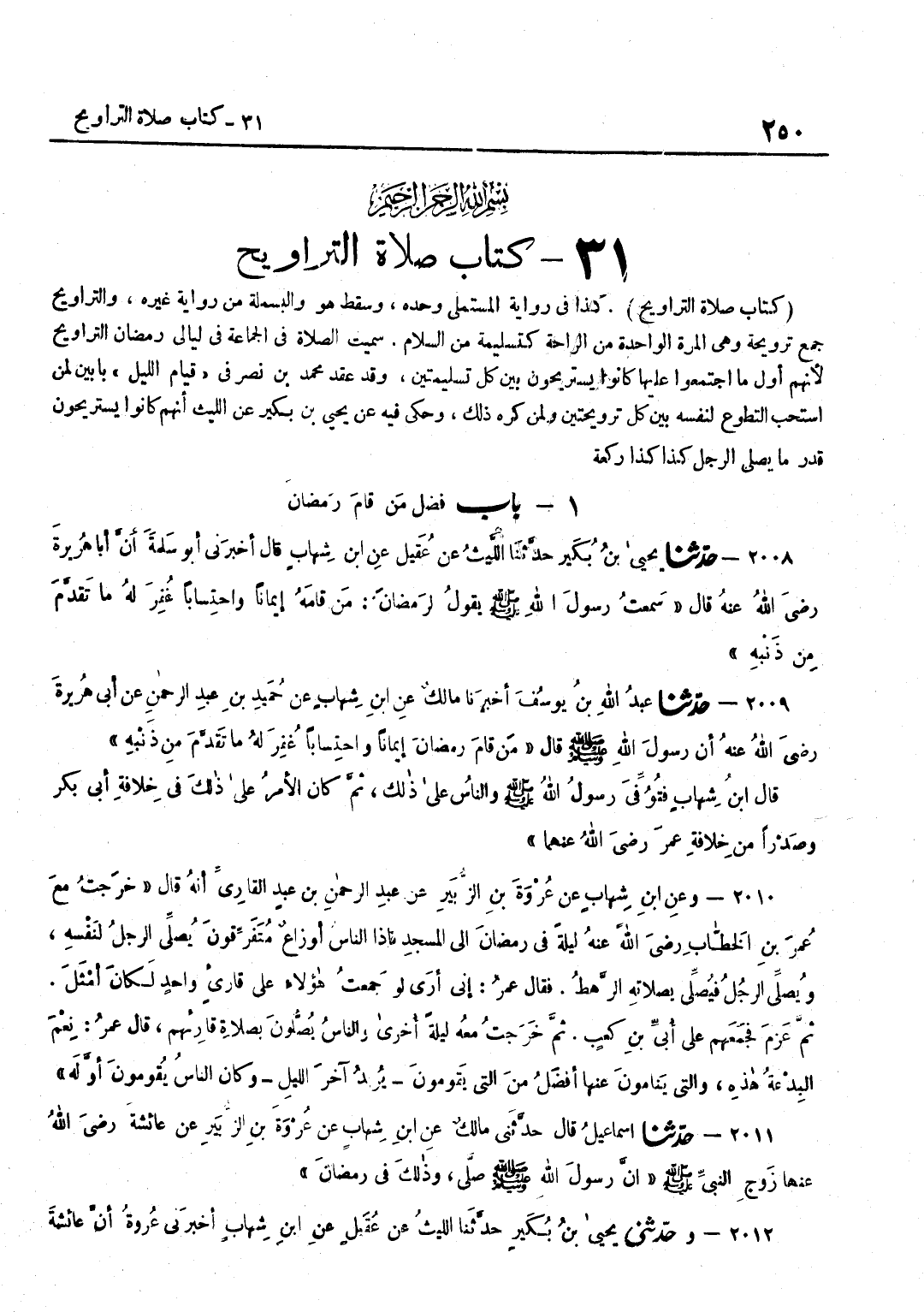 كَذَا فِي رِوَايَةِ الْمُسْتَمْلِي وَحْدَهُ وَسَقَطَ هُوَ وَالْبَسْمَلَةُ مِنْ رِوَايَةِ غَيْرِهِ وَالتَّرَاوِيحُ جَمْعُ تَرْوِيحَةٍ وَهِيَ الْمَرَّةُ الْوَاحِدَةُ مِنَ الرَّاحَةِ كَتَسْلِيمَةٍ مِنَ السَّلَامِ سُمِّيَتِ الصَّلَاةُ فِي الْجَمَاعَةِ فِي لَيَالِي رَمَضَانَ التَّرَاوِيحَ لِأَنَّهُمْ أَوَّلَ مَا اجْتَمَعُوا عَلَيْهَا كَانُوا يَسْتَرِيحُونَ بَيْنَ كُلِّ تَسْلِيمَتَيْنِ وَقَدْ عَقَدَ مُحَمَّدُ بْنُ نَصْرٍ فِي قِيَامِ اللَّيْلِ بَابَيْنِ لِمَنِ اسْتَحَبَّ التَّطَوُّعَ لِنَفْسِهِ بَيْنَ كُلِّ تَرْوِيحَتَيْنِ وَلِمَنْ كَرِهَ ذَلِكَ وَحَكَى فِيهِ عَنْ يَحْيَى بْنِ بُكَيْرٍ عَنِ اللَّيْثِ أَنَّهُمْ كَانُوا يَسْتَرِيحُونَ قَدْرَ مَا يُصَلِّي الرَّجُلُ كَذَا كَذَا رَكْعَة