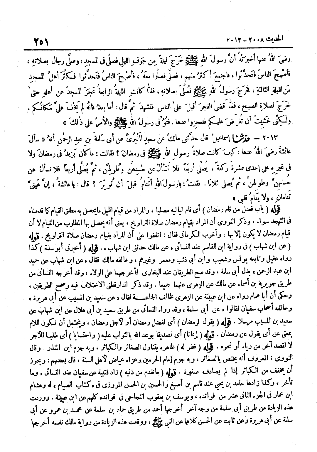 [2008] قَوْله عَن بن شهَاب فِي رِوَايَة بن الْقَاسِم عِنْد النَّسَائِيّ عَن مَالك حَدثنِي بن شِهَابٍ قَوْلُهُ أَخْبَرَنِي أَبُو سَلَمَةَ كَذَا رَوَاهُ عقيل وَتَابعه يُونُس وَشُعَيْب وبن أَبِي ذِئْبٍ وَمَعْمَرٌ وَغَيْرُهُمْ وَخَالَفَهُ مَالِكٌ فَقَالَ عَن بن شِهَابٍ عَنْ حُمَيْدِ بْنِ عَبْدِ الرَّحْمَنِ بَدَلَ أَبِي سَلَمَةَ وَقَدْ صَحَّ الطَّرِيقَانِ عِنْدَ الْبُخَارِيِّ فَأَخْرَجَهُمَا عَلَى الْوِلَاءِ وَقَدْ أَخْرَجَهُ النَّسَائِيُّ مِنْ طَرِيقِ جُوَيْرِيَةَ بْنِ أَسْمَاءَ عَنْ مَالِكٍ عَنِ الزُّهْرِيِّ عَنْهُمَا جَمِيعًا وَقَدْ ذَكَرَ الدَّارَقُطْنِيُّ الِاخْتِلَافَ فِيهِ وَصَحَّحَ الطَّرِيقَيْنِ وَحَكَى أَنَّ أَبَا هَمَّامٍ رَوَاهُ عَن بن عُيَيْنَةَ عَنِ الزُّهْرِيِّ فَخَالَفَ الْجَمَاعَةَ فَقَالَ عَنْ سَعِيدِ بْنِ الْمُسَيَّبِ عَنْ أَبِي هُرَيْرَةَ وَخَالَفَهُ أَصْحَابُ سُفْيَانَ فَقَالُوا عَنْ أَبِي سَلَمَةَ وَقَدْ رَوَاهُ النَّسَائِيُّ مِنْ طَرِيقِ سَعِيدِ بْنِ أَبِي هِلَالٍ عَنْ بن شِهَابٍ عَنْ سَعِيدِ بْنِ الْمُسَيَّبِ مُرْسَلًا قَوْلُهُ يَقُولُ لِرَمَضَانَ أَيْ لِفَضْلِ رَمَضَانَ أَوْ لِأَجْلِ رَمَضَانَ وَيُحْتَمَلُ أَنْ تَكُونَ اللَّامُ بِمَعْنَى عَنْ أَيْ يَقُولُ عَنْ رَمَضَانَ قَوْلُهُ إِيمَانًا أَيْ تَصْدِيقًا بِوَعْدِ اللَّهِ بِالثَّوَابِ عَلَيْهِ وَاحْتِسَابًا أَيْ طَلَبًا لِلْأَجْرِ لَا لِقَصْدٍ آخَرَ مِنْ رِيَاءٍ أَوْ نَحْوِهِ قَوْلُهُ غُفِرَ لَهُ ظَاهِرُهُ يَتَنَاوَلُ الصَّغَائِر والكبائر وَبِه جزم بن الْمُنْذِرِ وَقَالَ النَّوَوِيُّ الْمَعْرُوفُ أَنَّهُ يَخْتَصُّ بِالصَّغَائِرِ وَبِهِ جَزَمَ إِمَامُ الْحَرَمَيْنِ وَعَزَاهُ عِيَاضٌ لِأَهْلِ السُّنَّةِ قَالَ بَعْضُهُمْ وَيَجُوزُ أَنْ يُخَفِّفَ مِنَ الْكَبَائِرِ إِذَا لَمْ يُصَادِفْ صَغِيرَةً قَوْلُهُ مَا تَقَدَّمَ مِنْ ذَنْبِهِ زَادَ قُتَيْبَةُ عَنْ سُفْيَانَ عِنْدَ النَّسَائِيِّ وَمَا تَأَخَّرَ وَكَذَا زَادَهَا حَامِدُ بْنُ يَحْيَى عِنْدَ قَاسِمِ بْنِ أَصْبَغَ وَالْحُسَيْنُ بْنُ الْحَسَنِ الْمَرْوَزِيُّ فِي كِتَابِ الصِّيَامِ لَهُ وَهِشَامُ بْنُ عَمَّارٍ فِي الْجُزْءِ الثَّانِيَ عَشَرَ مِنْ فَوَائِدِهِ وَيُوسُفُ بْنُ يَعْقُوبَ النَّجَاحِيُّ فِي فَوَائده كلهم عَن بن عُيَيْنَةَ وَوَرَدَتْ هَذِهِ الزِّيَادَةُ مِنْ طَرِيقِ أَبِي سَلَمَةَ مِنْ وَجْهٍ آخَرَ أَخْرَجَهَا أَحْمَدُ مِنْ طَرِيقِ حَمَّادِ بْنِ سَلَمَةَ عَنْ مُحَمَّدِ بْنِ عَمْرٍو عَنْ أَبِي سَلَمَةَ عَنْ أَبِي هُرَيْرَةَ وَعَنْ ثَابِتٍ عَنِ الْحَسَنِ كِلَاهُمَا عَنِ النَّبِيِّ صَلَّى اللَّهُ عَلَيْهِ وَسَلَّمَ وَوَقَعَتْ هَذِهِ الزِّيَادَةُ مِنْ رِوَايَةِ مَالِكٍ نَفْسِهِ أَخْرَجَهَا