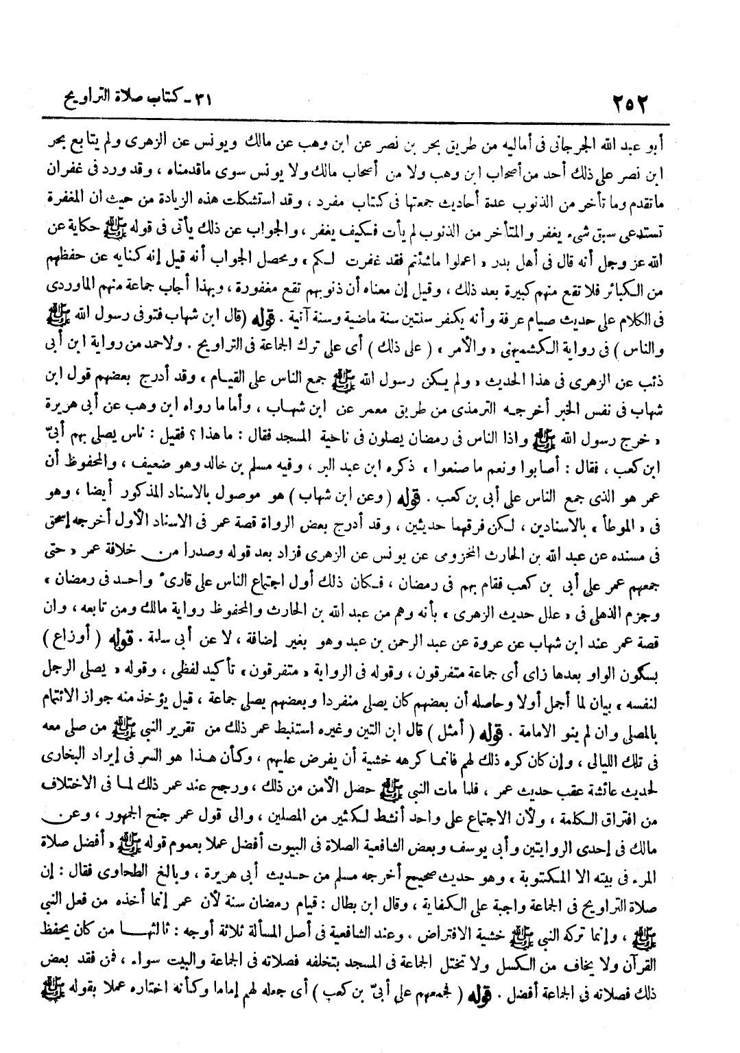 [2009] قَوْله قَالَ بن شِهَابٍ فَتُوُفِّيَ رَسُولُ اللَّهِ صَلَّى اللَّهُ عَلَيْهِ وَسَلَّمَ وَالنَّاسُ فِي رِوَايَةِ الْكُشْمِيهَنِيِّ وَالْأَمْرُ عَلَى ذَلِكَ أَيْ عَلَى تَرْكِ الْجَمَاعَةِ فِي التَّرَاوِيحِ وَلأَحْمَد من رِوَايَة بن أَبِي ذِئْبٍ عَنِ الزُّهْرِيِّ فِي هَذَا الْحَدِيثِ وَلَمْ يَكُنْ رَسُولُ اللَّهِ صَلَّى اللَّهُ عَلَيْهِ وَسَلَّمَ جَمَعَ النَّاسَ عَلَى الْقِيَامِ وَقَدْ أَدْرَجَ بَعضهم قَول بن شِهَابٍ فِي نَفْسِ الْخَبَرِ أَخْرَجَهُ التِّرْمِذِيُّ مِنْ طَرِيق معمر عَن بن شهَاب وَأما مَا رَوَاهُ بن وَهْبٍ عَنْ أَبِي هُرَيْرَةَ خَرَجَ رَسُولُ اللَّهِ صَلَّى اللَّهُ عَلَيْهِ وَسَلَّمَ وَإِذَا النَّاسُ فِي رَمَضَانَ يُصَلُّونَ فِي نَاحِيَةِ الْمَسْجِدِ فَقَالَ مَا هَذَا فَقِيلَ نَاسٌ يُصَلِّي بِهِمْ أُبَيُّ بْنُ كَعْبٍ فَقَالَ أَصَابُوا وَنِعْمَ مَا صَنَعُوا ذَكَرَهُ بن عَبْدِ الْبَرِّ وَفِيهِ مُسْلِمُ بْنُ خَالِدٍ وَهُوَ ضَعِيفٌ وَالْمَحْفُوظُ أَنَّ عُمَرَ هُوَ الَّذِي جَمَعَ النَّاسَ عَلَى أُبَيِّ بْنِ كَعْبٍ قَوْلُهُ وَعَنِ بن شِهَابٍ هُوَ مَوْصُولٌ بِالْإِسْنَادِ الْمَذْكُورِ أَيْضًا وَهُوَ فِي الْمُوَطَّأِ بِالْإِسْنَادَيْنِ لَكِنْ فَرَّقَهُمَا حَدِيثَيْنِ وَقَدْ أَدْرَجَ بَعْضُ الرُّوَاةِ قِصَّةَ عُمَرَ فِي الْإِسْنَادِ الْأَوَّلِ أَخْرَجَهُ إِسْحَاقُ فِي مُسْنَدِهِ عَنْ عَبْدِ اللَّهِ بْنِ الْحَارِثِ الْمَخْزُومِيِّ عَنْ يُونُسَ عَنِ الزُّهْرِيِّ فَزَادَ بَعْدَ قَوْلِهِ وَصَدْرًا مِنْ خِلَافَةِ عُمَرَ حَتَّى جَمَعَهُمْ عُمَرُ عَلَى أُبَيِّ بْنِ كَعْبٍ فَقَامَ بِهِمْ فِي رَمَضَانَ فَكَانَ ذَلِكَ أَوَّلَ اجْتِمَاعِ النَّاسِ عَلَى قَارِئٍ وَاحِدٍ فِي رَمَضَانَ وَجَزَمَ الذُّهْلِيُّ فِي عِلَلِ حَدِيثِ الزُّهْرِيِّ بِأَنَّهُ وَهَمٌ مِنْ عَبْدِ اللَّهِ بْنِ الْحَارِثِ وَالْمَحْفُوظُ رِوَايَةُ مَالِكٍ وَمَنْ تَابَعَهُ وَأَنَّ قِصَّةَ عمر عِنْد بن شِهَابٍ عَنْ عُرْوَةَ عَنْ عَبْدِ الرَّحْمَنِ بْنِ عَبْدٍ وَهُوَ بِغَيْرِ إِضَافَةٍ لَا عَنْ أَبِي سَلَمَةَ