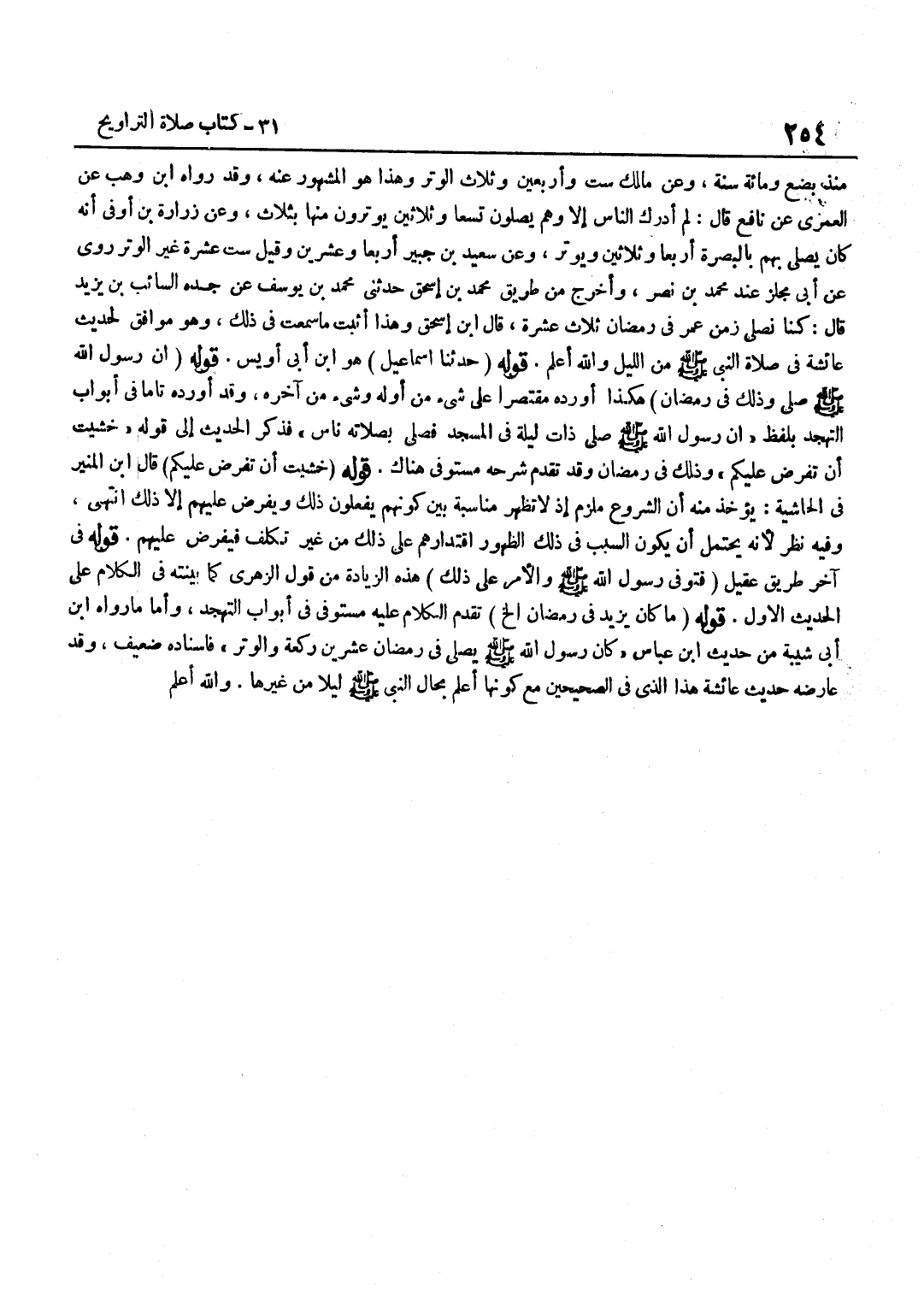 مُنْذُ بضع وَمِائَة سنة وَعَن مَالك سِتّ وَأَرْبَعِينَ وَثَلَاثَ الْوِتْرِ وَهَذَا هُوَ الْمَشْهُورُ عَنْهُ وَقد رَوَاهُ بن وَهْبٍ عَنِ الْعُمَرِيِّ عَنْ نَافِعٍ قَالَ لَمْ أُدْرِكِ النَّاسَ إِلَّا وَهُمْ يُصَلُّونَ تِسْعًا وَثَلَاثِينَ يُوتِرُونَ مِنْهَا بِثَلَاثٍ وَعَنْ زُرَارَةَ بْنِ أَوْفَى أَنَّهُ كَانَ يُصَلِّي بِهِمْ بِالْبَصْرَةِ أَرْبَعًا وَثَلَاثِينَ وَيُوتِرُ وَعَنْ سَعِيدِ بْنِ جُبَيْرٍ أَرْبَعًا وَعِشْرِينَ وَقِيلَ سِتَّ عَشْرَةَ غَيْرَ الْوِتْرِ رَوَى عَنْ أَبِي مِجْلَزٍ عِنْدَ مُحَمَّدِ بْنِ نَصْرٍ وَأَخْرَجَ مِنْ طَرِيقِ مُحَمَّدِ بْنِ إِسْحَاقَ حَدَّثَنِي مُحَمَّدُ بْنُ يُوسُفَ عَنْ جَدِّهِ السَّائِبِ بْنِ يَزِيدَ قَالَ كُنَّا نُصَلِّي زَمَنَ عُمَرَ فِي رَمَضَانَ ثَلَاث عشرَة قَالَ بن إِسْحَاقَ وَهَذَا أَثْبَتُ مَا سَمِعْتُ فِي ذَلِكَ وَهُوَ مُوَافِقٌ لِحَدِيثِ عَائِشَةَ فِي صَلَاةِ النَّبِيِّ صَلَّى اللَّهُ عَلَيْهِ وَسَلَّمَ مِنَ اللَّيْلِ وَاللَّهُ أعلم