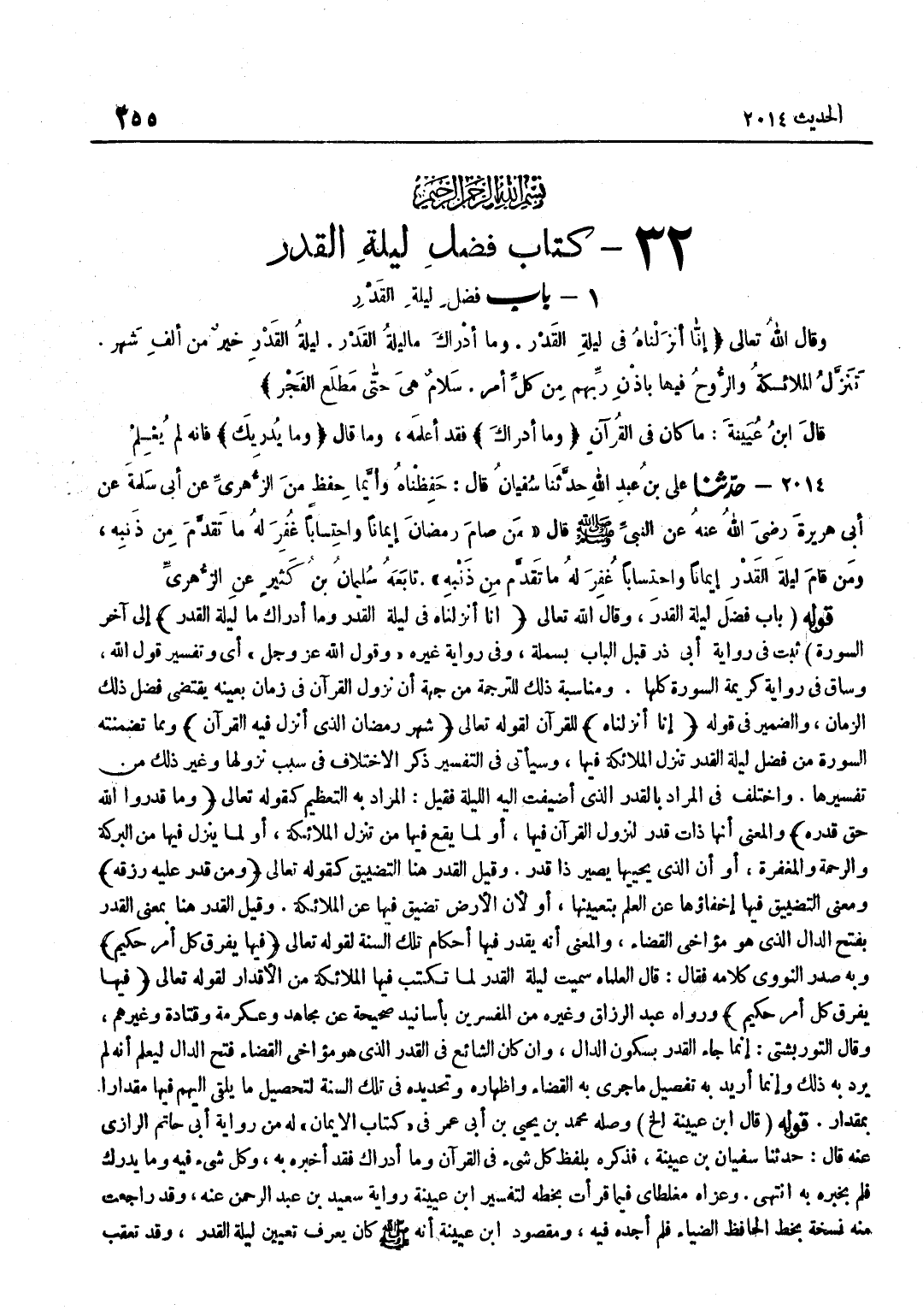 وَقَالَ اللَّهُ تَعَالَى إِنَّا أَنْزَلْنَاهُ فِي لَيْلَةِ الْقَدْرِ وَمَا أَدْرَاكَ مَا لَيْلَة الْقدر إِلَى آخِرِ السُّورَةِ ثَبَتَ فِي رِوَايَةِ أَبِي ذَرٍّ قَبْلَ الْبَابِ بَسْمَلَةٌ وَفِي رِوَايَةِ غَيْرِهِ وَقَوْلِ اللَّهِ عَزَّ وَجَلَّ أَيْ وَتَفْسِيرُ قَوْلِ اللَّهِ وَسَاقَ فِي رِوَايَةِ كَرِيمَةَ السُّورَةَ كُلَّهَا وَمُنَاسَبَةُ ذَلِكَ لِلتَّرْجَمَةِ مِنْ جِهَةِ أَنَّ نُزُولَ الْقُرْآنِ فِي زَمَانٍ بِعَيْنِهِ يَقْتَضِي فَضْلَ ذَلِكَ الزَّمَانِ وَالضَّمِيرُ فِي قَوْلِهِ إِنَّا أَنْزَلْنَاهُ لِلْقُرْآنِ لِقَوْلِهِ تَعَالَى شَهْرُ رَمَضَانَ الَّذِي أُنْزِلَ فِيهِ الْقرَان وَمِمَّا تَضَمَّنَتْهُ السُّورَةُ مِنْ فَضْلِ لَيْلَةِ الْقَدْرِ تَنَزُّلُ الْمَلَائِكَةِ فِيهَا وَسَيَأْتِي فِي التَّفْسِيرِ ذِكْرُ الِاخْتِلَافِ فِي سَبَبِ نُزُولِهَا وَغَيْرِ ذَلِكَ مِنْ تَفْسِيرِهَا وَاخْتُلِفَ فِي الْمُرَادِ بِالْقَدْرِ الَّذِي أُضِيفَتْ إِلَيْهِ اللَّيْلَةُ فَقِيلَ الْمُرَادُ بِهِ التَّعْظِيمُ كَقَوْلِهِ تَعَالَى وَمَا قدرُوا الله حق قدره وَالْمَعْنَى أَنَّهَا ذَاتُ قَدْرٍ لِنُزُولِ الْقُرْآنِ فِيهَا أَوْ لِمَا يَقَعُ فِيهَا مِنْ تَنَزُّلِ الْمَلَائِكَةِ أَوْ لِمَا يَنْزِلُ فِيهَا مِنَ الْبَرَكَةِ وَالرَّحْمَةِ وَالْمَغْفِرَةِ أَوْ أَنَّ الَّذِي يُحْيِيهَا يَصِيرُ ذَا قَدْرٍ وَقِيلَ الْقَدْرُ هُنَا التَّضْيِيقُ كَقَوْلِهِ تَعَالَى وَمن قدر عَلَيْهِ رزقه وَمَعْنَى التَّضْيِيقِ فِيهَا إِخْفَاؤُهَا عَنِ الْعِلْمِ بِتَعْيِينِهَا أَوْ لِأَنَّ الْأَرْضَ تَضِيقُ فِيهَا عَنِ الْمَلَائِكَةِ وَقِيلَ الْقَدْرُ هُنَا بِمَعْنَى الْقَدَرِ بِفَتْحِ الدَّالِ الَّذِي هُوَ مُؤَاخِي الْقَضَاءِ وَالْمَعْنَى أَنَّهُ يُقَدَّرُ فِيهَا أَحْكَامُ تِلْكَ السَّنَةِ لِقَوْلِهِ تَعَالَى فِيهَا يفرق كل أَمر حَكِيم وَبِهِ صَدَّرَ النَّوَوِيُّ كَلَامَهُ فَقَالَ قَالَ الْعُلَمَاءُ سُمِّيَتْ لَيْلَةَ الْقَدْرِ لِمَا تَكْتُبُ فِيهَا الْمَلَائِكَةُ مِنَ الْأَقْدَارِ لِقَوْلِهِ تَعَالَى فِيهَا يُفْرَقُ كُلُّ أَمر حَكِيم وَرَوَاهُ عَبْدُ الرَّزَّاقِ وَغَيْرُهُ مِنَ الْمُفَسِّرِينَ بِأَسَانِيدَ صَحِيحَةٍ عَنْ مُجَاهِدٍ وَعِكْرِمَةَ وَقَتَادَةَ وَغَيْرِهِمْ وَقَالَ التُّورِبِشْتِيُّ إِنَّمَا جَاءَ الْقَدْرُ بِسُكُونِ الدَّالِ وَإِنْ كَانَ الشَّائِعُ فِي الْقَدَرِ الَّذِي هُوَ مُؤَاخِي الْقَضَاءِ فَتْحَ الدَّالِ لِيُعْلَمَ أَنَّهُ لَمْ يُرَدْ بِهِ ذَلِكَ وَإِنَّمَا أُرِيدَ بِهِ تَفْصِيلُ مَا جَرَى بِهِ الْقَضَاءُ وَإِظْهَارُهُ وَتَحْدِيدُهُ فِي تِلْكَ السَّنَةِ لِتَحْصِيلِ مَا يُلْقَى إِلَيْهِمْ فِيهَا مِقْدَارًا بِمِقْدَار قَوْله قَالَ بن عُيَيْنَةَ إِلَخْ وَصَلَهُ مُحَمَّدُ بْنُ يَحْيَى بْنِ أَبِي عُمَرَ فِي كِتَابِ الْإِيمَانِ لَهُ مِنْ رِوَايَةِ أَبِي حَاتِمٍ الرَّازِيِّ عَنْهُ قَالَ حَدَّثَنَا سُفْيَانُ بْنُ عُيَيْنَةَ فَذَكَرَهُ بِلَفْظِ كُلُّ شَيْءٍ فِي الْقُرْآنِ وَمَا أَدْرَاكَ فَقَدْ أَخْبَرَهُ بِهِ وكل شَيْء فِيهِ وَمَا يدْرك فَلَمْ يُخْبِرْهُ بِهِ انْتَهَى وَعَزَاهُ مُغَلْطَايْ فِيمَا قَرَأت بِخَطِّهِ لتفسير بن عُيَيْنَةَ رِوَايَةَ سَعِيدِ بْنِ عَبْدِ الرَّحْمَنِ عَنْهُ وَقَدْ رَاجَعْتُ مِنْهُ نُسْخَةً بِخَطِّ الْحَافِظِ الضِّيَاءِ فَلم أَجِدهُ فِيهِ ومقصود بن عُيَيْنَةَ أَنَّهُ صَلَّى اللَّهُ عَلَيْهِ وَسَلَّمَ كَانَ يَعْرِفُ تَعْيِينَ لَيْلَةِ الْقَدْرِ وَقَدْ تُعُقِّبَ