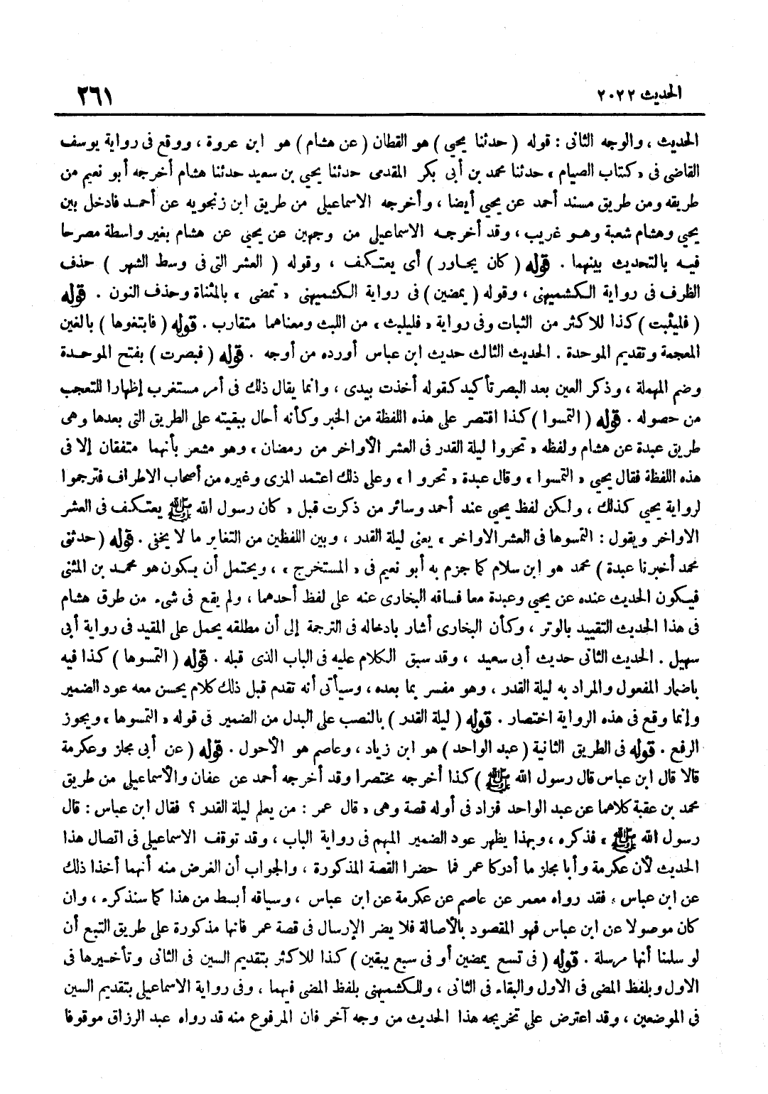 [2022] عبد الْوَاحِد هُوَ بن زِيَادٍ وَعَاصِمٌ هُوَ الْأَحْوَلُ قَوْلُهُ عَنْ أَبِي مجلز وَعِكْرِمَة قَالَا قَالَ بن عَبَّاسٍ قَالَ رَسُولُ اللَّهِ صَلَّى اللَّهُ عَلَيْهِ وَسَلَّمَ كَذَا أَخْرَجَهُ مُخْتَصَرًا وَقَدْ أَخْرَجَهُ أَحْمَدُ عَنْ عَفَّانَ وَالْإِسْمَاعِيلِيِّ مِنْ طَرِيقِ مُحَمَّدِ بْنِ عُقْبَةَ كِلَاهُمَا عَنْ عَبْدِ الْوَاحِدِ فَزَادَ فِي أَوَّلِهِ قِصَّةً وَهِيَ قَالَ عُمَرُ مَنْ يَعْلَمُ لَيْلَة الْقدر فَقَالَ بن عَبَّاسٍ قَالَ رَسُولُ اللَّهِ صَلَّى اللَّهُ عَلَيْهِ وَسَلَّمَ فَذَكَرَهُ وَبِهَذَا يَظْهَرُ عَوْدُ الضَّمِيرِ الْمُبْهَمِ فِي رِوَايَةِ الْبَابِ وَقَدْ تَوَقَّفَ الْإِسْمَاعِيلِيُّ فِي اتِّصَالِ هَذَا الْحَدِيثِ لِأَنَّ عِكْرِمَةَ وَأَبَا مِجْلَزٍ مَا أَدْرَكَا عُمَرَ فَمَا حَضَرَا الْقِصَّةَ الْمَذْكُورَةَ وَالْجَوَابُ أَنَّ الْغَرَضَ مِنْهُ أَنَّهُمَا أَخَذَا ذَلِكَ عَن بن عَبَّاسٍ فَقَدْ رَوَاهُ مَعْمَرٌ عَنْ عَاصِمٍ عَنْ عِكْرِمَة عَن بن عَبَّاسٍ وَسِيَاقُهُ أَبْسَطُ مِنْ هَذَا كَمَا سَنَذْكُرُهُ وَأَن كَانَ مَوْصُولا عَن بن عَبَّاسٍ فَهُوَ الْمَقْصُودُ بِالْأَصَالَةِ فَلَا يَضُرُّ الْإِرْسَالُ فِي قِصَّةِ عُمَرَ فَإِنَّهَا مَذْكُورَةٌ عَلَى طَرِيقِ التبع أَن لَوْ سَلَّمْنَا أَنَّهَا مُرْسَلَةٌ قَوْلُهُ فِي تِسْعٍ يَمْضِينَ أَوْ فِي سَبْعٍ يَبْقَيْنَ كَذَا لِلْأَكْثَرِ بِتَقْدِيمِ السِّينِ فِي الثَّانِي وَتَأْخِيرِهَا فِي الْأَوَّلِ وَبِلَفْظِ الْمُضِيِّ فِي الْأَوَّلِ وَالْبَقَاءِ فِي الثَّانِي ولِلْكُشْمِيهَنِيِّ بِلَفْظِ الْمُضِيِّ فِيهِمَا وَفِي رِوَايَةِ الْإِسْمَاعِيلِيِّ بِتَقْدِيمِ السِّينِ فِي الْمَوْضِعَيْنِ وَقَدِ اعْتُرِضَ عَلَى تَخْرِيجِهِ هَذَا الْحَدِيثَ مِنْ وَجْهٍ آخَرَ فَإِنَّ الْمَرْفُوعَ مِنْهُ قَدْ رَوَاهُ عَبْدُ الرَّزَّاقِ مَوْقُوفًا