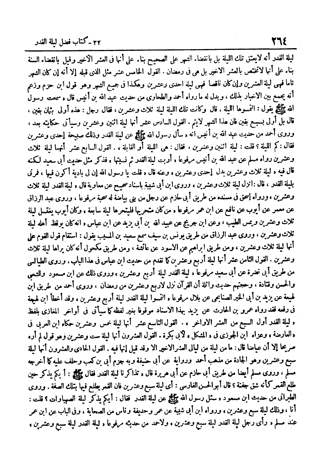 لَيْلَةِ الْقَدْرِ أَنَّهُ لَا يَعْتِقُ تِلْكَ اللَّيْلَةَ بَلْ بِانْقِضَاءِ الشَّهْرِ عَلَى الصَّحِيحِ بِنَاءً عَلَى أَنَّهَا فِي الْعَشْرِ الْأَخِيرِ وَقِيلَ بِانْقِضَاءِ السَّنَةِ بِنَاءً عَلَى أَنَّهَا لَا تَخْتَصُّ بِالْعَشْرِ الْأَخِيرِ بَلْ هِيَ فِي رَمَضَانَ الْقَوْلُ الْخَامِسَ عَشَرَ مِثْلُ الَّذِي قَبْلَهُ إِلَّا أَنَّهُ إِنْ كَانَ الشَّهْرُ تَامًّا فَهِيَ لَيْلَةُ الْعِشْرِينَ وَإِنْ كَانَ نَاقِصًا فَهِيَ لَيْلَةُ إِحْدَى وَعِشْرِينَ وَهَكَذَا فِي جَمِيع الشَّهْر وَهُوَ قَول بن حَزْمٍ وَزَعَمَ أَنَّهُ يُجْمَعُ بَيْنَ الْإِخْبَارِ بِذَلِكَ وَيَدُلُّ لَهُ مَا رَوَاهُ أَحْمَدُ وَالطَّحَاوِيُّ مِنْ حَدِيثِ عَبْدِ اللَّهِ بْنِ أُنَيْسٍ قَالَ سَمِعْتُ رَسُولَ اللَّهِ صَلَّى اللَّهُ عَلَيْهِ وَسَلَّمَ يَقُولُ الْتَمِسُوهَا اللَّيْلَةَ قَالَ وَكَانَتْ تِلْكَ اللَّيْلَةُ لَيْلَةَ ثَلَاثٍ وَعِشْرِينَ فَقَالَ رَجُلٌ هَذِهِ أَوْلَى بِثَمَانٍ بَقِينَ قَالَ بَلْ أَوْلَى بِسَبْعٍ بَقِينَ فَإِنَّ هَذَا الشَّهْرَ لَا يَتِمُّ الْقَوْلُ السَّادِسَ عَشَرَ أَنَّهَا لَيْلَةُ اثْنَيْنِ وَعِشْرِينَ وَسَيَأْتِي حِكَايَتُهُ بَعْدُ وَرَوَى أَحْمَدُ مِنْ حَدِيثِ عَبْدِ اللَّهِ بْنِ أُنَيْسٍ أَنَّهُ سَأَلَ رَسُولَ اللَّهِ صَلَّى اللَّهُ عَلَيْهِ وَسَلَّمَ عَنْ لَيْلَةِ الْقَدْرِ وَذَلِكَ صَبِيحَةَ إِحْدَى وَعِشْرِينَ فَقَالَ كَمِ اللَّيْلَةُ قُلْتُ لَيْلَةُ اثْنَيْنِ وَعِشْرِينَ فَقَالَ هِيَ اللَّيْلَةُ أَوِ الْقَابِلَةُ الْقَوْلُ السَّابِعَ عَشَرَ أَنَّهَا لَيْلَةُ ثَلَاثٍ وَعِشْرِينَ رَوَاهُ مُسْلِمٌ عَنْ عَبْدِ اللَّهِ بْنِ أُنَيْسٍ مَرْفُوعًا أُرِيتُ لَيْلَةَ الْقَدْرِ ثُمَّ نُسِّيتُهَا فَذَكَرَ مِثْلَ حَدِيثِ أَبِي سَعِيدٍ لَكِنَّهُ قَالَ فِيهِ لَيْلَةَ ثَلَاثٍ وَعِشْرِينَ بَدَلَ إِحْدَى وَعِشْرِينَ وَعَنْهُ قَالَ قُلْتُ يَا رَسُولَ اللَّهِ إِنَّ لِي بَادِيَةً أَكُونُ فِيهَا فَمُرْنِي بِلَيْلَةِ الْقَدْرِ قَالَ انْزِلْ لَيْلَة ثَلَاث وَعشْرين وروى بن أَبِي شَيْبَةَ بِإِسْنَادٍ صَحِيحٍ عَنْ مُعَاوِيَةَ قَالَ لَيْلَةُ الْقَدْرِ لَيْلَةُ ثَلَاثٍ وَعِشْرِينَ وَرَوَاهُ إِسْحَاقُ فِي مُسْنَدِهِ مِنْ طَرِيقِ أَبِي حَازِمٍ عَنْ رَجُلٍ مِنْ بَنِي بَيَاضَةَ لَهُ صُحْبَةٌ مَرْفُوعًا وَرَوَى عَبْدُ الرَّزَّاقِ عَنْ مَعْمَرٍ عَنْ أَيُّوبَ عَنْ نَافِع عَن بن عُمَرَ مَرْفُوعًا مَنْ كَانَ مُتَحَرِّيَهَا فَلْيَتَحَرَّهَا لَيْلَةَ سَابِعَةٍ وَكَانَ أَيُّوبُ يَغْتَسِلُ لَيْلَةَ ثَلَاثٍ وَعِشْرِينَ ويمس الطّيب وَعَن بن جُرَيْجٍ عَنْ عُبَيْدِ اللَّهِ بْنِ أَبِي يَزِيدَ عَنْ بن عَبَّاسٍ أَنَّهُ كَانَ يُوقِظُ أَهْلَهُ لَيْلَةَ ثَلَاثٍ وَعِشْرِينَ وَرَوَى عَبْدُ الرَّزَّاقِ مِنْ طَرِيقِ يُونُسَ بْنِ سَيْفٍ سَمِعَ سَعِيدَ بْنَ الْمُسَيَّبِ يَقُولُ اسْتَقَامَ قَوْلُ الْقَوْمِ عَلَى أَنَّهَا لَيْلَةُ ثَلَاثٍ وَعِشْرِينَ وَمِنْ طَرِيقِ إِبْرَاهِيمَ عَنِ الْأَسْوَدِ عَنْ عَائِشَة وَمن طَرِيقِ مَكْحُولٍ أَنَّهُ كَانَ يَرَاهَا لَيْلَةَ ثَلَاثٍ وَعِشْرِينَ الْقَوْلُ الثَّامِنَ عَشَرَ أَنَّهَا لَيْلَةُ أَرْبَعٍ وَعشْرين كَمَا تقدم من حَدِيث بن عَبَّاسٍ فِي هَذَا الْبَابِ وَرَوَى الطَّيَالِسِيُّ مِنْ طَرِيقِ أَبِي نَضْرَةَ عَنْ أَبِي سَعِيدٍ مَرْفُوعًا لَيْلَةُ الْقَدْرِ لَيْلَةُ أَرْبَعٍ وَعِشْرِينَ وَرُوِيَ ذَلِكَ عَن بن مَسْعُودٍ وَلِلشَّعْبِيِّ وَالْحَسَنِ وَقَتَادَةَ وَحُجَّتُهُمْ حَدِيثُ وَاثِلَةَ أَنَّ الْقُرْآنَ نَزَلَ لِأَرْبَعٍ وَعِشْرِينَ مِنْ رَمَضَانَ وروى أَحْمد من طَرِيق بن لَهِيعَةَ عَنْ يَزِيدَ بْنِ أَبِي الْخَيْرِ الصُّنَابِحِيِّ عَنْ بِلَالٍ مَرْفُوعًا الْتَمِسُو