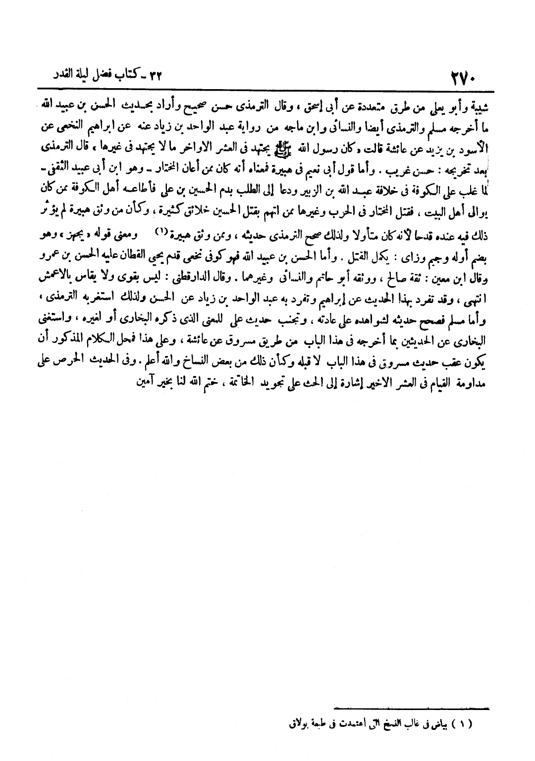 شَيْبَةَ وَأَبُو يَعْلَى مِنْ طُرُقٍ مُتَعَدِّدَةٍ عَنْ أَبِي إِسْحَاقَ وَقَالَ التِّرْمِذِيُّ حَسَنٌ صَحِيحٌ وَأَرَادَ بِحَدِيثِ الْحَسَنِ بْنِ عُبَيْدِ اللَّهِ مَا أَخْرَجَهُ مُسلم وَالتِّرْمِذِيّ أَيْضا وَالنَّسَائِيّ وبن مَاجَهْ مِنْ رِوَايَةِ عَبْدِ الْوَاحِدِ بْنِ زِيَادٍ عَنْهُ عَنْ إِبْرَاهِيمَ النَّخَعِيِّ عَنِ الْأَسْوَدِ بْنِ يَزِيدَ عَنْ عَائِشَةَ قَالَتْ كَانَ رَسُولُ اللَّهِ صَلَّى اللَّهُ عَلَيْهِ وَسَلَّمَ يَجْتَهِدُ فِي الْعَشْرِ الْأَوَاخِرِ مَا لَا يَجْتَهِدُ فِي غَيْرِهَا قَالَ التِّرْمِذِيُّ بَعْدَ تَخْرِيجِهِ حَسَنٌ غَرِيبٌ وَأَمَّا قَوْلُ أَبِي نُعَيْمٍ فِي هُبَيْرَةَ فَمَعْنَاهُ أَنَّهُ كَانَ مِمَّن أعَان الْمُخْتَار وَهُوَ بن أَبِي عُبَيْدٍ الثَّقَفِيُّ لَمَّا غَلَبَ عَلَى الْكُوفَةِ فِي خِلَافَةِ عَبْدِ اللَّهِ بْنِ الزُّبَيْرِ وَدَعَا إِلَى الطَّلَبِ بِدَمِ الْحُسَيْنِ بْنِ عَلِيٍّ فَأَطَاعَهُ أَهْلُ الْكُوفَةِ مِمَّنْ كَانَ يُوَالِي أَهْلَ الْبَيْتِ فَقَتَلَ الْمُخْتَارُ فِي الْحَرْبِ وَغَيْرِهَا مِمَّنِ اتُّهِمَ بِقَتْلِ الْحُسَيْنِ خَلَائِقَ كَثِيرَةً وَكَأَنَّ مَنْ وَثَّقَ هُبَيْرَةَ لَمْ يُؤَثِّرْ ذَلِكَ فِيهِ عِنْدَهُ قَدْحًا لِأَنَّهُ كَانَ مُتَأَوِّلًا وَلِذَلِكَ صَحَّحَ التِّرْمِذِيُّ حَدِيثَهُ وَمِمَّنْ وثق هُبَيْرَة وَمَعْنَى قَوْلِهِ يُجْهِزُ وَهُوَ بِضَمِّ أَوَّلِهِ وَجِيمٍ وَزَايٍ يُكْمِلُ الْقَتْلَ وَأَمَّا الْحَسَنُ بْنُ عُبَيْدِ اللَّهِ فَهُوَ كُوفِيٌّ نَخَعِيٌّ قَدَّمَ يَحْيَى الْقَطَّانُ عَلَيْهِ الْحسن بن عَمْرو وَقَالَ بن مَعِينٍ ثِقَةٌ صَالِحٌ وَوَثَّقَهُ أَبُو حَاتِمٍ وَالنَّسَائِيُّ وَغَيْرُهُمَا وَقَالَ الدَّارَقُطْنِيُّ لَيْسَ بِقَوِيٍّ وَلَا يُقَاسُ بِالْأَعْمَشِ انْتَهَى وَقَدْ تَفَرَّدَ بِهَذَا الْحَدِيثِ عَنْ إِبْرَاهِيمَ وَتَفَرَّدَ بِهِ عَبْدُ الْوَاحِدِ بْنُ زِيَادٍ عَنِ الْحَسَنِ وَلِذَلِكَ اسْتَغْرَبَهُ التِّرْمِذِيُّ وَأَمَّا مُسْلِمٌ فَصَحَّحَ حَدِيثَهُ لِشَوَاهِدِهِ عَلَى عَادَتِهِ وَتَجَنَّبَ حَدِيثَ عَلِيٍّ لِلْمَعْنَى الَّذِي ذَكَرَهُ الْبُخَارِيُّ أَوْ لِغَيْرِهِ وَاسْتَغْنَى الْبُخَارِيُّ عَنِ الْحَدِيثَيْنِ بِمَا أَخْرَجَهُ فِي هَذَا الْبَابِ مِنْ طَرِيقِ مَسْرُوقٍ عَنْ عَائِشَةَ وَعَلَى هَذَا فَمَحَلُّ الْكَلَامِ الْمَذْكُورِ أَنْ يَكُونَ عقب حَدِيث مَسْرُوق فِي هَذَا الْبَاب لأقبله وَكَأَنَّ ذَلِكَ مِنْ بَعْضِ النُّسَّاخِ وَاللَّهُ أَعْلَمُ وَفِي الْحَدِيثِ الْحِرْصُ عَلَى مُدَاوَمَةِ الْقِيَامِ فِي الْعَشْرِ الْأَخِيرِ إِشَارَةً إِلَى الْحَثِّ عَلَى تَجْوِيدِ الْخَاتِمَةِ خَتَمَ اللَّهُ لَنَا بِخَيْرٍ آمِينَ