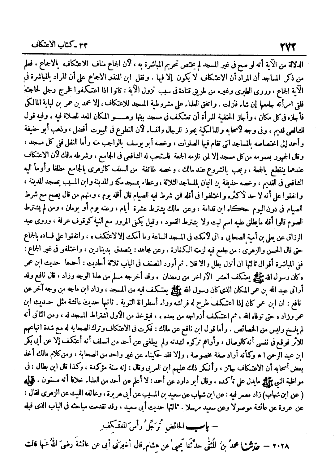 الدَّلَالَةِ مِنَ الْآيَةِ أَنَّهُ لَوْ صَحَّ فِي غَيْرِ الْمَسْجِدِ لَمْ يَخْتَصَّ تَحْرِيمُ الْمُبَاشَرَةِ بِهِ لِأَنَّ الْجِمَاعَ مُنَافٍ لِلِاعْتِكَافِ بِالْإِجْمَاعِ فَعُلِمَ مِنْ ذِكْرِ الْمَسَاجِدِ أَنَّ الْمُرَادَ أَنَّ الِاعْتِكَافَ لَا يكون الا فِيهَا وَنقل بن الْمُنْذِرِ الْإِجْمَاعَ عَلَى أَنَّ الْمُرَادَ بِالْمُبَاشَرَةِ فِي الْآيَةِ الْجِمَاعُ وَرَوَى الطَّبَرِيُّ وَغَيْرُهُ مِنْ طَرِيقِ قَتَادَةَ فِي سَبَبِ نُزُولِ الْآيَةِ كَانُوا إِذَا اعْتَكَفُوا فَخَرَجَ رَجُلٌ لِحَاجَتِهِ فَلَقِيَ امْرَأَتَهُ جَامَعَهَا إِنْ شَاءَ فَنَزَلَتْ وَاتَّفَقَ الْعُلَمَاءُ عَلَى مَشْرُوطِيَّةِ الْمَسْجِدِ لِلِاعْتِكَافِ إِلَّا مُحَمَّدَ بْنَ عُمَرَ بْنِ لُبَابَةَ الْمَالِكِيَّ فَأَجَازَهُ فِي كُلِّ مَكَانٍ وَأَجَازَ الْحَنَفِيَّةُ لِلْمَرْأَةِ أَنْ تَعْتَكِفَ فِي مَسْجِدِ بَيْتِهَا وَهُوَ الْمَكَانُ الْمُعَدُّ لِلصَّلَاةِ فِيهِ وَفِيهِ قَوْلٌ الشَّافِعِي قديم وَفِي وَجْهٍ لِأَصْحَابِهِ وَلِلْمَالِكِيَّةِ يَجُوزُ لِلرِّجَالِ وَالنِّسَاءِ لِأَنَّ التَّطَوُّعَ فِي الْبُيُوتِ أَفْضَلُ وَذَهَبَ أَبُو حَنِيفَةَ وَأَحْمَدُ إِلَى اخْتِصَاصِهِ بِالْمَسَاجِدِ الَّتِي تُقَامُ فِيهَا الصَّلَوَاتُ وَخَصَّهُ أَبُو يُوسُفَ بِالْوَاجِبِ مِنْهُ وَأَمَّا النَّفْلُ فَفِي كُلِّ مَسْجِدٍ وَقَالَ الْجُمْهُورُ بِعُمُومِهِ مِنْ كُلِّ مَسْجِدٍ إِلَّا لِمَنْ تَلْزَمُهُ الْجُمُعَةُ فَاسْتَحَبَّ لَهُ الشَّافِعِيُّ فِي الْجَامِعِ وَشَرَطَهُ مَالِكٌ لِأَنَّ الِاعْتِكَافَ عِنْدَهُمَا يَنْقَطِعُ بِالْجُمُعَةِ وَيَجِبُ بِالشُّرُوعِ عِنْدَ مَالِكٍ وَخَصَّهُ طَائِفَةٌ مِنَ السَّلَفِ كَالزُّهْرِيِّ بِالْجَامِعِ مُطْلَقًا وَأَوْمَأَ إِلَيْهِ الشَّافِعِيُّ فِي الْقَدِيمِ وَخَصَّهُ حُذَيْفَةُ بْنُ الْيَمَانِ بِالْمَسَاجِدِ الثَّلَاثَةِ وَعَطَاء بِمَسْجِد مَكَّة وَالْمَدينَة وبن الْمُسَيَّبِ بِمَسْجِدِ الْمَدِينَةِ وَاتَّفَقُوا عَلَى أَنَّهُ لَا حَدَّ لِأَكْثَرِهِ وَاخْتَلَفُوا فِي أَقَلِّهِ فَمَنْ شَرَطَ فِيهِ الصِّيَامَ قَالَ أَقَلُّهُ يَوْمٌ وَمِنْهُمْ مَنْ قَالَ يَصِحُّ مَعَ شَرْطِ الصِّيَامِ فِي دُونِ الْيَوْم حَكَاهُ بن قُدَامَةَ وَعَنْ مَالِكٍ يُشْتَرَطُ عَشْرَةُ أَيَّامٍ وَعَنْهُ يَوْمٌ أَوْ يَوْمَانِ وَمَنْ لَمْ يَشْتَرِطِ الصَّوْمَ قَالُوا أَقَلُّهُ مَا يُطْلَقُ عَلَيْهِ اسْمُ لُبْثٍ وَلَا يُشْتَرَطُ الْقُعُودُ وَقِيلَ يَكْفِي الْمُرُورُ مَعَ النِّيَّةِ كَوُقُوفِ عَرَفَةَ وَرَوَى عَبْدُ الرَّزَّاقِ عَنْ يَعْلَى بنِ أُمِّيَّةَ الصَّحَابِيِّ إِنِّي لَأَمْكُثُ فِي الْمَسْجِدِ السَّاعَةَ وَمَا أَمْكُثُ إِلَّا لِأَعْتَكِفَ وَاتَّفَقُوا عَلَى فَسَادِهِ بِالْجِمَاعِ حَتَّى قَالَ الْحَسَنُ وَالزُّهْرِيُّ مَنْ جَامَعَ فِيهِ لَزِمَتْهُ الْكَفَّارَةُ وَعَنْ مُجَاهِدٍ يَتَصَدَّقُ بِدِينَارَيْنِ وَاخْتَلَفُوا فِي غَيْرِ الْجِمَاعِ فَفِي الْمُبَاشَرَةِ أَقْوَالٌ ثَالِثُهَا إِنْ أَنْزَلَ بَطَلَ وَإِلَّا فَلَا ثُمَّ أَوْرَدَ الْمُصَنِّفُ فِي الْبَابِ ثَلَاثَةَ أَحَادِيثَ أَحَدُهَا حَدِيثُ بن عُمَرَ كَانَ رَسُولُ اللَّهِ صَلَّى اللَّهُ عَلَيْهِ وَسَلَّمَ يَعْتَكِفُ الْعَشْرَ الْأَوَاخِرَ مِنْ رَمَضَانَ وَقَدْ أَخْرَجَهُ مُسْلِمٌ مِنْ هَذَا الْوَجْهِ وَزَادَ قَالَ نَافِعٌ وَقَدْ أَرَانِي عَبْدُ اللَّهِ بْنُ عُمَرَ الْمَكَانَ الَّذِي كَانَ رَسُولُ اللَّهِ صَلَّى اللَّهُ عَلَيْهِ وَسَلَّمَ يَعْتَكِفُ فِيهِ مِنَ الْمَسْجِدِ وَزَادَ بن مَاجَهْ مِنْ وَجْهٍ آخَرَ عَنْ نَافِعٍ أَنَّ بن عُمَرَ كَانَ إِذَا اعْتَكَفَ طُرِحَ لَهُ فِرَاشَهُ وَرَاءَ أُسْطُوَانَةِ التَّوْبَةِ ثَانِيهَا حَ