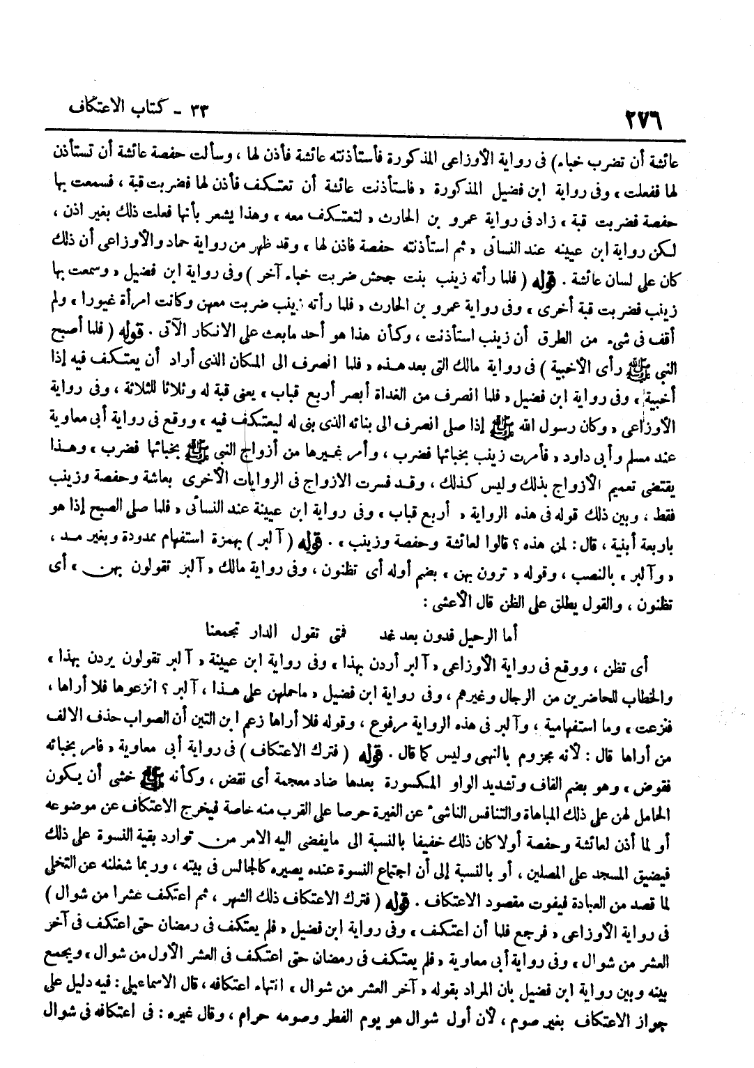عَائِشَةَ أَنْ تَضْرِبَ خِبَاءً فِي رِوَايَةِ الْأَوْزَاعِيِّ الْمَذْكُورَةِ فَاسْتَأْذَنَتْهُ عَائِشَةُ فَأَذِنَ لَهَا وَسَأَلَتْ حَفْصَةُ عَائِشَةَ أَنْ تَسْتَأْذِنَ لَهَا فَفَعَلَتْ وَفِي رِوَايَةِ بن فُضَيْلٍ الْمَذْكُورَةِ فَاسْتَأْذَنَتْ عَائِشَةُ أَنْ تَعْتَكِفَ فَأَذِنَ لَهَا فَضَرَبَتْ قُبَّةً فَسَمِعَتْ بِهَا حَفْصَةُ فَضَرَبَتْ قُبَّةً زَادَ فِي رِوَايَةِ عَمْرِو بْنِ الْحَارِثِ لِتَعْتَكِفَ مَعَهُ وَهَذَا يُشْعِرُ بِأَنَّهَا فَعَلَتْ ذَلِكَ بِغَيْر إِذن لَكِن رِوَايَة بن عُيَيْنَةَ عِنْدَ النَّسَائِيِّ ثُمَّ اسْتَأْذَنَتْهُ حَفْصَةُ فَأَذِنَ لَهَا وَقَدْ ظَهَرَ مِنْ رِوَايَةِ حَمَّادٍ وَالْأَوْزَاعِيِّ أَنَّ ذَلِكَ كَانَ عَلَى لِسَانِ عَائِشَةَ قَوْلُهُ فَلَمَّا رَأَتْهُ زَيْنَبُ بِنْتُ جَحْشٍ ضَرَبَتْ خِبَاءً اخر وَفِي رِوَايَة بن فُضَيْلٍ وَسَمِعَتْ بِهَا زَيْنَبُ فَضَرَبَتْ قُبَّةً أُخْرَى وَفِي رِوَايَةِ عَمْرِو بْنِ الْحَارِثِ فَلَمَّا رَأَتْهُ زَيْنَبُ ضَرَبَتْ مَعَهُنَّ وَكَانَتِ امْرَأَةً غَيُورًا وَلَمْ أَقِفْ فِي شَيْءٍ مِنَ الطُّرُقِ أَنَّ زَيْنَبَ اسْتَأْذَنَتْ وَكَأَنَّ هَذَا هُوَ أَحَدَ مَا بَعَثَ عَلَى الْإِنْكَارِ الْآتِي قَوْلُهُ فَلَمَّا أَصْبَحَ النَّبِيُّ صَلَّى اللَّهُ عَلَيْهِ وَسَلَّمَ رَأَى الْأَخْبِيَةَ فِي رِوَايَةِ مَالِكٍ الَّتِي بَعْدَ هَذِهِ فَلَمَّا انْصَرَفَ إِلَى الْمَكَانِ الَّذِي أَرَادَ أَنْ يَعْتَكِفَ فِيهِ إِذا أخبية وَفِي رِوَايَة بن فُضَيْلٍ فَلَمَّا انْصَرَفَ مِنَ الْغَدَاةِ أَبْصَرَ أَرْبَعَ قِبَابٍ يَعْنِي قُبَّةً لَهُ وَثَلَاثًا لِلثَّلَاثَةِ وَفِي رِوَايَةِ الْأَوْزَاعِيِّ وَكَانَ رَسُولُ اللَّهِ صَلَّى اللَّهُ عَلَيْهِ وَسَلَّمَ إِذَا صَلَّى انْصَرَفَ إِلَى بِنَائِهِ الَّذِي بُنِيَ لَهُ لِيَعْتَكِفَ فِيهِ وَوَقَعَ فِي رِوَايَةِ أَبِي مُعَاوِيَةَ عِنْدَ مُسْلِمٍ وَأَبِي دَاوُدَ فَأَمَرَتْ زَيْنَبُ بِخِبَائِهَا فَضُرِبَ وَأَمَرَ غَيْرُهَا مِنْ أَزْوَاجِ النَّبِيِّ صَلَّى اللَّهُ عَلَيْهِ وَسَلَّمَ بِخِبَائِهَا فَضُرِبَ وَهَذَا يَقْتَضِي تَعْمِيمَ الْأَزْوَاجِ بِذَلِكَ وَلَيْسَ كَذَلِكَ وَقَدْ فُسِّرَتِ الْأَزْوَاجُ فِي الرِّوَايَاتِ الْأُخْرَى بِعَائِشَةَ وَحَفْصَةَ وَزَيْنَبَ فَقَطْ وَبَيَّنَ ذَلِكَ قَوْلُهُ فِي هَذِهِ الرِّوَايَةِ أَرْبَعَ قِبَابٍ وَفِي رِوَايَةِ بن عُيَيْنَةَ عِنْدَ النَّسَائِيِّ فَلَمَّا صَلَّى الصُّبْحَ إِذَا هُوَ بِأَرْبَعَةِ أَبْنِيَةٍ قَالَ لِمَنْ هَذِهِ قَالُوا لِعَائِشَةَ وَحَفْصَةَ وَزَيْنَبَ قَوْلُهُ آلْبِرَّ بِهَمْزَةِ اسْتِفْهَامٍ مَمْدُودَةٍ وَبِغَيْرِ مَدٍّ وَآلْبِرَّ بِالنَّصْبِ وَقَوْلُهُ تُرَوْنَ بِهِنَّ بِضَمِّ أَوَّلِهِ أَيْ تَظُنُّونَ وَفِي رِوَايَةِ مَالِكٍ آلْبِرَّ تَقُولُونَ بِهِنَّ أَيْ تَظُنُّونَ وَالْقَوْلُ يُطْلَقُ عَلَى الظَّنِّ قَالَ الْأَعْشَى أَمَّا الرَّحِيلُ فَدُونَ بَعْدَ غَدِ فَمَتَى تَقُولُ الدَّارَ تَجْمَعُنَا أَيْ تَظُنُّ وَوَقَعَ فِي رِوَايَةِ الْأَوْزَاعِيِّ آلْبِرَّ أردن بِهَذَا وَفِي رِوَايَة بن عُيَيْنَةَ آلْبِرَّ تَقُولُونَ يُرِدْنَ بِهَذَا وَالْخِطَابُ لِلْحَاضِرِينَ من الرِّجَال وَغَيرهم وَفِي رِوَايَة بن فُضَيْلٍ مَا حَمَلَهُنَّ عَلَى هَذَا آلْبِرُّ انْزِعُوهَا فَلَا أَرَاهَا فنزعت وَمَا استفهامية وآلبر فِي هَذِهِ الرِّوَايَةِ مَرْفُوعٌ وَقَوْلُهُ فَلَا أَرَاهَا زعم بن التِّينِ أَنَّ الصَّوَابَ حَذْفُ الْأَلِفِ مِنْ أَرَاهَا قَالَ لِأَنَّهُ مَجْزُومٌ بِالنَّهْيِ وَلَيْسَ كَمَا قَالَ قَوْلُهُ فَتَرَكَ الِاعْتِكَافَ فِي رِوَايَةِ أَبِي مُعَاوِيَةَ فَأَمَرَ بِخِبَائِهِ فَقُوِّضَ وَهُوَ بِضَمِّ الْقَافِ وَتَشْدِ