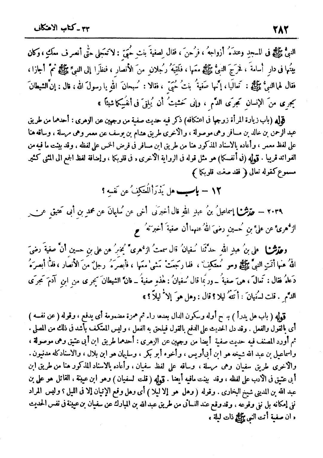 [2039] قَوْلُهُ قُلْتُ لِسُفْيَانَ وَهُوَ بن عُيَيْنَةَ الْقَائِلُ هُوَ عَلِيِّ بْنِ عَبْدِ اللَّهِ بْنِ الْمَدِينِيِّ شَيْخِ الْبُخَارِيِّ وَقَوْلُهُ وَهَلْ هُوَ إِلَّا لَيْلًا أَيْ وَهَلْ وَقَعَ الْإِتْيَانُ إِلَّا فِي اللَّيْلِ وَلَيْسَ الْمُرَادُ نَفْيَ إِمْكَانِهِ بَلْ نَفْيَ وُقُوعِهِ وَقَدْ وَقَعَ عِنْدَ النَّسَائِيُّ مِنْ طَرِيقِ عَبْدِ اللَّهِ بْنِ الْمُبَارَكِ عَنْ سُفْيَانَ بْنِ عُيَيْنَةَ فِي نَفْسِ الْحَدِيثِ أَنَّ صَفِيَّةَ أَتَتِ النَّبِيَّ صَلَّى اللَّهُ عَلَيْهِ وَسَلَّمَ ذَاتَ لَيْلَة