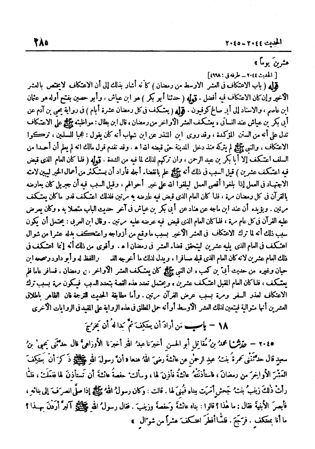 [2044] قَوْلُهُ حَدَّثَنَا أَبُو بَكْرٍ هُوَ بن عَيَّاشٍ وَأَبُو حَصِينٍ بِفَتْحِ أَوَّلِهِ هُوَ عُثْمَانُ بْنُ عَاصِمٍ وَالْإِسْنَادُ إِلَى أَبِي صَالِحٍ كُوفِيُّونَ قَوْلُهُ يَعْتَكِفُ فِي كُلِّ رَمَضَانَ عَشْرَةَ أَيَّامٍ فِي رِوَايَةِ يَحْيَى بْنِ آدَمَ عَنْ أَبِي بَكْرِ بْنِ عَيَّاشٍ عِنْدَ النَّسَائِيِّ يَعْتَكِفُ الْعَشْرَ الْأَوَاخِر من رَمَضَان قَالَ بن بَطَّالٍ مُوَاظَبَتُهُ صَلَّى اللَّهُ عَلَيْهِ وَسَلَّمَ عَلَى الِاعْتِكَافِ تَدُلُّ عَلَى أَنَّهُ مِنَ السُّنَنِ الْمُؤَكَّدَةِ وَقد روى بن الْمُنْذر عَن بن شِهَابٍ أَنَّهُ كَانَ يَقُولُ عَجَبًا لِلْمُسْلِمِينَ تَرَكُوا الِاعْتِكَافَ وَالنَّبِيُّ صَلَّى اللَّهُ عَلَيْهِ وَسَلَّمَ لَمْ يَتْرُكْهُ مُنْذُ دَخَلَ الْمَدِينَةَ حَتَّى قَبَضَهُ اللَّهُ اه وَقَدْ تَقَدَّمَ قَوْلُ مَالِكٍ إِنَّهُ لَمْ يَعْلَمْ أَنَّ أَحَدًا مِنَ السَّلَفِ اعْتَكَفَ إِلَّا أَبَا بَكْرِ بْنَ عَبْدِ الرَّحْمَنِ وَإِنَّ تَرْكَهُمْ لِذَلِكَ لِمَا فِيهِ مِنَ الشِّدَّةِ قَوْلُهُ فَلَمَّا كَانَ الْعَامُ الَّذِي قُبِضَ فِيهِ اعْتَكَفَ عِشْرِينَ قِيلَ السَّبَبُ فِي ذَلِكَ أَنَّهُ صَلَّى اللَّهُ عَلَيْهِ وَسَلَّمَ عَلِمَ بِانْقِضَاءِ أَجَلِهِ فَأَرَادَ أَنْ يَسْتَكْثِرَ مِنْ أَعْمَالِ الْخَيْرِ لِيُبَيِّنَ لِأُمَّتِهِ الِاجْتِهَادَ فِي الْعَمَلِ إِذَا بَلَغُوا أَقْصَى الْعَمَلِ لِيَلْقَوُا اللَّهَ عَلَى خَيْرِ أَحْوَالِهِمْ وَقِيلَ السَّبَبُ فِيهِ أَنَّ جِبْرِيلَ كَانَ يُعَارِضُهُ بِالْقُرْآنِ فِي كُلِّ رَمَضَانَ مَرَّةً فَلَمَّا كَانَ الْعَامُ الَّذِي قُبِضَ فِيهِ عَارَضَهُ بِهِ مَرَّتَيْنِ فَلِذَلِكَ اعْتَكَفَ قَدْرَ مَا كَانَ يَعْتَكِفُ مَرَّتَيْنِ وَيُؤَيِّدُهُ أَنَّ عِنْدَ بن مَاجَهْ عَنْ هَنَّادٍ عَنْ أَبِي بَكْرِ بْنِ عَيَّاشٍ فِي آخِرِ حَدِيثِ الْبَابِ مُتَّصِلًا بِهِ وَكَانَ يَعْرِضُ عَلَيْهِ الْقُرْآنَ فِي كُلِّ عَامٍ مَرَّةً فَلَمَّا كَانَ الْعَامُ الَّذِي قُبِضَ فِيهِ عرضه عَلَيْهِ مرَّتَيْنِ وَقَالَ بن الْعَرَبِيِّ يَحْتَمِلُ أَنْ يَكُونَ سَبَبُ ذَلِكَ أَنَّهُ لَمَّا تَرَكَ الِاعْتِكَافَ فِي الْعَشْرِ الْأَخِيرِ بِسَبَبِ مَا وَقَعَ مِنْ أَزْوَاجِهِ وَاعْتَكَفَ بَدَلَهُ عَشْرًا مِنْ شَوَّالٍ اعْتَكَفَ فِي الْعَامِ الَّذِي يَلِيهِ عِشْرِينَ لِيَتَحَقَّقَ قَضَاءُ الْعَشْرِ فِي رَمَضَانَ اه وَأَقْوَى مِنْ ذَلِكَ أَنَّهُ إِنَّمَا اعْتَكَفَ فِي ذَلِكَ الْعَامِ عِشْرِينَ لِأَنَّهُ كَانَ الْعَامَ الَّذِي قَبْلَهُ مُسَافِرًا وَيَدُلُّ لِذَلِكَ مَا أَخْرَجَهُ النَّسَائِيُّ وَاللَّفْظ لَهُ وَأَبُو دَاوُد وَصَححهُ بن حِبَّانَ وَغَيْرُهُ مِنْ حَدِيثُ أُبَيِّ بْنِ كَعْبٍ أَنَّ النَّبِيَّ صَلَّى اللَّهُ عَلَيْهِ وَسَلَّمَ كَانَ يَعْتَكِفُ الْعَشْرَ الْأَوَاخِرَ مِنْ رَمَضَانَ فَسَافَرَ عَامًا فَلَمْ يَعْتَكِفْ فَلَمَّا كَانَ الْعَامُ الْمُقْبِلُ اعْتَكَفَ عِشْرِينَ وَيَحْتَمِلُ تَعَدُّدَ هَذِهِ الْقِصَّةِ بِتَعَدُّدِ السَّبَبِ فَيَكُونُ مَرَّةً بِسَبَبِ تَرْكِ الِاعْتِكَافِ لِعُذْرِ السَّفَرِ وَمَرَّةً بِسَبَبِ عَرْضِ الْقُرْآنِ مَرَّتَيْنِ وَأَمَّا مُطَابِقَةُ الْحَدِيثِ لِلتَّرْجَمَةِ فَإِنَّ الظَّاهِرَ بِإِطْلَاقِ الْعِشْرِينَ أَنَّهَا مُتَوَالِيَةٌ فَيَتَعَيَّنُ لِذَلِكَ الْعَشْرُ الْأَوْسَطُ أَوْ أَنَّهُ حَمَلَ الْمُطْلَقَ فِي هَذِهِ الرِّوَايَةِ عَلَى الْمُقَيَّدِ فِي الرِّوَايَات الْأُخْرَى