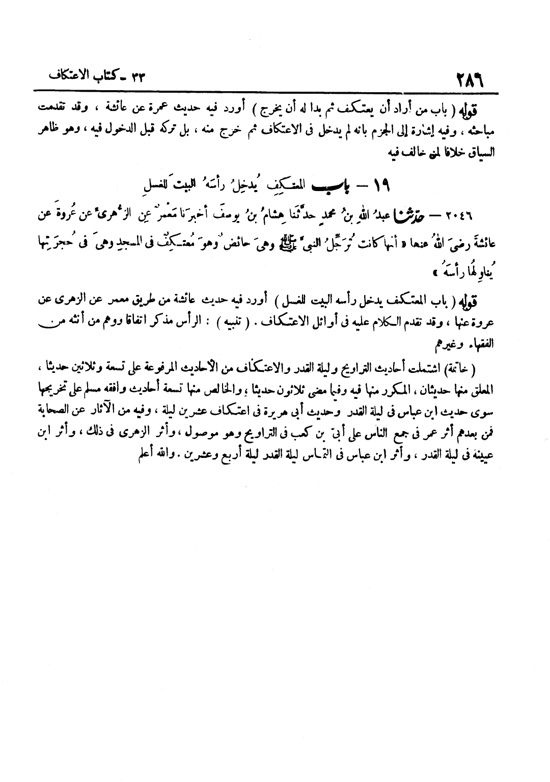 أَوْرَدَ فِيهِ حَدِيثَ عَمْرَةَ عَنْ عَائِشَةَ وَقَدْ تَقَدَّمَتْ مَبَاحِثُهُ وَفِيهِ إِشَارَةٌ إِلَى الْجَزْمِ بِأَنَّهُ لَمْ يَدْخُلْ فِي الِاعْتِكَافِ ثُمَّ خَرَجَ مِنْهُ بَلْ تَرَكَهُ قَبْلَ الدُّخُولِ فِيهِ وَهُوَ ظَاهِرُ السِّيَاقِ خِلَافًا لِمَنْ خَالف فِيهِ قَوْلُهُ بَابٌ الْمُعْتَكِفُ يُدْخِلُ رَأْسَهُ الْبَيْتَ لِلْغُسْلِ أَوْرَدَ فِيهِ حَدِيثَ عَائِشَةَ مِنْ طَرِيقِ مَعْمَرٍ عَنِ الزُّهْرِيِّ عَنْ عُرْوَةَ عَنْهَا وَقَدْ تَقَدَّمَ الْكَلَامُ عَلَيْهِ فِي أَوَائِلِ الِاعْتِكَافِ تَنْبِيهٌ الرَّأْسُ مُذَكَّرٌ اتِّفَاقًا وَوَهَمَ مَنْ أَنَّثَهُ مِنَ الْفُقَهَاءِ وَغَيْرِهِمْ خَاتِمَةٌ اشْتَمَلَتْ أَحَادِيثُ التَّرَاوِيحِ وَلَيْلَةِ الْقَدْرِ وَالِاعْتِكَافِ مِنَ الْأَحَادِيثِ الْمَرْفُوعَةِ عَلَى تِسْعَةٍ وَثَلَاثِينَ حَدِيثًا الْمُعَلَّقُ مِنْهَا حَدِيثَانِ الْمُكَرَّرُ مِنْهَا فِيهِ وَفِيمَا مَضَى ثَلَاثُونَ حَدِيثًا وَالْخَالِصُ مِنْهَا تِسْعَةُ أَحَادِيثَ وَافَقَهُ مُسْلِمٌ عَلَى تَخْرِيجِهَا سِوَى حَدِيثِ بن عَبَّاسٍ فِي لَيْلَةِ الْقَدْرِ وَحَدِيثِ أَبِي هُرَيْرَةَ فِي اعْتِكَافِ عِشْرِينَ لَيْلَةً وَفِيهِ مِنَ الْآثَارِ عَنِ الصَّحَابَةِ فَمَنْ بَعْدَهُمْ أَثَرُ عُمَرَ فِي جَمْعِ النَّاسِ عَلَى أُبَيِّ بْنِ كَعْبٍ فِي التَّرَاوِيحِ وَهُوَ مَوْصُولٌ وَأَثَرُ الزُّهْرِيِّ فِي ذَلِكَ وَأثر بن عُيَيْنَة فِي لَيْلَة الْقدر وَأثر بن عَبَّاسٍ فِي الْتِمَاسِ لَيْلَةِ الْقَدْرِ لَيْلَةَ أَرْبَعٍ وَعشْرين وَالله أعلم