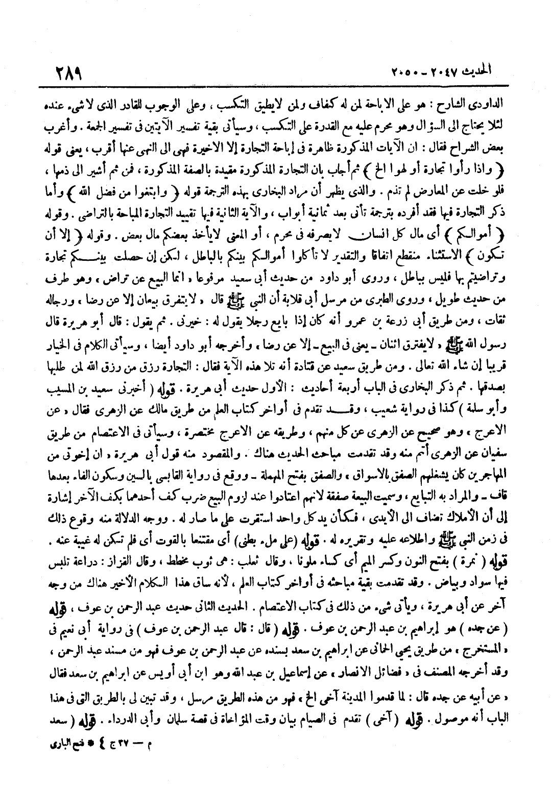 [2047] قَوْلُهُ أَخْبَرَنِي سَعِيدُ بْنُ الْمُسَيَّبِ وَأَبُو سَلَمَةَ كَذَا فِي رِوَايَةِ شُعَيْبٍ وَقد تقدم فِي أَو اخر كِتَابِ الْعِلْمِ مِنْ طَرِيقِ مَالِكٍ عَنِ الزُّهْرِيِّ فَقَالَ عَنِ الْأَعْرَجِ وَهُوَ صَحِيحٌ عَنِ الزُّهْرِيِّ عَنْ كُلٍّ مِنْهُمْ وَطَرِيقُهُ عَنِ الْأَعْرَجِ مُخْتَصَرَةٌ وَسَيَأْتِي فِي الِاعْتِصَامِ مِنْ طَرِيقِ سُفْيَانَ عَنِ الزُّهْرِيِّ أَتَمَّ مِنْهُ وَقَدْ تَقَدَّمَتْ مَبَاحِثُ الْحَدِيثِ هُنَاكَ وَالْمَقْصُودُ مِنْهُ قَوْلُ أَبِي هُرَيْرَةَ إِنَّ إِخْوَتِي مِنَ الْمُهَاجِرِينَ كَانَ يَشْغَلُهُمُ الصَّفْقُ بِالْأَسْوَاقِ وَالصَّفْقُ بِفَتْحِ الْمُهْمَلَةِ وَوَقَعَ فِي رِوَايَةِ الْقَابِسِيِّ بِالسِّينِ وَسُكُونِ الْفَاءِ بَعْدَهَا قَافٌ وَالْمُرَادُ بِهِ التَّبَايُعُ وَسُمِّيَتِ الْبَيْعَةُ صَفْقَةً لِأَنَّهُمُ اعْتَادُوا عِنْدَ لُزُومِ الْبَيْعِ ضَرْبَ كَفِّ أَحَدِهِمَا بِكَفِّ الْآخَرِ إِشَارَةً إِلَى أَنَّ الْأَمْلَاكَ تُضَافُ إِلَى الْأَيْدِي فَكَأَنَّ يَدَ كُلِّ وَاحِدٍ اسْتَقَرَّتْ عَلَى مَا صَارَ لَهُ وَوَجْهُ الدَّلَالَةِ مِنْهُ وُقُوعُ ذَلِكَ فِي زَمَنِ النَّبِيِّ صَلَّى اللَّهُ عَلَيْهِ وَسَلَّمَ وَاطِّلَاعُهُ عَلَيْهِ وَتَقْرِيرُهُ لَهُ قَوْلُهُ عَلَى مِلْءِ بَطْنِي أَيْ مُقْتَنِعًا بِالْقُوتِ أَيْ فَلَمْ تَكُنْ لَهُ غَيْبَةٌ عَنْهُ قَوْلُهُ نَمِرَةً بِفَتْحِ النُّونِ وَكَسْرِ الْمِيمِ أَيْ كِسَاءً مُلَوَّنًا وَقَالَ ثَعْلَبٌ هِيَ ثَوْبٌ مُخَطَّطٌ وَقَالَ الْقَزَّازُ دُرَّاعَةٌ تُلْبَسُ فِيهَا سَوَادٌ وَبَيَاضٌ وَقَدْ تَقَدَّمَتْ بَقِيَّةُ مَبَاحِثِهِ فِي أَو اخر كِتَابِ الْعِلْمِ لِأَنَّهُ سَاقَ هَذَا الْكَلَامَ الْأَخِيرَ هُنَاكَ مِنْ وَجْهٍ آخَرَ عَنْ أَبِي هُرَيْرَةَ وَيَأْتِي شَيْءٌ مِنْ ذَلِكَ فِي كِتَابِ الِاعْتِصَامِ الْحَدِيثُ الثَّانِي حَدِيثُ عَبْدِ الرَّحْمَنِ بْنِ عَوْفٍ