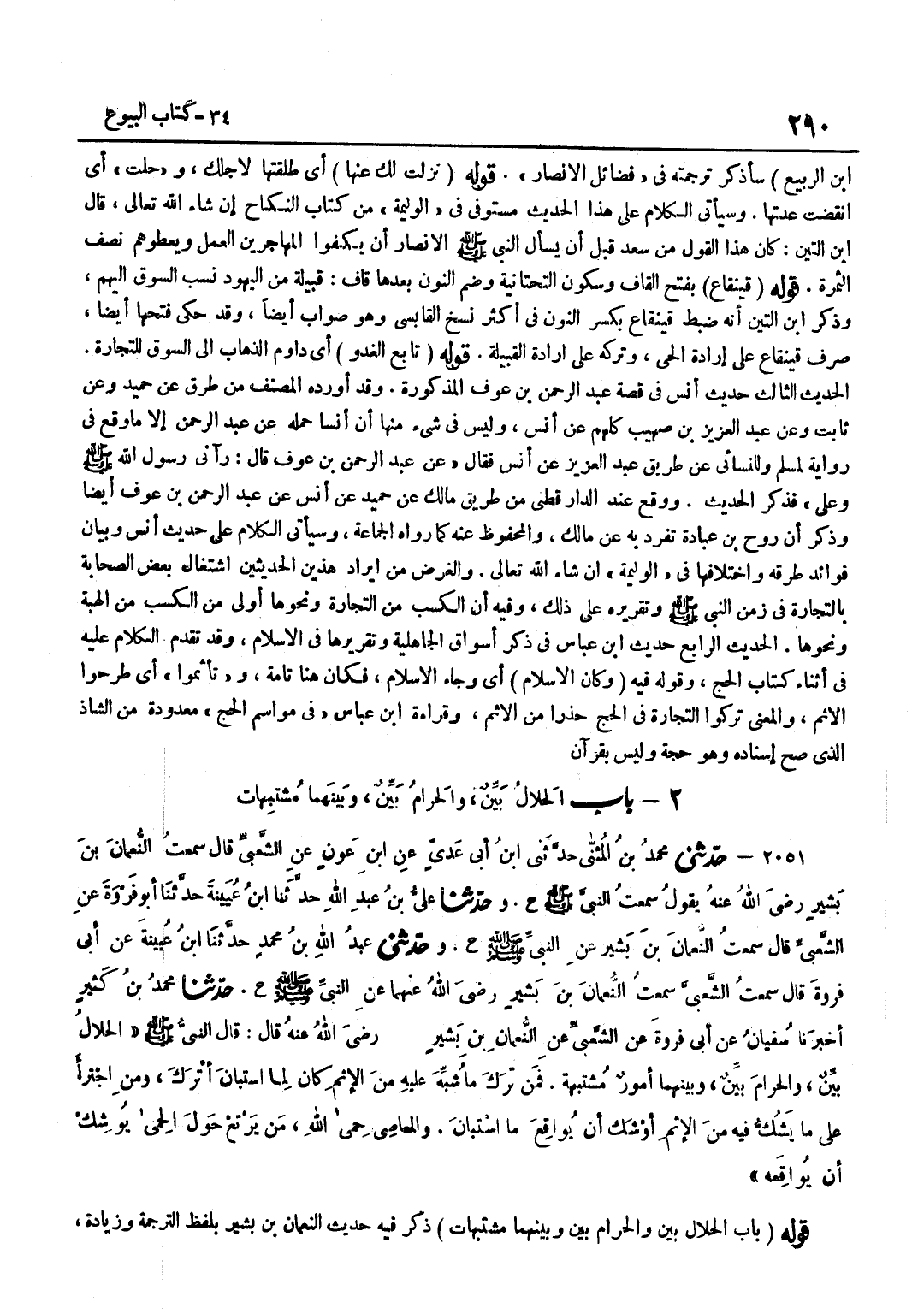 بْنِ الرَّبِيعِ سَأَذْكُرُ تَرْجَمَتَهُ فِي فَضَائِلِ الْأَنْصَارِ قَوْلُهُ نَزَلْتُ لَكَ عَنْهَا أَيْ طَلَّقْتُهَا لِأَجْلِكَ وحلت أَيِ انْقَضَتْ عِدَّتُهَا وَسَيَأْتِي الْكَلَامُ عَلَى هَذَا الْحَدِيثِ مُسْتَوْفًى فِي الْوَلِيمَةِ مِنْ كِتَابِ النِّكَاحِ إِنْ شَاءَ اللَّهُ تَعَالَى قَالَ بن التِّينِ كَانَ هَذَا الْقَوْلُ مِنْ سَعْدٍ قَبْلَ أَنْ يَسْأَلَ النَّبِيَّ صَلَّى اللَّهُ عَلَيْهِ وَسَلَّمَ الْأَنْصَارَ أَنْ يَكْفُوا الْمُهَاجِرِينَ الْعَمَلَ وَيُعْطُوهُمْ نِصْفَ الثَّمَرَةِ قَوْلُهُ قَيْنُقَاعَ بِفَتْحِ الْقَافِ وَسُكُونِ التَّحْتَانِيَّةِ وَضَمِّ النُّونِ بَعْدَهَا قَافٌ قَبِيلَةٌ مِنَ الْيَهُودِ نسب السُّوق إِلَيْهِم وَذكر بن التِّينِ أَنَّهُ ضُبِطَ قَيْنِقَاعُ بِكَسْرِ النُّونِ فِي أَكْثَرِ نُسَخِ الْقَابِسِيِّ وَهُوَ صَوَابٌ أَيْضًا وَقَدْ حُكِيَ فَتْحُهَا أَيْضًا صَرْفُ قَيْنُقَاعَ عَلَى إِرَادَةِ الْحَيِّ وَتَرْكُهُ عَلَى إِرَادَةِ الْقَبِيلَةِ قَوْلُهُ تَابَعَ الْغُدُوَّ أَيْ دَاوَمَ الذَّهَابَ إِلَى السُّوقِ لِلتِّجَارَةِ الْحَدِيثُ الثَّالِثُ حَدِيثُ أَنَسٍ فِي قِصَّةِ عَبْدِ الرَّحْمَنِ بْنِ عَوْف الْمَذْكُورَة وَقد أَوْرَدَهُ الْمُصَنِّفُ مِنْ طُرُقٍ عَنْ حُمَيْدٍ وَعَنْ ثَابِتٍ وَعَنْ عَبْدِ الْعَزِيزِ بْنِ صُهَيْبٍ كُلُّهُمْ عَنْ أَنَسٍ وَلَيْسَ فِي شَيْءٍ مِنْهَا أَنَّ أَنَسًا حَمَلَهُ عَنْ عَبْدِ الرَّحْمَنِ إِلَّا مَا وَقَعَ فِي رِوَايَةٍ لِمُسْلِمٍ وَلِلنَّسَائِيِّ عَنْ طَرِيقِ عَبْدِ الْعَزِيزِ عَنْ أَنَسٍ فَقَالَ عَنْ عَبْدِ الرَّحْمَنِ بْنِ عَوْفٍ قَالَ رَآنِي رَسُولُ اللَّهِ صَلَّى اللَّهُ عَلَيْهِ وَسَلَّمَ وَعَلَى فَذَكَرَ الْحَدِيثَ وَوَقَعَ عِنْدَ الدَّارَقُطْنِيِّ مِنْ طَرِيقِ مَالِكٍ عَنْ حُمَيْدٍ عَنْ أَنَسٍ عَنْ عَبْدِ الرَّحْمَنِ بْنِ عَوْفٍ أَيْضًا وَذَكَرَ أَنَّ رَوْحَ بْنَ عُبَادَةَ تَفَرَّدَ بِهِ عَنْ مَالِكٍ وَالْمَحْفُوظُ عَنْهُ كَمَا رَوَاهُ الْجَمَاعَةُ وَسَيَأْتِي الْكَلَامُ عَلَى حَدِيثِ أَنَسٍ وَبَيَانُ فَوَائِدِ طُرُقِهِ وَاخْتِلَافِهَا فِي الْوَلِيمَةِ إِنْ شَاءَ اللَّهُ تَعَالَى وَالْغَرَضُ مِنْ إِيرَادِ هَذَيْنِ الْحَدِيثَيْنِ اشْتِغَالُ بَعْضِ الصَّحَابَةِ بِالتِّجَارَةِ فِي زَمَنِ النَّبِيِّ صَلَّى اللَّهُ عَلَيْهِ وَسَلَّمَ وَتَقْرِيرُهُ عَلَى ذَلِكَ وَفِيهِ أَنَّ الْكَسْبَ مِنَ التِّجَارَةِ وَنَحْوِهَا أَوْلَى مِنَ الْكَسْبِ مِنَ الْهِبَةِ وَنَحْوِهَا الْحَدِيثُ الرَّابِع حَدِيث بن عَبَّاسٍ فِي ذِكْرِ أَسْوَاقِ الْجَاهِلِيَّةِ وَتَقْرِيرِهَا فِي الْإِسْلَام وَقد تَقَدَّمَ الْكَلَامُ عَلَيْهِ فِي أَثْنَاءِ كِتَابِ الْحَجِّ وَقَوْلُهُ فِيهِ وَكَانَ الْإِسْلَامُ أَيْ وَجَاءَ الْإِسْلَامُ فَكَانَ هُنَا تَامَّة وتأثموا أَيْ طَرَحُوا الْإِثْمَ وَالْمَعْنَى تَرَكُوا التِّجَارَةَ فِي الْحَج حذرا من الْإِثْم وَقِرَاءَة بن عَبَّاسٍ فِي مَوَاسِمِ الْحَجِّ مَعْدُودَةٌ مِنَ الشَّاذِّ الَّذِي صَحَّ إِسْنَادُهُ وَهُوَ حُجَّةٌ وَلَيْسَ بِقُرْآنٍ