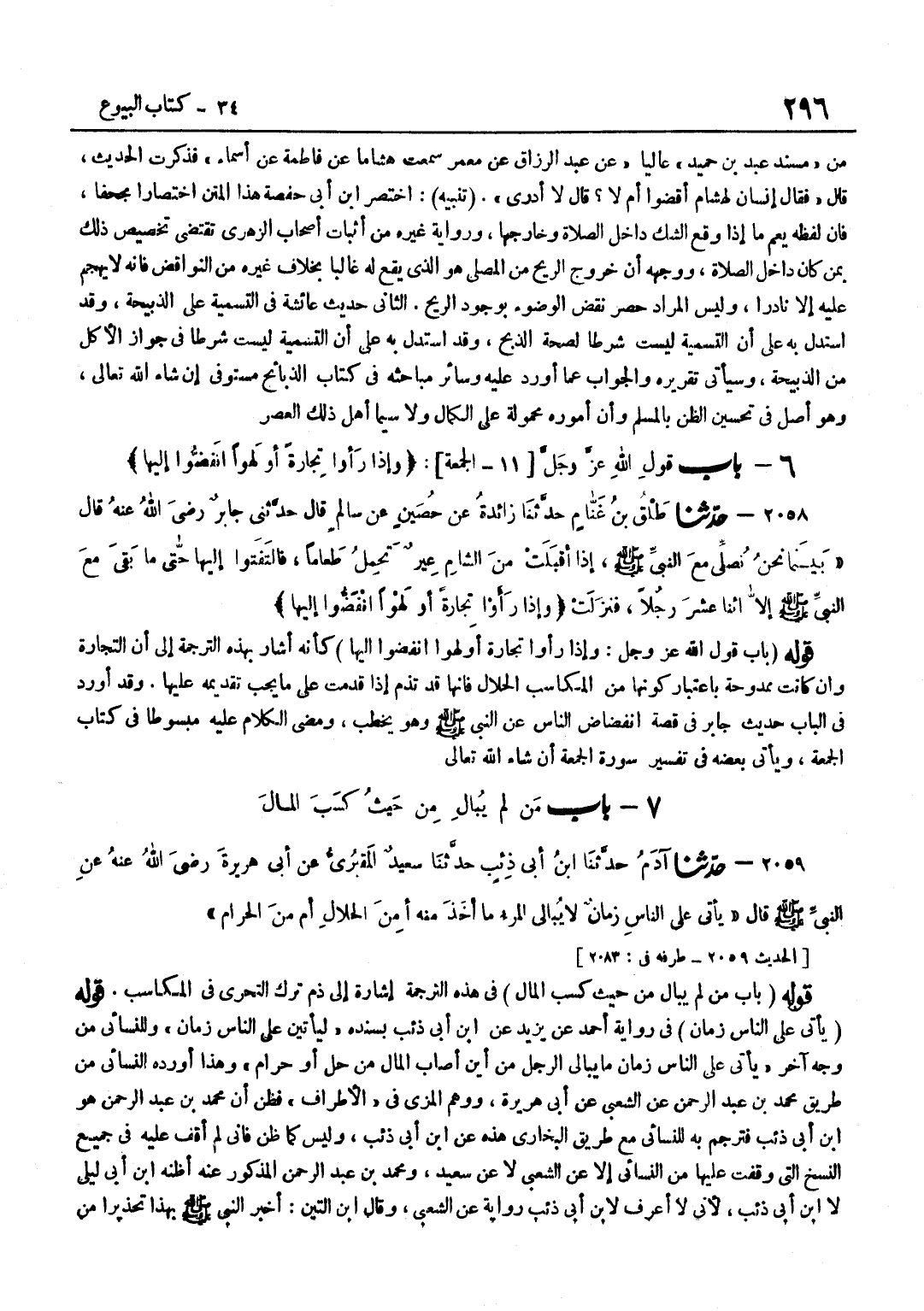 [2059] قَوْلُهُ يَأْتِي عَلَى النَّاسِ زَمَانٌ فِي رِوَايَةِ أَحْمَدَ عَنْ يزِيد عَن بن أَبِي ذِئْبٍ بِسَنَدِهِ لَيَأْتِيَنَّ عَلَى النَّاسِ زَمَانٌ وَلِلنَّسَائِيِّ مِنْ وَجْهٍ آخَرَ يَأْتِي عَلَى النَّاسِ زَمَانُ مَا يُبَالِي الرَّجُلُ مِنْ أَيْنَ أَصَابَ الْمَالَ مِنْ حِلٍّ أَوْ حَرَامٍ وَهَذَا أَوْرَدَهُ النَّسَائِيُّ مِنْ طَرِيقِ مُحَمَّدِ بْنِ عَبْدِ الرَّحْمَنِ عَنْ الشَّعْبِيِّ عَنْ أَبِي هُرَيْرَةَ وَوَهَمَ الْمِزِّيُّ فِي الْأَطْرَافِ فَظَنَّ أَنَّ مُحَمَّدَ بْنَ عَبْدِ الرَّحْمَن هُوَ بن أَبِي ذِئْبٍ فَتَرْجَمَ بِهِ لِلنَّسَائِيِّ مَعَ طَرِيقِ البُخَارِيّ هَذِه عَن بن أَبِي ذِئْبٍ وَلَيْسَ كَمَا ظَنَّ فَإِنِّي لَمْ أَقِفْ عَلَيْهِ فِي جَمِيعِ النُّسَخِ الَّتِي وَقَفْتُ عَلَيْهَا مِنَ النَّسَائِيِّ إِلَّا عَنِ الشَّعْبِيِّ لَا عَنْ سَعِيدٍ وَمُحَمَّدُ بْنُ عَبْدِ الرَّحْمَنِ الْمَذْكُورُ عَنهُ أَظُنهُ بن أبي ليلى لَا بن أَبِي ذِئْبٍ لِأَنِّي لَا أَعْرِفُ لِابْنِ أَبِي ذِئْب رِوَايَة عَن الشّعبِيّ وَقَالَ بن التِّينِ أَخْبَرَ النَّبِيُّ صَلَّى اللَّهُ عَلَيْهِ وَسَلَّمَ بِهَذَا تحذيرا