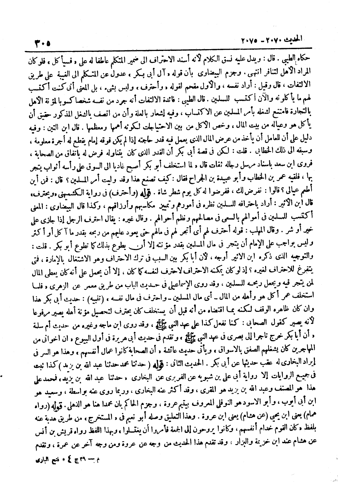 حَكَاهُ الطِّيبِيُّ قَالَ وَيَدُلُّ عَلَيْهِ نَسَقُ الْكَلَامِ لِأَنَّهُ أَسْنَدَ الِاحْتِرَافَ إِلَى ضَمِيرِ الْمُتَكَلِّمِ عَاطِفًا لَهُ على فسيأكل فلوكان الْمُرَادُ الْأَهْلَ لَتَنَافَرَ انْتَهَى وَجَزَمَ الْبَيْضَاوِيُّ بِأَنَّ قَوْلَهُ آلُ أَبِي بَكْرٍ عُدُولٌ عَنِ الْمُتَكَلِّمِ إِلَى الْغَيْبَةِ عَلَى طَرِيقِ الِالْتِفَاتِ قَالَ وَقِيلَ أَرَادَ نَفْسَهُ وَالْأَوَّلُ مُقْحَمٌ لِقَوْلِهِ وَأَحْتَرِفُ وَلَيْسَ بِشَيْءٍ بَلِ الْمَعْنَى أَنِّي كُنْتُ أَكْتَسِبُ لَهُمْ مَا يَأْكُلُونَهُ وَالْآنَ أَكْتَسِبُ لِلْمُسْلِمِينَ قَالَ الطِّيبِيُّ فَائِدَةُ الِالْتِفَاتِ أَنَّهُ جَرَّدَ مِنْ نَفْسِهِ شَخْصًا كَسُوبًا لِمُؤْنَةِ الْأَهْلِ بِالتِّجَارَةِ فَامْتَنَعَ لِشُغْلِهِ بِأَمْرِ الْمُسْلِمِينَ عَنِ الِاكْتِسَابِ وَفِيهِ إِشْعَارٌ بِالْعِلَّةِ وَأَنَّ مَنِ اتَّصَفَ بِالشُّغْلِ الْمَذْكُورِ حَقِيقٌ أَنْ يَأْكُلَ هُوَ وَعِيَالُهُ مِنْ بَيْتِ الْمَالِ وَخَصَّ الْأَكْلَ مِنْ بَيْنِ الِاحْتِيَاجَاتِ لِكَوْنِهِ أَهَمَّهَا وَمُعْظَمَهَا قَالَ بن التِّينِ وَفِيهِ دَلِيلٌ عَلَى أَنَّ لِلْعَامِلِ أَنْ يَأْخُذَ مِنْ عَرَضِ الْمَالِ الَّذِي يَعْمَلُ فِيهِ قَدْرَ حَاجَتِهِ إِذَا لَمْ يَكُنْ فَوْقَهُ إِمَامٌ يَقْطَعُ لَهُ أُجْرَةً مَعْلُومَةً وَسَبَقَهُ إِلَى ذَلِكَ الْخَطَّابِيُّ قُلْتُ لَكِنْ فِي قِصَّةِ أَبِي بَكْرٍ أَنَّ الْقَدْرَ الَّذِي كَانَ يَتَنَاوَلُهُ فُرِضَ لَهُ بِاتِّفَاق من الصَّحَابَة فروى بن سَعْدٍ بِإِسْنَادٍ مُرْسَلٍ رِجَالُهُ ثِقَاتٌ قَالَ لَمَّا اسْتُخْلِفَ أَبُو بَكْرٍ أَصْبَحَ غَادِيًا إِلَى السُّوقِ عَلَى رَأْسِهِ أَثْوَابٌ يَتَّجِرُ بِهَا فَلَقِيَهُ عُمَرُ بْنُ الْخَطَّابِ وَأَبُو عُبَيْدَةَ بْنُ الْجَرَّاحِ فَقَالَ كَيْفَ تَصْنَعُ هَذَا وَقَدْ وُلِّيتَ أَمْرَ الْمُسْلِمِينَ قَالَ فَمِنْ أَيْنَ أُطْعِمُ عِيَالِي قَالُوا نَفْرِضُ لَك فَفَرَضُوا لَهُ كُلَّ يَوْمٍ شَطْرَ شَاةٍ قَوْلُهُ وَأَحْتَرِفُ فِي رِوَايَةِ الْكُشْمِيهَنِيِّ وَيَحْتَرِفُ قَالَ بن الْأَثِيرِ أَرَادَ بِاحْتِرَافِهِ لِلْمُسْلِمِينَ نَظَرَهُ فِي أُمُورِهِمْ وَتَمْيِيزَ مَكَاسِبِهِمْ وَأَرْزَاقِهِمْ وَكَذَا قَالَ الْبَيْضَاوِيُّ الْمَعْنَى أَكْتَسِبُ لِلْمُسْلِمِينَ فِي أَمْوَالِهِمْ بِالسَّعْيِ فِي مَصَالِحِهِمْ وَنَظْمِ أَحْوَالِهِمْ وَقَالَ غَيْرُهُ يُقَالُ احْتَرَفَ الرَّجُلُ إِذَا جَازَى عَلَى خَيْرٍ أَوْ شَرٍّ وَقَالَ الْمُهَلَّبُ قَوْلُهُ أَحْتَرِفُ لَهُمْ أَيْ أَتَّجِرُ لَهُمْ فِي مَالِهِمْ حَتَّى يَعُودَ عَلَيْهِمْ مِنْ رِبْحِهِ بِقَدْرِ مَا آكُلُ أَوْ أَكْثَرُ وَلَيْسَ بِوَاجِبٍ عَلَى الْإِمَامِ أَنْ يَتَّجِرَ فِي مَالِ الْمُسْلِمِينَ بِقَدْرِ مُؤْنَتِهِ إِلَّا أَنْ يَطَّوَّعَ بِذَلِكَ كَمَا تَطَوَّعَ أَبُو بَكْرٍ قُلْتُ وَالتَّوْجِيهُ الَّذِي ذَكَرَهُ بن الْأَثِيرِ أَوْجَهُ لِأَنَّ أَبَا بَكْرٍ بَيَّنَ السَّبَبَ فِي تَرْكِ الِاحْتِرَافِ وَهُوَ الِاشْتِغَالُ بِالْإِمَارَةِ فَمَتَى يَتَفَرَّغُ لِلِاحْتِرَافِ لِغَيْرِهِ إِذْ لَوْ كَانَ يُمْكِنُهُ الِاحْتِرَافُ لَاحْتَرَفَ لِنَفْسِهِ كَمَا كَانَ إِلَّا أَنْ يُحْمَلَ عَلَى أَنَّهُ كَانَ يُعْطِي الْمَالَ لِمَنْ يَتَّجِرُ فِيهِ وَيَجْعَلُ رِبْحَهُ لِلْمُسْلِمِينَ وَقَدْ رَوَى الْإِسْمَاعِيلِيُّ فِي حَدِيثِ الْبَابِ مِنْ طَرِيقِ مَعْمَرٍ عَنِ الزُّهْرِيِّ فَلَمَّا اسْتُخْلِفَ عُمَرُ أَكَلَ هُوَ وَأَهْلُهُ مِنَ الْمَالِ أَيْ مَالِ الْمُسْلِمِينَ وَاحْتَرَفَ فِي مَالِ نَفْسِهِ تَنْبِيهٌ حَدِيثُ أَبِي بَكْرٍ هَذَا وَإِنْ كَانَ ظَاهِرُهُ الْوَقْفَ لَكِنَّهُ بِمَا اقْتَضَاهُ مِنْ أَنَّهُ قَبْلَ أَنْ يُسْتَخ