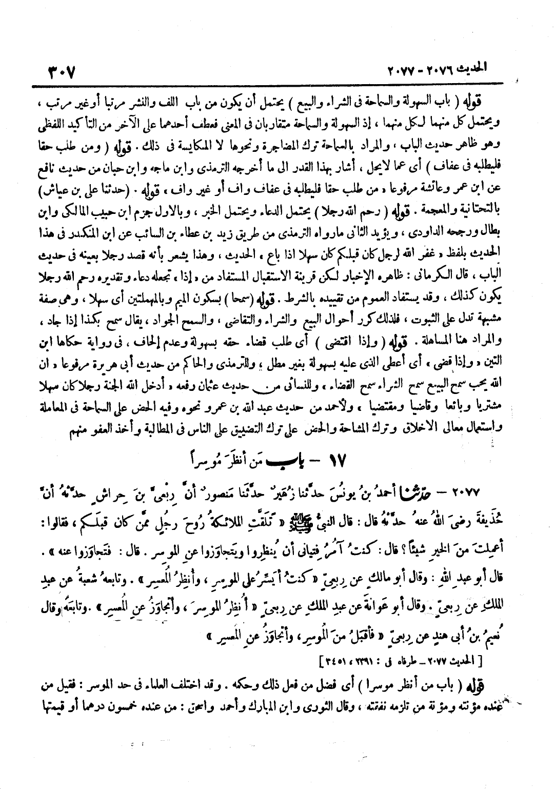 [2076] قَوْلُهُ حَدَّثَنَا عَلِيُّ بْنُ عَيَّاشٍ بِالتَّحْتَانِيَّةِ وَالْمُعْجَمَةِ قَوْلُهُ رَحِمَ اللَّهُ رَجُلًا يَحْتَمِلُ الدُّعَاءَ وَيَحْتَمِلُ الْخَبَرَ وبالاول جزم بن حبيب الْمَالِكِي وبن بَطَّالٍ وَرَجَّحَهُ الدَّاوُدِيُّ وَيُؤَيِّدُ الثَّانِيَ مَا رَوَاهُ التِّرْمِذِيُّ مِنْ طَرِيقِ زَيْدِ بْنِ عَطَاءِ بْنِ السَّائِب عَن بن الْمُنْكَدِرِ فِي هَذَا الْحَدِيثِ بِلَفْظِ غَفَرَ اللَّهُ لِرَجُلٍ كَانَ قَبْلَكُمْ كَانَ سَهْلًا إِذَا بَاعَ الحَدِيث وَهَذَا يشعربانه قَصَدَ رَجُلًا بِعَيْنِهِ فِي حَدِيثِ الْبَابِ قَالَ الْكِرْمَانِيُّ ظَاهِرُهُ الْإِخْبَارُ لَكِنَّ قَرِينَةَ الِاسْتِقْبَالِ الْمُسْتَفَادُ مِنْ إِذَا تَجْعَلُهُ دُعَاءً وَتَقْدِيرُهُ رَحِمَ اللَّهُ رَجُلًا يَكُونُ كَذَلِكَ وَقَدْ يُسْتَفَادُ الْعُمُومُ مِنْ تَقْيِيدِهِ بِالشَّرْطِ قَوْلُهُ سَمْحًا بِسُكُونِ الْمِيمِ وَبِالْمُهْمَلَتَيْنِ أَيْ سَهْلًا وَهِيَ صِفَةٌ مُشَبَّهَةٌ تَدُلُّ عَلَى الثُّبُوتِ فَلِذَلِكَ كَرَّرَ أَحْوَالَ الْبَيْعِ وَالشِّرَاءِ وَالتَّقَاضِي وَالسَّمْحُ الْجَوَادُ يُقَالُ سَمْحٌ بِكَذَا إِذَا جَادَ وَالْمُرَادُ هُنَا الْمُسَاهَلَةُ قَوْلُهُ وَإِذَا اقْتَضَى أَيْ طَلَبَ قَضَاءَ حَقِّهِ بِسُهُولَةٍ وَعَدَمِ إِلْحَافٍ فِي رِوَايَة حَكَاهَا بن التِّينِ وَإِذَا قَضَى أَيْ أَعْطَى الَّذِي عَلَيْهِ بِسُهُولَةٍ بِغَيْرِ مَطْلٍ وَلِلتِّرْمِذِيِّ وَالْحَاكِمِ مِنْ حَدِيثِ أَبِي هُرَيْرَةَ مَرْفُوعًا إِنَّ اللَّهَ يُحِبُّ سَمْحَ الْبَيْعِ سَمْحَ الشِّرَاءِ سَمْحَ الْقَضَاءِ وَلِلنَّسَائِيِّ مِنْ حَدِيثِ عُثْمَانَ رَفَعَهُ أَدْخَلَ اللَّهُ الْجَنَّةَ رَجُلًا كَانَ سَهْلًا مُشْتَرِيًا وَبَائِعًا وَقَاضِيًا وَمُقْتَضِيًا وَلِأَحْمَدَ مِنْ حَدِيثِ عَبْدِ اللَّهِ بْنِ عَمْرٍو نَحْوُهُ وَفِيهِ الْحَضُّ عَلَى السَّمَاحَةِ فِي الْمُعَامَلَةِ وَاسْتِعْمَالِ مَعَالِي الْأَخْلَاقِ وَتَرْكُ الْمُشَاحَةِ وَالْحَضُّ عَلَى تَرْكِ التَّضْيِيقِ عَلَى النَّاسِ فِي الْمُطَالَبَةِ وَأَخْذُ الْعَفْوِ مِنْهُم