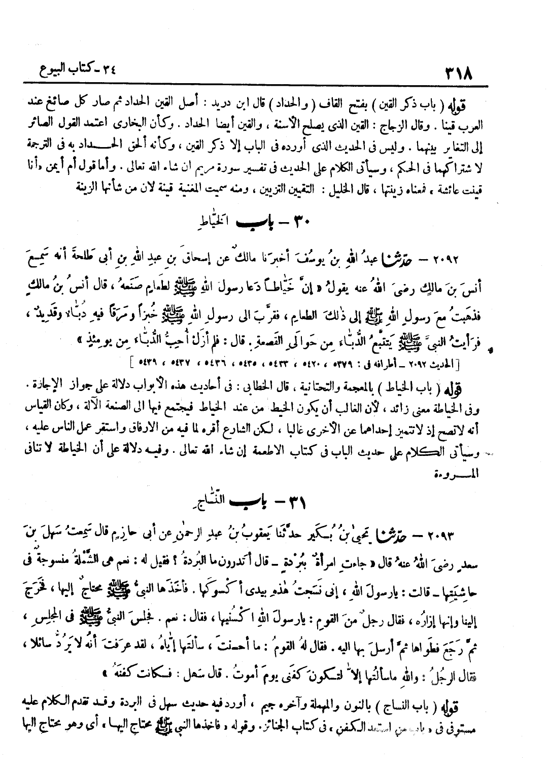 بِفَتْحِ الْقَافِ وَالْحَدَّادِ قَالَ بن دُرَيْدٍ أَصْلُ الْقَيْنِ الْحَدَّادُ ثُمَّ صَارَ كُلُّ صَائِغٍ عِنْدَ الْعَرَبِ قَيْنًا وَقَالَ الزَّجَّاجُ الْقَيْنُ الَّذِي يُصْلِحُ الْأَسِنَّةَ وَالْقَيْنُ أَيْضًا الْحَدَّادُ وَكَأَنَّ الْبُخَارِيَّ اعْتَمَدَ الْقَوْلَ الصَّائِرَ إِلَى التَّغَايُرِ بَيْنَهُمَا وَلَيْسَ فِي الْحَدِيثِ الَّذِي أَوْرَدَهُ فِي الْبَابِ إِلَّا ذِكْرُ الْقَيْنِ وَكَأَنَّهُ أَلْحَقَ الْحَدَّادَ بِهِ فِي التَّرْجَمَةِ لِاشْتِرَاكِهِمَا فِي الْحُكْمِ وَسَيَأْتِي الْكَلَامُ عَلَى الْحَدِيثِ فِي تَفْسِيرِ سُورَةِ مَرْيَمَ إِنْ شَاءَ اللَّهُ تَعَالَى وَأَمَّا قَوْلُ أُمِّ أَيْمَنَ أَنَا قَيَّنْتُ عَائِشَةَ فَمَعْنَاهُ زَيَّنْتُهَا قَالَ الْخَلِيلُ التَّقْيِينُ التَّزْيِينُ وَمِنْهُ سُمِّيَتِ الْمُغَنِّيَةُ قَيْنَةً لِأَنَّ من شانها الزِّينَة قَوْلُهُ بَابُ الْخَيَّاطِ بِالْمُعْجَمَةِ وَالتَّحْتَانِيَّةِ قَالَ الْخَطَّابِيُّ فِي أَحَادِيثِ هَذِهِ الْأَبْوَابِ دَلَالَةٌ عَلَى جَوَازِ الْإِجَازَةِ وَفِي الْخِيَاطَةِ مَعْنًى زَائِدٌ لِأَنَّ الْغَالِبَ أَنْ يَكُونَ الْخَيْطُ مِنْ عِنْدِ الْخَيَّاطِ فَيَجْتَمِعُ فِيهَا إِلَى الصَّنْعَةِ الْآلَةُ وَكَانَ الْقِيَاسُ أَنَّهُ لَا تَصِحُّ إِذْ لَا تَتَمَيَّزُ إِحْدَاهُمَا عَنِ الْأُخْرَى غَالِبًا لَكِنَّ الشَّارِعَ أَقَرَّهُ لِمَا فِيهِ مِنَ الْإِرْفَاقِ وَاسْتَقَرَّ عَمَلُ النَّاسِ عَلَيْهِ وَسَيَأْتِي الْكَلَامُ عَلَى حَدِيثِ الْبَابِ فِي كِتَابِ الْأَطْعِمَةِ إِنْ شَاءَ اللَّهُ تَعَالَى وَفِيهِ دَلَالَةٌ عَلَى أَن الْخياطَة لَا تنافى الْمُرُوءَة
