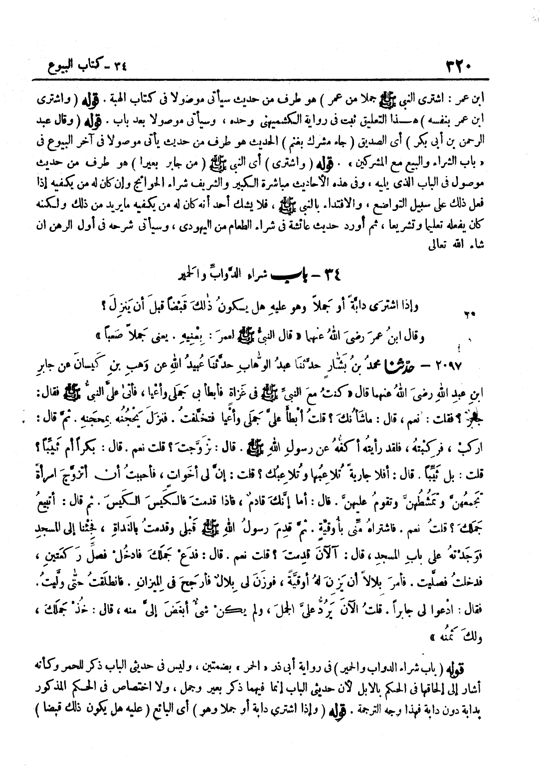 فِي رِوَايَةِ أَبِي ذَرٍّ الْحُمُرِ بِضَمَّتَيْنِ وَلَيْسَ فِي حَدِيثَيِ الْبَابِ ذِكْرٌ لِلْحُمُرِ وَكَأَنَّهُ أَشَارَ إِلَى إِلْحَاقِهَا فِي الْحُكْمِ بِالْإِبِلِ لِأَنَّ حَدِيثَيِ الْبَابِ إِنَّمَا فِيهِمَا ذِكْرُ بَعِيرٍ وَجَمَلٍ وَلَا اخْتِصَاصَ فِي الْحُكْمِ الْمَذْكُورِ بِدَابَّةٍ دُونَ دَابَّةٍ فَهَذَا وَجْهُ التَّرْجَمَةِ قَوْلُهُ وَإِذَا اشْتَرَى دَابَّةً أَوْ جَمَلًا وَهُوَ أَيِ الْبَائِعُ عَلَيْهِ هَلْ يَكُونُ ذَلِكَ قبضا