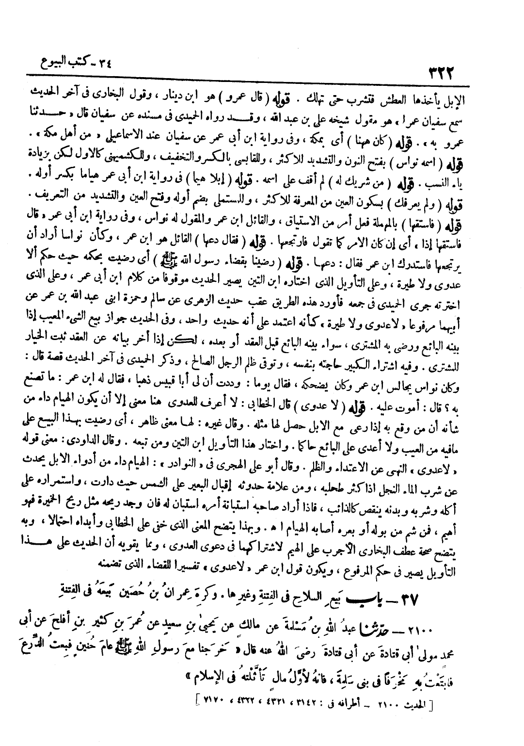 [2099] قَوْلُهُ قَالَ عَمْرو هُوَ بن دِينَارٍ وَقَوْلُ الْبُخَارِيِّ فِي آخِرِ الْحَدِيثِ سَمِعَ سُفْيَانُ عَمْرًا هُوَ مَقُولُ شَيْخِهِ عَلِيِّ بْنِ عَبْدِ اللَّهِ وَقَدْ رَوَاهُ الْحُمَيْدِيُّ فِي مُسْنَدِهِ عَنْ سُفْيَانَ قَالَ حَدَّثَنَا عَمْرٌو بِهِ قَوْلُهُ كَانَ هَا هُنَا أَي بِمَكَّة وَفِي رِوَايَة بن أَبِي عُمَرَ عَنْ سُفْيَانَ عِنْدَ الْإِسْمَاعِيلِيِّ مِنْ أَهْلِ مَكَّةَ قَوْلُهُ اسْمُهُ نَوَّاسٌ بِفَتْحِ النُّونِ وَالتَّشْدِيدِ لِلْأَكْثَرِ وَلِلْقَابِسِيُّ بِالْكَسْرِ وَالتَّخْفِيفِ ولِلْكُشْمِيهَنِيِّ كَالْأَوَّلِ لَكِنْ بِزِيَادَةِ يَاءِ النَّسَبِ قَوْلُهُ مِنْ شَرِيكٍ لَهُ لَمْ أَقِفْ عَلَى اسْمِهِ قَوْلُهُ إِبِلًا هيما فِي رِوَايَة بن أَبِي عُمَرَ هِيَامًا بِكَسْرِ أَوَّلِهِ قَوْلُهُ وَلَمْ يَعْرِفْكَ بِسُكُونِ الْعَيْنِ مِنَ الْمَعْرِفَةِ لِلْأَكْثَرِ وَلِلْمُسْتَمْلِي بِضَمِّ أَوَّلِهِ وَفَتْحِ الْعَيْنِ وَالتَّشْدِيدِ مِنَ التَّعْرِيفِ قَوْلُهُ فَاسْتَقِهَا بِالْمُهْمَلَةِ فِعْلُ أَمْرٍ مِنَ الِاسْتِيَاقِ وَالْقَائِل هُوَ بن عمر وَالْمقول لَهُ نواس وَفِي رِوَايَة بن أَبِي عُمَرَ قَالَ فَاسْتَقِهَا إِذًا أَيْ إِنْ كَانَ الْأَمْرُ كَمَا تَقُولُ فَارْتَجِعْهَا قَوْلُهُ فَقَالَ دعها الْقَائِل هُوَ بن عُمَرَ وَكَأَنَّ نَوَّاسًا أَرَادَ أَنْ يَرْتَجِعَهَا فَاسْتَدْرَكَ بن عُمَرَ فَقَالَ دَعْهَا قَوْلُهُ رَضِينَا بِقَضَاءِ رَسُولِ اللَّهِ صَلَّى اللَّهُ عَلَيْهِ وَسَلَّمَ أَيْ رَضِيتُ بِحُكْمِهِ حَيْثُ حَكَمَ أَلَّا عَدْوَى وَلَا طِيَرَةَ وعَلى التَّأْوِيل الَّذِي اخْتَارَهُ بن التِّين يصير الحَدِيث مَوْقُوفا من كَلَام بن أَبِي عُمَرَ وَعَلَى الَّذِي اخْتَرْتُهُ جَرَى الْحَمِيدِيُّ فِي جَمْعِهِ فَأَوْرَدَ هَذِهِ الطَّرِيقَ عَقِبَ حَدِيثِ الزُّهْرِيِّ عَنْ سَالِمٍ وَحَمْزَةَ ابْنَيْ عَبْدِ اللَّهِ بْنِ عُمَرَ عَنْ أَبِيهِمَا مَرْفُوعًا لَا عَدْوَى وَلَا طِيَرَةَ كَأَنَّهُ اعْتَمَدَ عَلَى أَنَّهُ حَدِيثٌ وَاحِدٌ وَفِي الْحَدِيثِ جَوَازُ بَيْعِ الشَّيْءِ الْمَعِيبِ إِذَا بَيَّنَهُ الْبَائِعُ وَرَضِيَ بِهِ الْمُشْتَرِي سَوَاءٌ بَيَّنَهُ الْبَائِعُ قَبْلَ الْعَقْدِ أَوْ بَعْدَهُ لَكِنْ إِذَا أَخَّرَ بَيَانَهُ عَنِ الْعَقْدِ ثَبَتَ الْخِيَارُ لِلْمُشْتَرِي وَفِيهِ اشْتِرَاءُ الْكَبِيرِ حَاجَتَهُ بِنَفْسِهِ وَتَوَقِّي ظُلْمِ الرَّجُلِ الصَّالِحِ وَذَكَرَ الْحُمَيْدِيُّ فِي آخِرِ الحَدِيث قصَّة قَالَ وَكَانَ نواس يُجَالس بن عُمَرَ وَكَانَ يُضْحِكُهُ فَقَالَ يَوْمًا وَدِدْتَ أَنَّ لي أَبَا قبيس ذَهَبا فَقَالَ لَهُ بن عُمَرَ مَا تَصْنَعُ بِهِ قَالَ أَمُوتُ عَلَيْهِ قَوْلُهُ لَا عَدْوَى قَالَ الْخَطَّابِيُّ لَا أَعْرِفُ لِلْعَدْوَى هُنَا مَعْنَى إِلَّا أَنْ يَكُونَ الْهُيَامُ دَاءً مِنْ شَأْنِهِ أَنَّ مَنْ وَقَعَ بِهِ إِذَا رَعَى مَعَ الْإِبِلِ حَصَلَ لَهَا مِثْلُهُ وَقَالَ غَيْرُهُ لَهَا مَعْنًى ظَاهِرٌ أَيْ رَضِيتُ بِهَذَا الْبَيْعِ عَلَى مَا فِيهِ مِنَ الْعَيْبِ وَلَا أُعَدِّي عَلَى الْبَائِعِ حَاكِمًا وَاخْتَارَ هَذَا التَّأْوِيل بن التِّينِ وَمَنْ تَبِعَهُ وَقَالَ الدَّاوُدِيُّ مَعْنَى قَوْلِهِ لَا عَدْوَى النَّهْيُ عَنِ الِاعْتِدَاءِ وَالظُّلْمِ وَقَالَ أَبُو عَلِيٍّ الْهِجْرِيُّ فِي النَّوَادِرِ الْهُيَامُ دَاءٌ مِنْ أَدْوَاءِ الْإِبِلِ يَحْدُثُ عَنْ شُرْبِ الْمَاءِ النَّجْلِ إِذَا كَثُرَ طُحْلُبُهُ وَمِنْ عَلَامَةِ حُدُوثِهِ إِقْبَالُ الْبَعِيرِ عَلَى الشَّمْسِ حَيْثُ دَارَتْ وَاسْتِمْرَارُهُ عَلَى أَكْلِهِ وَشُرْبِهِ وَبَدَنُهُ يَنْقُصُ كَالذَّائِبِ فَإِذَا أَرَادَ صَاحِبُهُ اسْتِبَانَةَ أَمْرِهِ اسْتَبَانَ لَهُ فَإِنْ وَجَدَ رِي