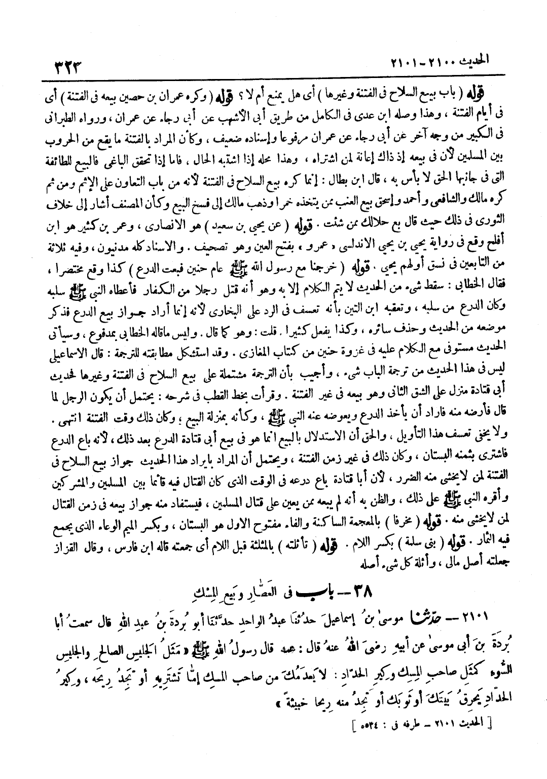 [2100] قَوْلُهُ عَنْ يَحْيَى بْنِ سَعِيدٍ هُوَ الْأَنْصَارِيُّ وَعمر بن كثير هُوَ بن أَفْلَحَ وَقَعَ فِي رِوَايَةِ يَحْيَى بْنِ يَحْيَى الْأَنْدَلُسِيِّ عَمْرٌو بِفَتْحِ الْعَيْنِ وَهُوَ تَصْحِيفٌ وَالْإِسْنَادُ كُلُّهُ مَدَنِيُّونَ وَفِيهِ ثَلَاثَةٌ مِنَ التَّابِعِينَ فِي نَسَقٍ أَوَّلُهُمْ يَحْيَى قَوْلُهُ خَرَجْنَا مَعَ رَسُولِ اللَّهِ صَلَّى اللَّهُ عَلَيْهِ وَسَلَّمَ عَامَ حُنَيْنٍ فَبِعْتُ الدِّرْعَ كَذَا وَقَعَ مُخْتَصَرًا فَقَالَ الْخَطَّابِيُّ سَقَطَ شَيْءٌ مِنَ الْحَدِيثِ لَا يَتِمُّ الْكَلَامُ إِلَّا بِهِ وَهُوَ أَنَّهُ قَتَلَ رَجُلًا مِنَ الْكُفَّارِ فَأَعْطَاهُ النَّبِيُّ صَلَّى اللَّهُ عَلَيْهِ وَسَلَّمَ سلبه وَكَانَ الدرْع من سلبه وَتعقبه بن التِّينِ بِأَنَّهُ تَعَسُّفٌ فِي الرَّدِّ عَلَى الْبُخَارِيِّ لِأَنَّهُ إِنَّمَا أَرَادَ جَوَازَ بَيْعِ الدِّرْعِ فَذَكَرَ مَوْضِعَهُ مِنَ الْحَدِيثِ وَحَذَفَ سَائِرَهُ وَكَذَا يَفْعَلُ كَثِيرًا قُلْتُ وَهُوَ كَمَا قَالَ وَلَيْسَ مَا قَالَه الْخطابِيّ بمدفوع وَسَيَأْتِي الحَدِيث مُسْتَوفى مَعَ الْكَلَامِ عَلَيْهِ فِي غَزْوَةِ حُنَيْنٍ مِنْ كِتَابِ الْمَغَازِي وَقَدِ اسْتُشْكِلَ مُطَابِقَتُهُ لِلتَّرْجَمَةِ قَالَ الْإِسْمَاعِيلِيُّ لَيْسَ فِي هَذَا الْحَدِيثِ مِنْ تَرْجَمَةِ الْبَابِ شَيْءٌ وَأُجِيبَ بِأَنَّ التَّرْجَمَةَ مُشْتَمِلَةٌ عَلَى بَيْعِ السِّلَاحِ فِي الْفِتْنَةِ وَغَيْرِهَا فَحَدِيثُ أَبِي قَتَادَةَ مُنَزَّلٌ عَلَى الشِّقِّ الثَّانِي وَهُوَ بَيْعُهُ فِي غَيْرِ الْفِتْنَةِ وَقَرَأْتُ بِخَطِّ الْقُطْبِ فِي شَرْحِهِ يُحْتَمَلُ أَنْ يَكُونَ الرَّجُلُ لَمَّا قَالَ فَأَرْضِهِ مِنْهُ فَأَرَادَ أَنْ يَأْخُذَ الدِّرْعَ وَيُعَوِّضَهُ عَنْهُ النَّبِيُّ صَلَّى اللَّهُ عَلَيْهِ وَسَلَّمَ وَكَأَنَّهُ بِمَنْزِلَةِ الْبَيْعِ وَكَانَ ذَلِكَ وَقْتَ الْفِتْنَةِ انْتَهَى وَلَا يَخْفَى تَعَسُّفُ هَذَا التَّأْوِيلِ وَالْحَقُّ أَنَّ الِاسْتِدْلَالَ بِالْبَيْعِ إِنَّمَا هُوَ فِي بَيْعِ أَبِي قَتَادَةَ الدِّرْعَ بَعْدَ ذَلِكَ لِأَنَّهُ بَاعَ الدِّرْعَ فَاشْتَرَى بِثَمَنِهِ الْبُسْتَانَ وَكَانَ ذَلِكَ فِي غَيْرِ زَمَنِ الْفِتْنَةِ وَيُحْتَمَلُ أَنَّ الْمُرَادَ بِإِيرَادِ هَذَا الْحَدِيثِ جَوَازُ بَيْعِ السِّلَاحِ فِي الْفِتْنَةِ لِمَنْ لَا يُخْشَى مِنْهُ الضَّرَرُ لِأَنَّ أَبَا قَتَادَةَ بَاعَ دِرْعَهُ فِي الْوَقْتِ الَّذِي كَانَ الْقِتَالُ فِيهِ قَائِمًا بَيْنَ الْمُسْلِمِينَ وَالْمُشْرِكِينَ وَأَقَرَّهُ النَّبِيُّ صَلَّى اللَّهُ عَلَيْهِ وَسَلَّمَ عَلَى ذَلِكَ وَالظَّنُّ بِهِ أَنَّهُ لَمْ يَبِعْهُ مِمَّنْ يُعِينُ عَلَى قِتَالِ الْمُسْلِمِينَ فَيُسْتَفَادُ مِنْهُ جَوَازُ بَيْعِهِ فِي زَمَنِ الْقِتَالِ لِمَنْ لَا يُخْشَى مِنْهُ قَوْلُهُ مَخْرَفًا بِالْمُعْجَمَةِ السَّاكِنَةِ وَالْفَاءِ مَفْتُوحُ الْأَوَّلِ هُوَ الْبُسْتَانُ وَبِكَسْرِ الْمِيمِ الْوِعَاءُ الَّذِي يُجْمَعُ فِيهِ الثِّمَارُ قَوْلُهُ بَنِي سَلَمَةَ بِكَسْرِ اللَّامِ قَوْلُهُ تَأَثَّلْتُهُ بِالْمُثَلَّثَةِ قَبْلَ اللَّامِ أَيْ جَمَعْتُهُ قَالَهُ بن فَارس وَقَالَ الْقَزاز جعلته أصل مَا لي وَاثِلَة كل شَيْء أَصله
