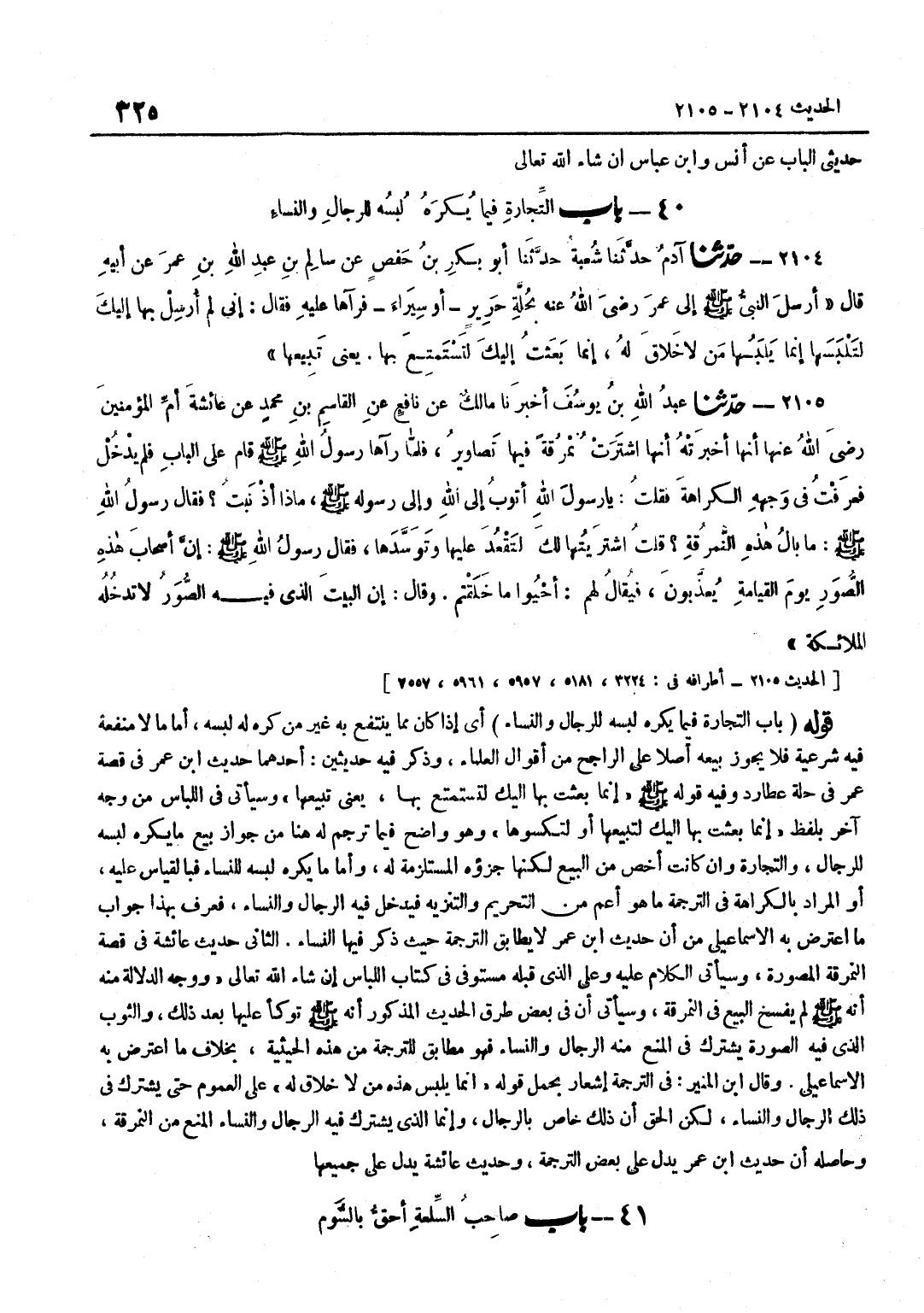[2104] قَوْلُهُ صَلَّى اللَّهُ عَلَيْهِ وَسَلَّمَ إِنَّمَا بَعَثْتُ بِهَا إِلَيْكَ لِتَسْتَمْتِعَ بِهَا يَعْنِي تَبِيعَهَا وَسَيَأْتِي فِي اللِّبَاسِ مِنْ وَجْهٍ آخَرَ بِلَفْظِ إِنَّمَا بَعَثْتُ بِهَا إِلَيْكَ لِتَبِيعَهَا أَوْ لِتَكْسُوَهَا وَهُوَ وَاضِحٌ فِيمَا تَرْجَمَ لَهُ هُنَا مِنْ جَوَازِ بَيْعِ مَا يُكْرَهُ لُبْسُهُ لِلرِّجَالِ وَالتِّجَارَةُ وَإِنْ كَانَتْ أَخَصَّ مِنَ الْبَيْعِ لَكِنَّهَا جُزْؤُهُ الْمُسْتَلْزِمَةُ لَهُ وَأَمَّا مَا يُكْرَهُ لُبْسُهُ لِلنِّسَاءِ فَبِالْقِيَاسِ عَلَيْهِ أَوِ الْمُرَادُ بِالْكَرَاهَةِ فِي التَّرْجَمَةِ مَا هُوَ أَعَمُّ مِنَ التَّحْرِيمِ وَالتَّنْزِيهِ فَيَدْخُلُ فِيهِ الرِّجَالُ وَالنِّسَاءُ فَعُرِفَ بِهَذَا جَوَابُ مَا اعْترض بِهِ الْإِسْمَاعِيلِيّ من أَن حَدِيث بن عُمَرَ لَا يُطَابِقُ التَّرْجَمَةَ حَيْثُ ذُكِرَ فِيهَا النِّسَاءُ الثَّانِي حَدِيثُ عَائِشَةَ فِي قِصَّةِ النُّمْرُقَةِ الْمُصَوَّرَةِ وَسَيَأْتِي الْكَلَامُ عَلَيْهِ وَعَلَى الَّذِي قَبْلَهُ مُسْتَوْفًى فِي كِتَابِ اللِّبَاسِ إِنْ شَاءَ اللَّهُ تَعَالَى وَوَجْهُ الدَّلَالَةِ مِنْهُ أَنَّهُ صَلَّى اللَّهُ عَلَيْهِ وَسَلَّمَ لَمْ يَفْسَخِ الْبَيْعَ فِي النُّمْرُقَةِ وَسَيَأْتِي أَنَّ فِي بَعْضِ طُرُقِ الْحَدِيثِ الْمَذْكُورِ أَنَّهُ صَلَّى اللَّهُ عَلَيْهِ وَسَلَّمَ تَوَكَّأَ عَلَيْهَا بَعْدَ ذَلِكَ وَالثَّوْبُ الَّذِي فِيهِ الصُّورَةُ يَشْتَرِكُ فِي الْمَنْعِ مِنْهُ الرِّجَالُ وَالنِّسَاءُ فَهُوَ مُطَابِقٌ لِلتَّرْجَمَةِ مِنْ هَذِهِ الْحَيْثِيَّةِ بِخِلَافِ مَا اعْتَرَضَ بِهِ الْإِسْمَاعِيلِيّ وَقَالَ بن الْمُنِيرِ فِي التَّرْجَمَةِ إِشْعَارٌ بِحَمْلِ قَوْلِهِ إِنَّمَا يَلْبَسُ هَذِهِ مَنْ لَا خَلَاقَ لَهُ عَلَى الْعُمُومِ حَتَّى يَشْتَرِكَ فِي ذَلِكَ الرِّجَالُ وَالنِّسَاءُ لَكِنَّ الْحَقَّ أَنَّ ذَلِكَ خَاصٌّ بِالرِّجَالِ وَإِنَّمَا الَّذِي يَشْتَرِكُ فِيهِ الرِّجَالُ وَالنِّسَاءُ الْمَنْعُ مِنَ النمرقة وَحَاصِله أَن حَدِيث بن عُمَرَ يَدُلُّ عَلَى بَعْضِ التَّرْجَمَةِ وَحَدِيثَ عَائِشَةَ يدل على جَمِيعهَا