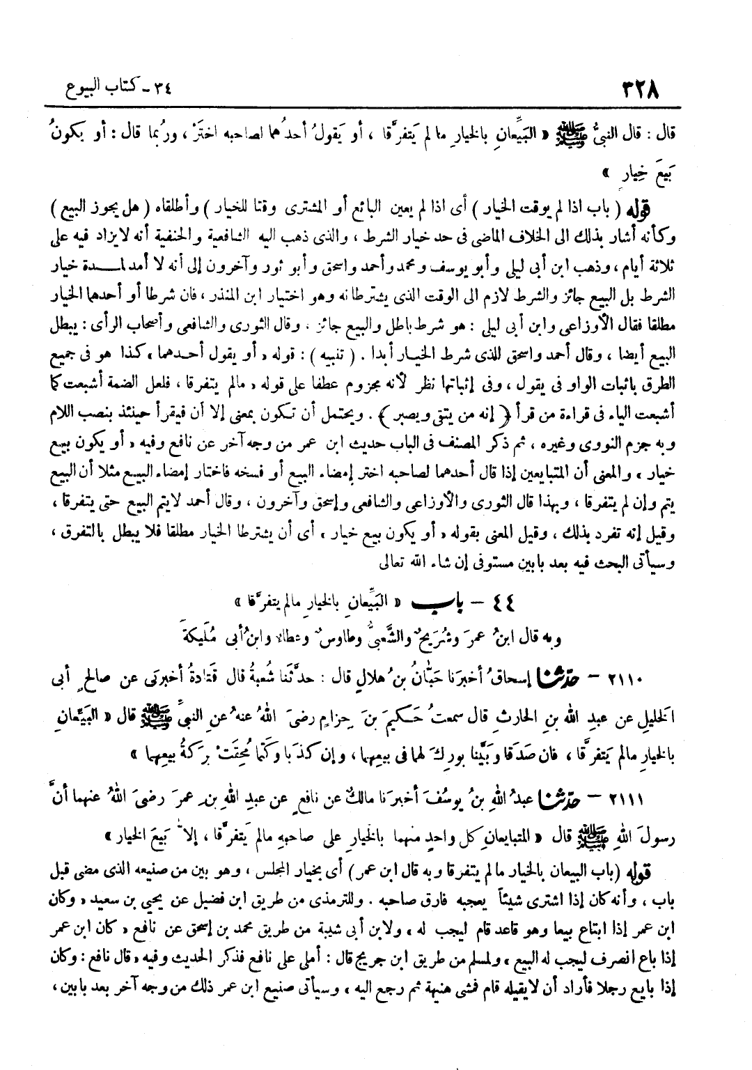أَيْ إِذَا لَمْ يُعَيِّنِ الْبَائِعُ أَوِ الْمُشْتَرِي وَقْتًا لِلْخِيَارِ وَأَطْلَقَاهُ هَلْ يَجُوزُ الْبَيْعُ وَكَأَنَّهُ أَشَارَ بِذَلِكَ إِلَى الْخِلَافِ الْمَاضِي فِي حَدِّ خِيَارِ الشَّرْطِ وَالَّذِي ذَهَبَ إِلَيْهِ الشَّافِعِيَّةُ وَالْحَنَفِيَّةُ أَنَّهُ لَا يُزَادُ فِيهِ عَلَى ثَلَاثَةِ أَيَّامٍ وَذَهَبَ بن أَبِي لَيْلَى وَأَبُو يُوسُفَ وَمُحَمَّدٌ وَأَحْمَدُ وَإِسْحَاقُ وَأَبُو ثَوْرٍ وَآخَرُونَ إِلَى أَنَّهُ لَا أَمَدَ لِمُدَّةِ خِيَارِ الشَّرْطِ بَلِ الْبَيْعُ جَائِزٌ وَالشَّرْطُ لَازِمٌ إِلَى الْوَقْتِ الَّذِي يَشْتَرِطَانِهِ وَهُوَ اخْتِيَارُ بن الْمُنْذِرِ فَإِنْ شَرَطَا أَوْ أَحَدُهُمَا الْخِيَارَ مُطْلَقًا فَقَالَ الْأَوْزَاعِيّ وبن أَبِي لَيْلَى هُوَ شَرْطٌ بَاطِلٌ وَالْبَيْعُ جَائِزٌ وَقَالَ الثَّوْرِيُّ وَالشَّافِعِيُّ وَأَصْحَابُ الرَّأْي يَبْطُلُ الْبَيْعُ أَيْضًا وَقَالَ أَحْمَدُ وَإِسْحَاقُ لِلَّذِي شَرَطَ الْخِيَارَ أَبَدًا تَنْبِيهٌ قَوْلُهُ أَوْ يَقُولُ أَحَدُهُمَا كَذَا هُوَ فِي جَمِيعِ الطُّرُقِ بِإِثْبَاتِ الْوَاوِ فِي يَقُولُ وَفِي إِثْبَاتِهَا نَظَرٌ لِأَنَّهُ مَجْزُومٌ عَطْفًا عَلَى قَوْلِهِ مَا لَمْ يَتَفَرَّقَا فَلَعَلَّ الضَّمَّةَ أُشْبِعَتْ كَمَا أُشْبِعَتِ الْيَاءُ فِي قِرَاءَةِ مَنْ قَرَأَ أَنه من يَتَّقِي ويصبر وَيُحْتَمَلُ أَنْ تَكُونَ بِمَعْنَى إِلَّا أَنْ فَيُقْرَأَ حِينَئِذٍ بِنَصْبِ اللَّامِ وَبِهِ جَزَمَ النَّوَوِيُّ وَغَيْرُهُ ثمَّ ذكر المُصَنّف فِي الْبَاب حَدِيث بن عُمَرَ مِنْ وَجْهٍ آخَرَ عَنْ نَافِعٍ وَفِيهِ أَوْ يَكُونُ بَيْعَ خِيَارٍ وَالْمَعْنَى أَنَّ الْمُتَبَايِعَيْنِ إِذَا قَالَ أَحَدُهُمَا لِصَاحِبِهِ اخْتَرْ إِمْضَاءَ الْبَيْعِ أَوْ فَسْخَهُ فَاخْتَارَ إِمْضَاءَ الْبَيْعِ مَثَلًا أَنَّ الْبَيْعَ يَتِمُّ وَإِنْ لَمْ يَتَفَرَّقَا وَبِهَذَا قَالَ الثَّوْرِيُّ وَالْأَوْزَاعِيُّ وَالشَّافِعِيُّ وَإِسْحَاقُ وَآخَرُونَ وَقَالَ أَحْمَدُ لَا يَتِمُّ الْبَيْعُ حَتَّى يَتَفَرَّقَا وَقِيلَ إِنَّهُ تَفَرَّدَ بِذَلِكَ وَقِيلَ الْمَعْنَى بِقَوْلِهِ أَوْ يَكُونُ بَيْعَ خِيَارٍ أَيْ أَنْ يَشْتَرِطَا الْخِيَارَ مُطْلَقًا فَلَا يَبْطُلُ بِالتَّفَرُّقِ وَسَيَأْتِي الْبَحْثُ فِيهِ بَعْدَ بَابَيْنِ مُسْتَوْفًى إِنْ شَاءَ اللَّهُ تَعَالَى قَوْلُهُ بَابٌ الْبَيِّعَانِ بِالْخِيَارِ مَا لَمْ يَتَفَرَّقَا وَبِه قَالَ بن عُمَرَ أَيْ بِخِيَارِ الْمَجْلِسِ وَهُوَ بَيِّنٌ مِنْ صَنِيعِهِ الَّذِي مَضَى قَبْلَ بَابٍ وَأَنَّهُ كَانَ إِذَا اشْتَرَى شَيْئًا يُعْجِبُهُ فَارَقَ صَاحِبَهُ وَلِلتِّرْمِذِيِّ من طَرِيق بن فُضَيْل عَن يحيى بن سعيد وَكَانَ بن عُمَرَ إِذَا ابْتَاعَ بَيْعًا وَهُوَ قَاعِدٌ قَامَ لِيَجِبَ لَهُ وَلِابْنِ أَبِي شَيْبَةَ مِنْ طَرِيقِ مُحَمَّدِ بْنِ إِسْحَاق عَن نَافِع كَانَ بن عُمَرَ إِذَا بَاعَ انْصَرَفَ لِيَجِبَ لَهُ الْبَيْعُ وَلمُسلم من طَرِيق بن جُرَيْجٍ قَالَ أَمْلَى عَلَيَّ نَافِعٌ فَذَكَرَ الْحَدِيثَ وَفِيهِ قَالَ نَافِعٌ وَكَانَ إِذَا بَايَعَ رَجُلًا فَأَرَادَ أَنْ لَا يُقِيلَهُ قَامَ فَمَشَى هُنَيْهَةً ثمَّ رَجَعَ إِلَيْهِ وَسَيَأْتِي صَنِيع بن عُمَرَ ذَلِكَ مِنْ وَجْهٍ آخَرَ بَعْدَ بَابَيْنِ