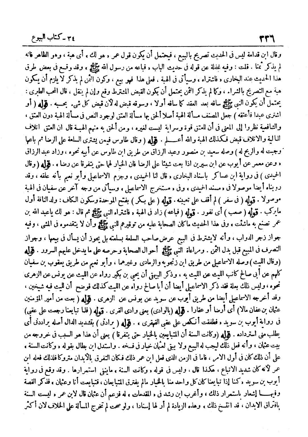 وَقَالَ بن قُدَامَةَ لَيْسَ فِي الْحَدِيثِ تَصْرِيحٌ بِالْبَيْعِ فَيَحْتَمِلُ أَنْ يَكُونَ قَوْلُ عُمَرَ هُوَ لَكَ أَيْ هِبَةً وَهُوَ الظَّاهِرُ فَإِنَّهُ لَمْ يَذْكُرْ ثَمَنًا قُلْتُ وَفِيهِ غَفْلَةٌ عَنْ قَوْلِهِ فِي حَدِيثِ الْبَابِ فَبَاعَهُ مِنْ رَسُولِ اللَّهِ صَلَّى اللَّهُ عَلَيْهِ وَسَلَّمَ وَقَدْ وَقَعَ فِي بَعْضِ طُرُقِ هَذَا الْحَدِيثِ عِنْدَ الْبُخَارِيِّ فَاشْتَرَاهُ وَسَيَأْتِي فِي الْهِبَةِ فَعَلَى هَذَا فَهُوَ بَيْعٌ وَكَوْنُ الثَّمَنِ لَمْ يُذْكَرْ لَا يَلْزَمُ أَنْ يَكُونَ هِبَةً مَعَ التَّصْرِيحِ بِالشِّرَاءِ وَكَمَا لَمْ يَذْكُرِ الثَّمَنَ يَحْتَمِلُ أَنْ يَكُونَ الْقَبْضُ الْمُشْتَرَطُ وَقَعَ وَإِنْ لَمْ يُنْقَلْ قَالَ الْمُحِبُّ الطَّبَرِيُّ يُحْتَمَلُ أَنْ يَكُونَ النَّبِيُّ صَلَّى اللَّهُ عَلَيْهِ وَسَلَّمَ سَاقَهُ بعد العقد كَمَا سَاقه أَو لَا وَسَوْقُهُ قَبْضٌ لَهُ لِأَنَّ قَبْضَ كُلِّ شَيْءٍ بِحَسَبِهِ قَوْلُهُ أَوِ اشْتَرَى عَبْدًا فَأَعْتَقَهُ جَعَلَ الْمُصَنِّفُ مَسْأَلَةَ الْهِبَةِ أَصْلًا أَلْحَقَ بِهَا مَسْأَلَةَ الْعِتْقِ لِوُجُودِ النَّصِّ فِي مَسْأَلَةِ الْهِبَةِ دُونَ الْعِتْقِ وَالشَّافِعِيَّةُ نَظَرُوا إِلَى الْمَعْنَى فِي أَنَّ لِلْعِتْقِ قُوَّةً وَسِرَايَةً لَيْسَتْ لِغَيْرِهِ وَمَنْ أَلْحَقَ بِهِ مِنْهُمُ الْهِبَةَ قَالَ إِنَّ الْعِتْقَ إِتْلَافٌ لِلْمَالِيَّةِ وَالْإِتْلَافُ قَبْضٌ فَكَذَلِكَ الْهِبَةُ وَاللَّهُ أَعْلَمُ قَوْلُهُ وَقَالَ طَاوُسٌ فِيمَنْ يَشْتَرِي السِّلْعَةَ عَلَى الرِّضَا ثُمَّ بَاعَهَا وَجَبَتْ لَهُ وَالرِّبْحُ لَهُ وَصَلَهُ سَعِيدُ بْنُ مَنْصُورٍ وَعَبْدُ الرَّزَّاقِ مِنْ طَرِيق بن طَاوُسٍ عَنْ أَبِيهِ نَحْوَهُ وَزَادَ عَبْدُ الرَّزَّاقِ وَعَن معمر عَن أَيُّوب عَن بن سِيرِينَ إِذَا بِعْتَ شَيْئًا عَلَى الرِّضَا فَإِنَّ الْخِيَارَ لَهُمَا حَتَّى يَتَفَرَّقَا عَنْ رِضًا قَوْلُهُ وَقَالَ الْحميدِي فِي رِوَايَة بن عَسَاكِرَ بِإِسْنَادِ الْبُخَارِيِّ قَالَ لَنَا الْحُمَيْدِيُّ وَجَزَمَ الْإِسْمَاعِيلِيُّ وَأَبُو نُعَيْمٍ بِأَنَّهُ عَلَّقَهُ وَقَدْ رُوِّينَاهُ أَيْضًا مَوْصُولًا فِي مُسْنَدِ الْحُمَيْدِيِّ وَفِي مُسْتَخْرَجِ الْإِسْمَاعِيلِيِّ وَسَيَأْتِي مِنْ وَجْهٍ آخَرَ عَنْ سُفْيَانَ فِي الْهِبَةِ مَوْصُولًا قَوْلُهُ فِي سَفَرٍ لَمْ أَقِفْ عَلَى تَعْيِينِهِ قَوْلُهُ عَلَى بَكْرٍ بِفَتْحِ الْمُوَحَّدَةِ وَسُكُونِ الْكَافِ وَلَدُ النَّاقَةِ أَوَّلَ مَا يُرْكَبُ قَوْلُهُ صَعْبٍ أَيْ نَفُورٌ قَوْلُهُ فَبَاعَهُ زَادَ فِي الْهِبَةِ فَاشْتَرَاهُ النَّبِيِّ صَلَّى اللَّهُ عَلَيْهِ وَسَلَّمَ ثُمَّ قَالَ هُوَ لَكَ يَا عَبْدَ اللَّهِ بْنَ عُمَرَ تَصْنَعُ بِهِ مَا شِئْتَ وَفِي هَذَا الْحَدِيثِ مَا كَانَ الصَّحَابَةُ عَلَيْهِ مِنْ تَوْقِيرِهِمْ لِلنَّبِيِّ صَلَّى اللَّهُ عَلَيْهِ وَسَلَّمَ وَأَنْ لَا يَتَقَدَّمُوهُ فِي الْمَشْيِ وَفِيهِ جَوَازُ زَجْرِ الدَّوَابِّ وَأَنَّهُ لَا يُشْتَرَطُ فِي الْبَيْعِ عَرْضُ صَاحِبِ السِّلْعَةِ بِسِلْعَتِهِ بَلْ يَجُوزُ أَنْ يُسْأَلَ فِي بَيْعِهَا وَجَوَازُ التَّصَرُّفِ فِي الْمَبِيعِ قَبْلَ بَدَلِ الثَّمَنِ وَمُرَاعَاةُ النَّبِيِّ صَلَّى اللَّهُ عَلَيْهِ وَسَلَّمَ أَحْوَالَ الصَّحَابَةِ وَحِرْصُهُ عَلَى مَا يُدْخِلُ عَلَيْهِمُ السُّرُورَ