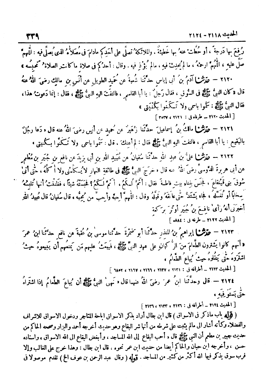 قَالَ بن بَطَّالٍ أَرَادَ بِذِكْرِ الْأَسْوَاقِ إِبَاحَةَ الْمَتَاجِرِ وَدُخُولِ الْأَسْوَاقِ لِلْأَشْرَافِ وَالْفُضَلَاءِ وَكَأَنَّهُ أَشَارَ إِلَى مَا لَمْ يَثْبُتْ عَلَى شَرْطِهِ مِنْ أَنَّهَا شَرُّ الْبِقَاعِ وَهُوَ حَدِيثٌ أَخْرَجَهُ أَحْمَدُ وَالْبَزَّارُ وَصَحَّحَهُ الْحَاكِمُ مِنْ حَدِيثِ جُبَيْرِ بْنِ مُطْعِمٍ أَنَّ النَّبِيَّ صَلَّى اللَّهُ عَلَيْهِ وَسَلَّمَ قَالَ أَحَبُّ البقا ع إِلَى اللَّهِ الْمَسَاجِدُ وَأَبْغَضُ الْبِقَاعِ إِلَى اللَّهِ الْأَسْوَاق وَإِسْنَاده حسن وَأخرجه بن حبَان وَالْحَاكِم أَيْضا من حَدِيث بن عمر نَحوه قَالَ بن بَطَّالٍ وَهَذَا خَرَجَ عَلَى الْغَالِبِ وَإِلَّا فَرُبَّ سُوقٍ يُذْكَرُ فِيهَا اللَّهُ أَكْثَرَ مِنْ كَثِيرٍ مِنَ الْمَسَاجِدِ قَوْلُهُ وَقَالَ عَبْدُ الرَّحْمَنِ بْنُ عَوْف الخ تقدم موصولافى