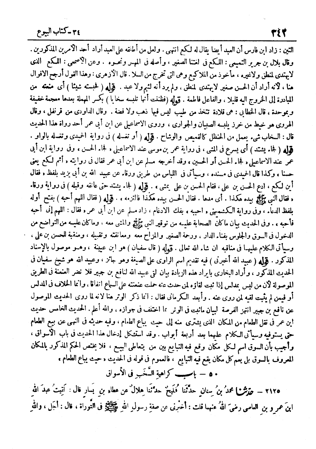 التِّين زَاد بن فَارِسٍ أَنَّ الْعَبْدَ أَيْضًا يُقَالُ لَهُ لُكَعُ انْتَهَى وَلَعَلَّ مَنْ أَطْلَقَهُ عَلَى الْعَبْدِ أَرَادَ أَحَدَ الْأَمْرَيْنِ الْمَذْكُورَيْنِ وَقَالَ بِلَالُ بْنُ جَرِيرٍ التَّمِيمِيُّ اللُّكَعُ فِي لُغَتِنَا الصَّغِيرُ وَأَصْلُهُ فِي الْمَهْرِ وَنَحْوِهِ وَعَنِ الْأَصْمَعِيِّ اللُّكَعُ الَّذِي لَا يَهْتَدِي لِمَنْطِقٍ وَلَا غَيْرِهِ مَأْخُوذٌ مِنَ الْمَلَاكِيعِ وَهِيَ الَّتِي تَخْرُجُ مِنَ السُّلَّا قَالَ الْأَزْهَرِيُّ وَهَذَا الْقَوْلُ أَرْجَحُ الْأَقْوَالِ هُنَا لِأَنَّهُ أَرَادَ أَنَّ الْحَسَنَ صَغِيرٌ لَا يَهْتَدِي لِمَنْطِقٍ وَلَمْ يُرِدْ أَنَّهُ لَئِيمٌ وَلَا عَبْدٌ قَوْلُهُ فَحَبَسَتْهُ شَيْئًا أَيْ مَنَعَتْهُ مِنَ الْمُبَادَرَةِ إِلَى الْخُرُوجِ إِلَيْهِ قَلِيلا وَالْفَاعِل فَاطِمَة قَوْله فَظَنَنْت أَنَّهَا تُلْبِسُهُ سِخَابًا بِكَسْرِ الْمُهْمَلَةِ بَعْدَهَا مُعْجَمَةٌ خَفِيفَةٌ وَبِمُوَحَّدَةٍ قَالَ الْخَطَّابِيُّ هِيَ قِلَادَةٌ تُتَّخَذُ مِنْ طِيبٍ لَيْسَ فِيهَا ذَهَبٌ وَلَا فِضَّةٌ وَقَالَ الدَّاوُدِيُّ مِنْ قُرُنْفُلٍ وَقَالَ الْهَرَوِيُّ هُوَ خَيْطٌ مِنْ خَرَزٍ يَلْبَسُهُ الصِّبْيَانُ وَالْجَوَارِي وَرَوَى الْإِسْمَاعِيلِيّ عَن بن أَبِي عُمَرَ أَحَدِ رُوَاةِ هَذَا الْحَدِيثِ قَالَ السِّخَابُ شَيْءٌ يُعْمَلُ مِنَ الْحَنْظَلِ كَالْقَمِيصِ وَالْوِشَاحِ قَوْلُهُ أَوْ تَغْسِلُهُ فِي رِوَايَةِ الْحُمَيْدِيِّ وَتَغْسِلُهُ بِالْوَاوِ قَوْلُهُ فَجَاءَ يَشْتَدُّ أَيْ يُسْرِعُ فِي الْمَشْيِ فِي رِوَايَةِ عُمَرَ بْنِ مُوسَى عِنْدَ الْإِسْمَاعِيلِيّ فجَاء الْحسن وَفِي رِوَايَة بن أَبِي عُمَرَ عِنْدَ الْإِسْمَاعِيلِيِّ فَجَاءَ الْحَسَنُ أَوِ الْحُسَيْن وَقد أخرجه مُسلم عَن بن أبي عمر فَقَالَ فىروايته أَثَمَّ لُكَعُ يَعْنِي حَسَنًا وَكَذَا قَالَ الْحُمَيْدِيُّ فِي مُسْنَدِهِ وَسَيَأْتِي فِي اللِّبَاسِ مِنْ طَرِيقِ وَرْقَاءَ عَنْ عُبَيْدِ اللَّهِ بْنِ أَبِي يَزِيدَ بِلَفْظِ فَقَالَ أَيْنَ لُكَعُ ادْعُ الْحَسَنَ بْنَ على فَقَامَ الْحَسَنُ بْنُ عَلِيٍّ يَمْشِي قَوْلُهُ فَجَاءَ يَشْتَدُّ حَتَّى عَانَقَهُ وَقَبَّلَهُ فِي رِوَايَةِ وَرْقَاءَ فَقَالَ النَّبِيُّ صَلَّى اللَّهُ عَلَيْهِ وَسَلَّمَ بِيَدِهِ هَكَذَا أَيْ مَدَّهَا فَقَالَ الْحَسَنُ بِيَدِهِ هَكَذَا فَالْتَزَمَهُ قَوْلُهُ فَقَالَ اللَّهُمَّ أَحِبَّهُ بِفَتْحِ أَوَّلِهِ بِلَفْظِ الدُّعَاءِ وَفِي رِوَايَةِ الْكُشْمِيهَنِيِّ أَحْبِبْهُ بِفَكِّ الْإِدْغَامِ زَاد مُسلم عَن بن أَبِي عُمَرَ فَقَالَ اللَّهُمَّ إِنِّي أُحِبُّهُ فَأَحِبَّهُ وَفِي الْحَدِيثِ بَيَانُ مَا كَانَ الصَّحَابَةُ عَلَيْهِ مِنْ تَوْقِيرِ النَّبِيِّ صَلَّى اللَّهُ عَلَيْهِ وَسَلَّمَ وَالْمَشْيِ مَعَهُ وَمَا كَانَ عَلَيْهِ مِنَ التَّوَاضُعِ مِنَ الدُّخُولِ فِي السُّوقِ وَالْجُلُوسِ بِفِنَاءِ الدَّارِ وَرَحْمَةُ الصَّغِيرِ وَالْمُزَاحُ مَعَهُ وَمُعَانَقَتُهُ وَتَقْبِيلُهُ وَمَنْقَبَةٌ لِلْحَسَنِ بْنِ عَلِيٍّ وَسَيَأْتِي الْكَلَامُ عَلَيْهَا فِي مَنَاقِبِهِ إِنْ شَاءَ اللَّهُ تَعَالَى قَوْلُهُ قَالَ سُفْيَانُ هُوَ بن عُيَيْنَةَ وَهُوَ مَوْصُولٌ بِالْإِسْنَادِ الْمَذْكُورِ قَوْلُهُ عُبَيْدُ اللَّهِ أَخْبَرَنِي فِيهِ تَقْدِيمُ اسْمِ الرَّاوِي عَلَى الصِّيغَةِ وَهُوَ جَائِزٌ وَعُبَيْدُ اللَّهِ هُوَ شَيْخُ سُفْيَانَ فِي الْحَدِيثِ الْمَذْكُورِ وَأَرَادَ الْبُخَارِيُّ بِإِيرَادِ هَذِهِ الزِّيَادَةِ بَيَانَ لُقِيِّ عُبَيْدِ اللَّهِ لِنَافِعِ بْنِ جُبَيْرٍ فَلَا تَضُرُّ الْعَنْعَنَةُ فِي الطَّرِيقِ الْمَوْصُولَةِ لِأَنَّ مَنْ لَيْسَ بِمُدَلِّسٍ إِذَا ثَبَتَ لِقَاؤُهُ لِمَنْ حَدَّثَ عَنْهُ حُمِلَتْ