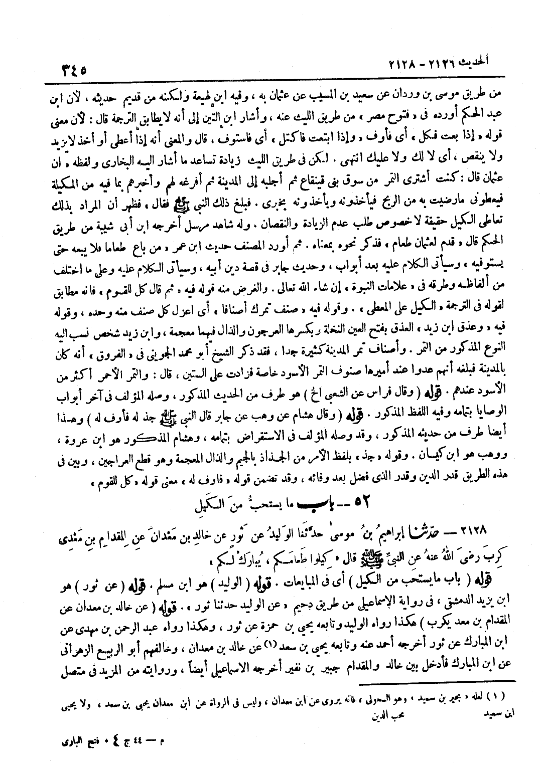 [2128] قَوْله الْوَلِيد هُوَ بن مُسلم قَوْله عَن ثَوْر هُوَ بن يزِيد الدِّمَشْقِي فِي رِوَايَةِ الْإِسْمَاعِيلِيِّ مِنْ طَرِيقِ دُحَيْمٍ عَنِ الْوَلِيدِ حَدَّثَنَا ثَوْرٌ قَوْلُهُ عَنْ خَالِدِ بْنِ مَعْدَانَ عَن الْمِقْدَام بن معد يكرب هَكَذَا رَوَاهُ الْوَلِيدُ وَتَابَعَهُ يَحْيَى بْنُ حَمْزَةَ عَنْ ثَوْرٍ وَهَكَذَا رَوَاهُ عَبْدُ الرَّحْمَنِ بْنُ مهْدي عَن بن الْمُبَارَكِ عَنْ ثَوْرٍ أَخْرَجَهُ أَحْمَدُ عَنْهُ وَتَابَعَهُ يحيى بن سعد عَنْ خَالِدِ بْنِ مَعْدَانَ وَخَالَفَهُمْ أَبُو الرَّبِيعِ الزهْرَانِي عَن بن الْمُبَارَكِ فَأَدْخَلَ بَيْنَ خَالِدٍ وَالْمِقْدَامِ جُبَيْرَ بْنَ نُفَيْرٍ أَخْرَجَهُ الْإِسْمَاعِيلِيُّ أَيْضًا وَرِوَايَتُهُ مِنَ الْمَزِيدِ فِي مُتَّصِل