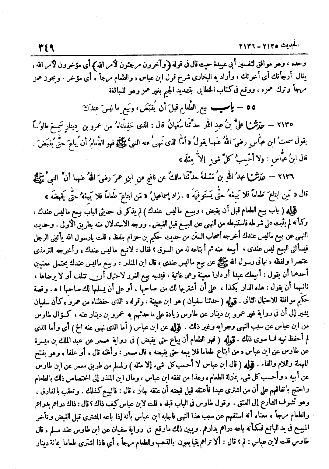 [2135] قَوْله حَدثنَا سُفْيَان هُوَ بن عُيَيْنَةَ وَقَوْلُهُ الَّذِي حَفِظْنَاهُ مِنْ عَمْرٍو كَأَنَّ سُفْيَانَ يُشِيرُ إِلَى أَنَّ فِي رِوَايَةِ غَيْرِ عَمْرِو بْنِ دِينَارٍ عَنْ طَاوُسٍ زِيَادَةً عَلَى مَا حَدَّثَهُمْ بِهِ عَمْرُو بْنُ دِينَارٍ عَنْهُ كسؤال طَاوس من بن عَبَّاسٍ عَنْ سَبَبِ النَّهْيِ وَجَوَابِهِ وَغَيْرِ ذَلِكَ قَوْله عَن بن عَبَّاسٍ أَمَّا الَّذِي نَهَى عَنْهُ إِلَخْ أَيْ وَأَمَّا الَّذِي لَمْ أَحْفَظْ نَهْيَهُ فَمَا سِوَى ذَلِكَ قَوْلُهُ فَهُوَ الطَّعَامُ أَنْ يُبَاعَ حَتَّى يُقْبَضَ فِي رِوَايَةِ مِسْعَرٍ عَنْ عَبْدِ الْمَلِكِ بن ميسرَة عَن طَاوس عَن بن عَبَّاسٍ مَنِ ابْتَاعَ طَعَامًا فَلَا يَبِعْهُ حَتَّى يَقْبِضَهُ قَالَ مِسْعَرٌ وَأَظُنُّهُ قَالَ أَوْ عَلَفًا وَهُوَ بِفَتْحِ الْمُهْمَلَةِ وَاللَّامِ وَالْفَاءِ قَوْلُهُ قَالَ بن عَبَّاسٍ لَا أَحْسَبُ كُلَّ شَيْءٍ إِلَّا مِثْلَهُ وَلمُسلم من طَرِيق معمر عَن بن طَاوُسٍ عَنْ أَبِيهِ وَأَحْسَبُ كُلَّ شَيْءٍ بِمَنْزِلَةِ الطَّعَام وَهَذَا من تفقه بن عَبَّاس وَمَال بن الْمُنْذِرِ إِلَى اخْتِصَاصِ ذَلِكَ بِالطَّعَامِ وَاحْتَجَّ بِاتِّفَاقِهِمْ عَلَى أَنَّ مَنِ اشْتَرَى عَبْدًا فَأَعْتَقَهُ قَبْلَ قَبْضِهِ أَنَّ عِتْقَهُ جَائِزٌ قَالَ فَالْبَيْعُ كَذَلِكَ وَتُعُقِّبَ بِالْفَارِقِ وَهُوَ تَشَوُّفُ الشَّارِعِ إِلَى الْعِتْقِ وَقَوْلُ طَاوُسٍ فِي الْبَابِ قَبْلَهُ قُلْتُ لِابْنِ عَبَّاس كَيفَ ذَاك قَالَ ذَاك دَرَاهِم بدارهم وَالطَّعَامُ مُرْجَأٌ مَعْنَاهُ أَنَّهُ اسْتَفْهَمَ عَنْ سَبَبِ هَذَا النهى فَأَجَابَهُ بن عَبَّاسٍ بِأَنَّهُ إِذَا بَاعَهُ الْمُشْتَرِي قَبْلَ الْقَبْضِ وَتَأَخَّرَ الْمَبِيعُ فِي يَدِ الْبَائِعِ فَكَأَنَّهُ بَاعَهُ دَرَاهِم بدارهم وَيُبَيِّنُ ذَلِكَ مَا وَقَعَ فِي رِوَايَةِ سُفْيَانَ عَن بن طَاوُسٍ عِنْدَ مُسْلِمٍ قَالَ طَاوُسٌ قُلْتُ لِابْنِ عَبَّاسٍ لِمَ قَالَ أَلَا تَرَاهُمْ يَتَبَايَعُونَ بِالذَّهَبِ وَالطَّعَامُ مُرْجَأٌ أَيْ فَإِذَا اشْتَرَى طَعَامًا بِمِائَةِ دِينَار