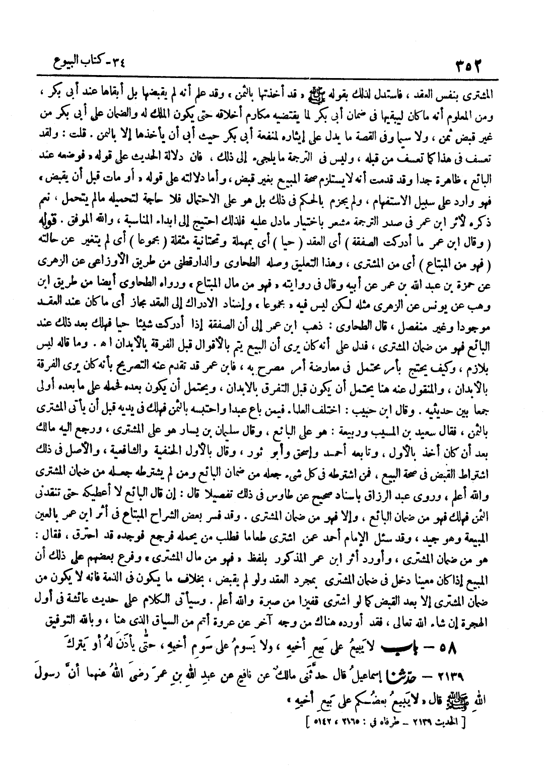 الْمُشْتَرِي بِنَفْسِ الْعَقْدِ فَاسْتَدَلَّ لِذَلِكَ بِقَوْلِهِ صَلَّى اللَّهُ عَلَيْهِ وَسَلَّمَ قَدْ أَخَذْتُهَا بِالثَّمَنِ وَقَدْ عُلِمَ أَنَّهُ لَمْ يَقْبِضْهَا بَلْ أَبْقَاهَا عِنْدَ أَبَى بَكْرٍ وَمِنَ الْمَعْلُومِ أَنَّهُ مَا كَانَ لِيُبْقِيَهَا فِي ضَمَانِ أَبِي بَكْرٍ لِمَا يَقْتَضِيهِ مَكَارِمُ أَخْلَاقِهِ حَتَّى يَكُونَ الْمِلْكُ لَهُ وَالضَّمَانُ عَلَى أَبِي بَكْرٍ مِنْ غَيْرِ قَبْضِ ثَمَنٍ وَلَا سِيَّمَا وَفِي الْقِصَّةِ مَا يَدُلُّ عَلَى إِيثَارِهِ لِمَنْفَعَةِ أَبِي بَكْرٍ حَيْثُ أَبَى أَنْ يَأْخُذَهَا إِلَّا بِالثَّمَنِ قُلْتُ وَلَقَدْ تَعَسَّفَ فِي هَذَا كَمَا تَعَسَّفَ مَنْ قَبْلَهُ وَلَيْسَ فِي التَّرْجَمَة مَا يلجىء إِلَى ذَلِكَ فَإِنَّ دَلَالَةَ الْحَدِيثِ عَلَى قَوْلِهِ فَوَضَعَهُ عِنْدَ الْبَائِعِ ظَاهِرَةٌ جِدًّا وَقَدْ قَدَّمْتُ أَنَّهُ لَا يَسْتَلْزِمُ صِحَّةَ الْمَبِيعِ بِغَيْرِ قَبْضٍ وَأَمَّا دَلَالَتُهُ عَلَى قَوْلِهِ أَوْ مَاتَ قَبْلَ أَنْ يَقْبِضَ فَهُوَ وَارِدٌ عَلَى سَبِيلِ الِاسْتِفْهَامِ وَلَمْ يُجْزَمْ بِالْحُكْمِ فِي ذَلِكَ بَلْ هُوَ عَلَى الِاحْتِمَالِ فَلَا حَاجَةَ لِتَحْمِيلِهِ مَا لَمْ يتَحَمَّل نعم ذكره لاثر بن عُمَرَ فِي صَدْرِ التَّرْجَمَةِ مُشْعِرٌ بِاخْتِيَارِ مَا دَلَّ عَلَيْهِ فَلِذَلِكَ احْتِيجَ إِلَى إِبْدَاءِ الْمُنَاسَبَةِ وَالله الْمُوفق قَوْله وَقَالَ بن عُمَرَ مَا أَدْرَكَتِ الصَّفْقَةُ أَيِ الْعَقْدُ حَيًّا أَيْ بِمُهْمَلَةٍ وَتَحْتَانِيَّةٍ مُثَقَّلَةٍ مَجْمُوعًا أَيْ لَمْ يَتَغَيَّرْ عَنْ حَالَتِهِ فَهُوَ مِنَ الْمُبْتَاعِ أَيْ مِنَ الْمُشْتَرِي وَهَذَا التَّعْلِيقُ وَصَلَهُ الطَّحَاوِيُّ وَالدَّارَقُطْنِيُّ مِنْ طَرِيقِ الْأَوْزَاعِيِّ عَنِ الزُّهْرِيِّ عَنْ حَمْزَةَ بْنِ عَبْدِ اللَّهِ بْنِ عُمَرَ عَنْ أَبِيهِ وَقَالَ فِي رِوَايَتِهِ فَهُوَ مِنْ مَالِ الْمُبْتَاعِ وَرَوَاهُ الطَّحَاوِيّ أَيْضا من طَرِيق بن وَهْبٍ عَنْ يُونُسَ عَنِ الزُّهْرِيِّ مِثْلَهُ لَكِنْ لَيْسَ فِيهِ مَجْمُوعًا وَإِسْنَادُ الْإِدْرَاكِ إِلَى الْعَقْدِ مَجَازٌ أَيْ مَا كَانَ عِنْدَ الْعَقْدِ مَوْجُودًا وَغير مُنْفَصِل قَالَ الطَّحَاوِيّ ذهب بن عُمَرَ إِلَى أَنَّ الصَّفْقَةَ إِذَا أَدْرَكَتْ شَيْئًا حَيًّا فَهَلَكَ بَعْدَ ذَلِكَ عِنْدَ الْبَائِعِ فَهُوَ مِنْ ضَمَانِ الْمُشْتَرِي فَدَلَّ عَلَى أَنَّهُ كَانَ يَرَى أَنَّ الْبَيْعَ يَتِمُّ بِالْأَقْوَالِ قَبْلَ الْفُرْقَةِ بِالْأَبْدَانِ اه وَمَا قَالَهُ لَيْسَ بِلَازِمٍ وَكَيْفَ يَحْتَجُّ بِأَمْرٍ مُحْتَمَلٍ فِي مُعَارَضَةِ أَمْرٍ مُصَرَّحٍ بِهِ فَابْنُ عُمَرَ قَدْ تَقَدَّمَ عَنْهُ التَّصْرِيحُ بِأَنَّهُ كَانَ يَرَى الْفُرْقَةَ بِالْأَبْدَانِ وَالْمَنْقُولُ عَنْهُ عَنْهُ هُنَا يَحْتَمِلُ أَنْ يَكُونَ قَبْلَ التَّفَرُّقِ بِالْأَبْدَانِ وَيَحْتَمِلُ أَنْ يَكُونَ بَعْدَهُ فَحَمْلُهُ عَلَى مَا بَعْدَهُ أَوْلَى جَمْعًا بَيْنَ حَدِيثَيْهِ وَقَالَ بن حَبِيبٍ اخْتَلَفَ الْعُلَمَاءُ فِيمَنْ بَاعَ عَبْدًا وَاحْتَبَسَهُ بِالثَّمَنِ فَهَلَكَ فِي يَدَيْهِ قَبْلَ أَنْ يَأْتِيَ الْمُشْتَرِي بِالثَّمَنِ فَقَالَ سَعِيدُ بْنُ الْمُسَيِّبِ وَرَبِيعَةُ هُوَ عَلَى الْبَائِعِ وَقَالَ سُلَيْمَانُ بْنُ يَسَارٍ هُوَ عَلَى الْمُشْتَرِي وَرَجَعَ إِلَيْهِ مَالِكٌ بَعْدَ أَنْ كَانَ أَخَذَ بِالْأَوَّلِ وَتَابَعَهُ أَحْمَدُ وَإِسْحَاقُ وَأَبُو ثَوْرٍ وَقَالَ بِالْأَوَّلِ الْحَنَفِيَّةُ وَالشَّافِعِيَّةُ وَالْأَصْلُ فِي ذَلِكَ اشْتِرَاطُ الْقَبْضِ فِي صِحَّةِ الْبَيْعِ فَمَنِ اشْتَرَطَهُ فِي كُلِّ شَيْءٍ جَعَلَهُ مِنْ ضَمَانِ الْبَائِعِ وَمَنْ لَمْ يَشْتَرِطْهُ جَعَلَهُ مِنْ ضَمَانِ الْم