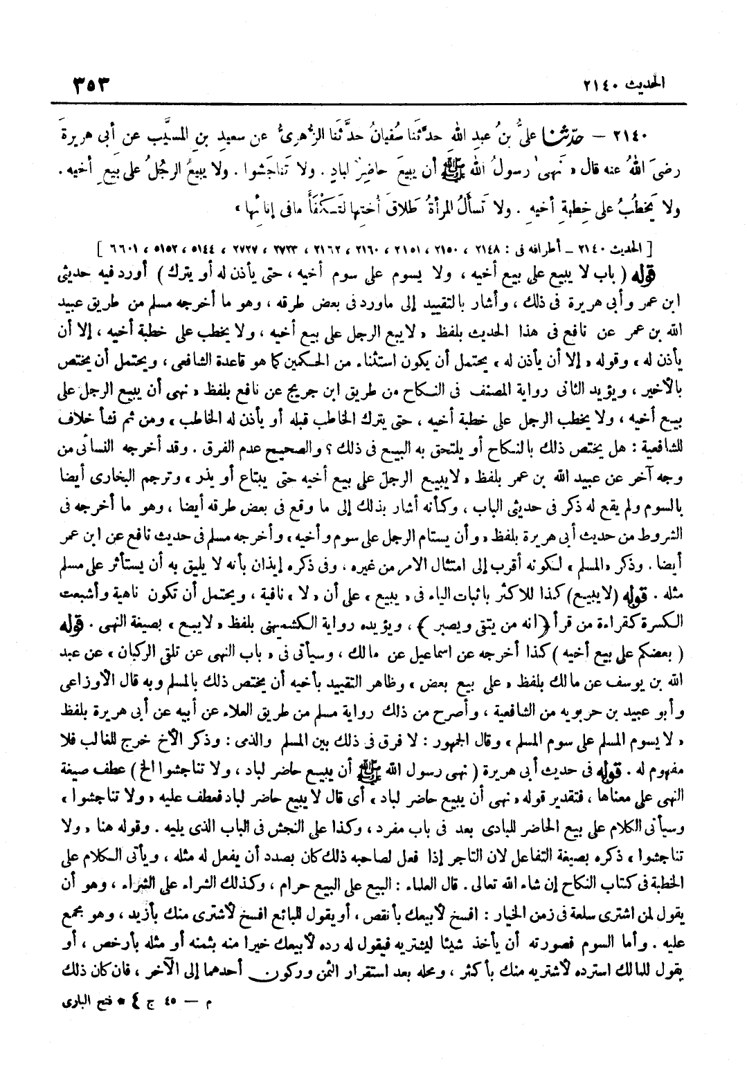 [2139] قَوْلُهُ لَا يَبِيعُ كَذَا لِلْأَكْثَرِ بِإِثْبَاتِ الْيَاءِ فِي يَبِيعُ عَلَى أَنَّ لَا نَافِيَةٌ وَيَحْتَمِلُ أَنْ تَكُونَ نَاهِيَةً وَأُشْبِعَتِ الْكَسْرَةُ كَقِرَاءَةِ مَنْ قَرَأَ إِنَّهُ مَنْ يَتَّقِي وَيَصْبِرْ وَيُؤَيِّدُهُ رِوَايَةُ الْكُشْمِيهَنِيِّ بِلَفْظِ لَا يَبِعْ بِصِيغَةِ النَّهْيِ قَوْلُهُ بَعْضُكُمْ عَلَى بَيْعِ أَخِيهِ كَذَا أَخْرَجَهُ عَنْ إِسْمَاعِيلَ عَنْ مَالِكٍ وَسَيَأْتِي فِي بَابِ النَّهْيِ عَنْ تَلَقِّي الرُّكْبَانِ عَنْ عَبْدِ اللَّهِ بْنِ يُوسُفَ عَنْ مَالِكٍ بِلَفْظِ عَلَى بَيْعِ بَعْضٍ وَظَاهِرُ التَّقْيِيدِ بِأَخِيهِ أَنْ يَخْتَصَّ ذَلِكَ بِالْمُسْلِمِ وَبِهِ قَالَ الْأَوْزَاعِيُّ وَأَبُو عُبَيْدِ بْنُ حَرْبَوَيْهِ مِنَ الشَّافِعِيَّةِ وَأَصْرَحُ مِنْ ذَلِكَ رِوَايَةُ مُسْلِمٍ مِنْ طَرِيقِ الْعَلَاءِ عَنْ أَبِيهِ عَنْ أَبِي هُرَيْرَةَ بِلَفْظِ لَا يَسُومُ الْمُسْلِمُ عَلَى سَوْمِ الْمُسْلِمِ وَقَالَ الْجُمْهُورُ لَا فَرْقَ فِي ذَلِكَ بَيْنَ الْمُسْلِمِ وَالذِّمِّيِّ وَذِكْرُ الْأَخِ خرج للْغَالِب فَلَا مَفْهُوم لَهُ قَوْله فِي حَدِيثُ أَبِي هُرَيْرَةَ نَهَى رَسُولُ اللَّهِ صَلَّى اللَّهُ عَلَيْهِ وَسَلَّمَ أَنْ يَبِيعَ حَاضِرٌ لِبَادٍ وَلَا تَنَاجَشُوا إِلَخْ عَطَفَ صِيغَةَ النَّهْيِ عَلَى مَعْنَاهَا فَتَقْدِيرُ قَوْلِهِ نَهَى أَنْ يَبِيعَ حَاضِرٌ لِبَادٍ أَيْ قَالَ لَا يَبِيعُ حَاضِرٌ لِبَادٍ فَعَطَفَ عَلَيْهِ وَلَا تَنَاجَشُوا وَسَيَأْتِي الْكَلَامُ عَلَى بَيْعِ الْحَاضِرِ لِلْبَادِي بَعْدُ فِي بَابٍ مُفْرَدٍ وَكَذَا عَلَى النَّجْشِ فِي الْبَابِ الَّذِي يَلِيهِ وَقَوْلُهُ هُنَا وَلَا تَنَاجَشُوا ذَكَرَهُ بِصِيغَةِ التَّفَاعُلِ لِأَنَّ التَّاجِرَ إِذَا فَعَلَ لِصَاحِبِهِ ذَلِكَ كَانَ بِصَدَدِ أَنْ يَفْعَلَ لَهُ مِثْلَهُ وَيَأْتِي الْكَلَامُ عَلَى الْخِطْبَةِ فِي كِتَابِ النِّكَاحِ إِنْ شَاءَ اللَّهُ تَعَالَى قَالَ الْعُلَمَاءُ الْبَيْعُ عَلَى الْبَيْعِ حَرَامٌ وَكَذَلِكَ الشِّرَاءُ عَلَى الشِّرَاءِ وَهُوَ أَنْ يَقُولَ لِمَنِ اشْتَرَى سِلْعَةً فِي زَمَنِ الْخِيَارِ افْسَخْ لِأَبِيعَكَ بِأَنْقَصَ أَوْ يَقُولَ لِلْبَائِعِ افْسَخْ لِأَشْتَرِيَ مِنْكَ بِأَزْيَدَ وَهُوَ مُجْمَعٌ عَلَيْهِ وَأَمَّا السَّوْمُ فَصُورَتُهُ أَنْ يَأْخُذَ شَيْئًا لِيَشْتَرِيَهُ فَيَقُولَ لَهُ رُدَّهُ لِأَبِيعَكَ خَيْرًا مِنْهُ بِثَمَنِهِ أَوْ مِثْلِهِ بِأَرْخَصَ أَوْ يَقُولَ لِلْمَالِكِ اسْتَرِدَّهُ لِأَشْتَرِيَهُ مِنْكَ بِأَكْثَرَ وَمَحَلُّهُ بَعْدَ اسْتِقْرَارِ الثَّمَنِ وَرُكُونِ أَحَدِهِمَا إِلَى الْآخَرِ فَإِنْ كَانَ ذَلِكَ