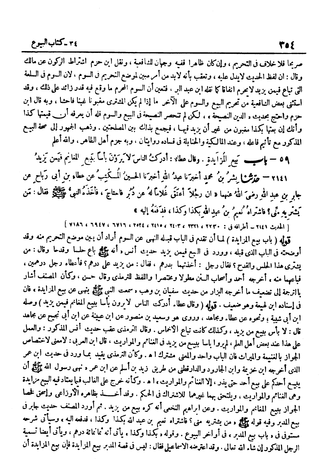 [2141] قَوْلُهُ صَلَّى اللَّهُ عَلَيْهِ وَسَلَّمَ مَنْ يَشْتَرِيهِ مِنِّي فَاشْتَرَاهُ نُعَيْمُ بْنُ عَبْدِ اللَّهِ بِكَذَا وَكَذَا فَدَفَعَهُ إِلَيْهِ وَسَيَأْتِي شَرْحُهُ مُسْتَوفى فِي بَاب بيع الْمُدبر فِي أَو اخر الْبُيُوعِ وَقَوْلُهُ بِكَذَا وَكَذَا يَأْتِي أَنَّهُ ثَمَانِمِائَةِ دِرْهَمٍ وَيَأْتِي أَيْضًا تَسْمِيَةُ الرَّجُلِ الْمَذْكُورِ إِنْ شَاءَ اللَّهُ تَعَالَى وَقَدِ اعْتَرَضَهُ الْإِسْمَاعِيلِيُّ فَقَالَ لَيْسَ فِي قِصَّةِ الْمُدَبَّرِ بَيْعُ الْمُزَايَدَةِ فَإِنَّ بَيْعَ الْمُزَايَدَةِ أَنْ يُعْطَى بِهِ وَاحِدٌ ثَمَنًا ثُمَّ يُعْطَى بِهِ غَيْرُهُ زِيَادَةً عَلَيْهَا اه وَأجَاب بن بَطَّالٍ بِأَنَّ شَاهِدَ التَّرْجَمَةِ مِنْهُ قَوْلُهُ فِي الْحَدِيثِ مَنْ يَشْتَرِيهِ مِنِّي قَالَ فَعَرَضَهُ لِلزِّيَادَةِ لِيَسْتَقْضِيَ فِيهِ لِلْمُفْلِسِ الَّذِي بَاعَهُ عَلَيْهِ وَسَيَأْتِي بَيَان كَونه كَانَ مُفلسًا فِي أَو اخر كتاب الاستقراض
