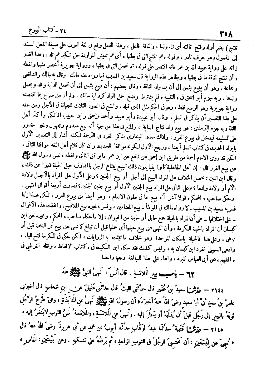 تُنْتَجَ بِضَمِّ أَوَّلِهِ وَفَتْحِ ثَالِثِهِ أَيْ تَلِدُ وَلَدًا وَالنَّاقَةُ فَاعِلٌ وَهَذَا الْفِعْلُ وَقَعَ فِي لُغَةِ الْعَرَبِ عَلَى صِيغَةِ الْفِعْلِ الْمُسْنَدِ إِلَى الْمَفْعُولِ وَهُوَ حَرْفٌ نَادِرٌ وَقَوْلُهُ ثُمَّ تُنْتَجُ الَّتِي فِي بَطْنِهَا أَيْ ثُمَّ تَعِيشُ الْمَوْلُودَةُ حَتَّى تَكْبُرَ ثُمَّ تَلِدَ وَهَذَا الْقَدْرُ زَائِدٌ عَلَى رِوَايَةِ عُبَيْدِ اللَّهِ بْنِ عُمَرَ فَإِنَّهُ اقْتَصَرَ عَلَى قَوْلِهِ ثُمَّ تَحْمِلُ الَّتِي فِي بَطْنِهَا وَرِوَايَةُ جُوَيْرِيَةَ أَخْصَرُ مِنْهُمَا وَلَفْظُهُ أَنْ تُنْتَجَ النَّاقَةُ مَا فِي بَطْنِهَا وَبِظَاهِرِ هَذِهِ الرِّوَايَةِ قَالَ سَعِيدُ بْنُ الْمُسَيَّبِ فِيمَا رَوَاهُ عَنْهُ مَالِكٌ وَقَالَ بِهِ مَالِكٌ وَالشَّافِعِيُّ وَجَمَاعَةٌ وَهُوَ أَنْ يَبِيعَ بِثَمَنٍ إِلَى أَنْ يَلِدَ وَلَدُ النَّاقَةِ وَقَالَ بَعْضُهُمْ أَنْ يَبِيعَ بِثَمَنٍ إِلَى أَنْ تَحْمِلَ الدَّابَّةُ وَتَلِدَ وَيَحْمِلَ وَلَدُهَا وَبِهِ جَزَمَ أَبُو إِسْحَاقَ فِي التَّنْبِيهِ فَلَمْ يَشْتَرِطْ وَضْعَ حَمْلِ الْوَلَدِ كَرِوَايَةِ مَالِكٍ وَلَمْ أَرَ مَنْ صَرَّحَ بِمَا اقْتَضَتْهُ رِوَايَةُ جُوَيْرِيَةَ وَهُوَ الْوَضْعُ فَقَطْ وَهُوَ فِي الْحُكْمِ مِثْلُ الَّذِي قَبْلَهُ وَالْمَنْعُ فِي الصُّوَرِ الثَّلَاثِ لِلْجَهَالَةِ فِي الْأَجَلِ وَمِنْ حَقِّهِ عَلَى هَذَا التَّفْسِيرِ أَنْ يُذْكَرَ فِي السَّلَمِ وَقَالَ أَبُو عُبَيْدَةَ وَأَبُو عبيد وَأحمد وَإِسْحَاق وبن حَبِيبٍ الْمَالِكِيُّ وَأَكْثَرُ أَهْلِ اللُّغَةِ وَبِهِ جَزَمَ التِّرْمِذِيُّ هُوَ بَيْعُ وَلَدِ نِتَاجِ الدَّابَّةِ وَالْمَنْعُ فِي هَذَا مِنْ جِهَةِ أَنَّهُ بَيْعٌ مَعْدُومٌ وَمَجْهُولٌ وَغَيْرُ مَقْدُورٍ عَلَى تَسْلِيمِهِ فَيَدْخُلُ فِي بُيُوعِ الْغَرَرِ وَلِذَلِكَ صَدَّرَ الْبُخَارِيُّ بِذِكْرِ الْغَرَرِ فِي التَّرْجَمَةِ لَكِنَّهُ أَشَارَ إِلَى التَّفْسِيرِ الْأَوَّلِ بِإِيرَادِ الْحَدِيثِ فِي كِتَابِ السَّلَمِ أَيْضًا وَرَجَّحَ الْأَوَّلَ لِكَوْنِهِ مُوَافِقًا لِلْحَدِيثِ وَإِنْ كَانَ كَلَامُ أَهْلِ اللُّغَةِ مُوَافِقًا لِلثَّانِي لَكِنْ قَدْ رَوَى الإِمَام أَحْمد من طَرِيق بن إِسْحَاق عَن نَافِع عَن بن عُمَرَ مَا يُوَافِقُ الثَّانِيَ وَلَفْظُهُ نَهَى رَسُولُ اللَّهِ صَلَّى اللَّهُ عَلَيْهِ وَسَلَّمَ عَنْ بَيْعِ الْغَرَرِ قَالَ إِنَّ أَهْلَ الْجَاهِلِيَّةِ كَانُوا يَتَبَايَعُونَ ذَلِكَ الْبَيْعَ يَبْتَاعُ الرَّجُلُ بِالشَّارِفِ حَبَلَ الْحَبَلَةِ فنهوا عَن ذَلِك وَقَالَ بن التِّينِ مُحَصَّلُ الْخِلَافِ هَلِ الْمُرَادُ الْبَيْعُ إِلَى أَجَلٍ أَوْ بَيْعُ الْجَنِينِ وَعَلَى الْأَوَّلِ هَلِ الْمُرَادُ بِالْأَجَلِ وِلَادَةُ الْأُمِّ أَوْ وِلَادَةُ وَلَدِهَا وَعَلَى الثَّانِي هَلِ الْمُرَادُ بَيْعُ الْجَنِينِ الْأَوَّلِ أَوْ بَيْعُ جَنِينِ الْجَنِينِ فَصَارَتْ أَرْبَعَةَ أَقْوَالٍ انْتَهَى وَحَكَى صَاحِبُ الْمُحْكَمِ قَوْلًا آخَرَ أَنَّهُ بَيْعُ مَا فِي بُطُونِ الْأَنْعَامِ وَهُوَ أَيْضًا مِنْ بُيُوعِ الْغَرَرِ لَكِنْ هَذَا إِنَّمَا فَسَّرَ بِهِ سَعِيدُ بْنُ الْمُسَيَّبِ كَمَا رَوَاهُ مَالِكٌ فِي الْمُوَطَّأِ بَيْعَ الْمَضَامِينِ وَفَسَّرَ بِهِ غَيْرُهُ بَيْعَ الْمَلَاقِيحِ وَاتَّفَقَتْ هَذِهِ الْأَقْوَالُ عَلَى اخْتِلَافِهَا عَلَى أَنَّ الْمُرَادَ بِالْحَبَلَةِ جَمْعُ حَابِلٍ أَوْ حَابِلَةٍ مِنَ الْحَيَوَانِ إِلَّا مَا حَكَاهُ صَاحِبُ الْمُحكم وَغَيره عَن بن كَيْسَانَ أَنَّ الْمُرَادَ بِالْحَبَلَةِ الْكَرْمَةُ وَأَنَّ النَّهْيَ عَنْ بَيْعِ حَبَلِهَا أَيْ حَمْلُهَا قَبْلَ أَنْ تَبْلُغَ كَمَا نَهَى عَنْ بَيْعِ ثَمَرِ النَّخْلَةِ قَبْلَ أَنْ تُزْهَى و