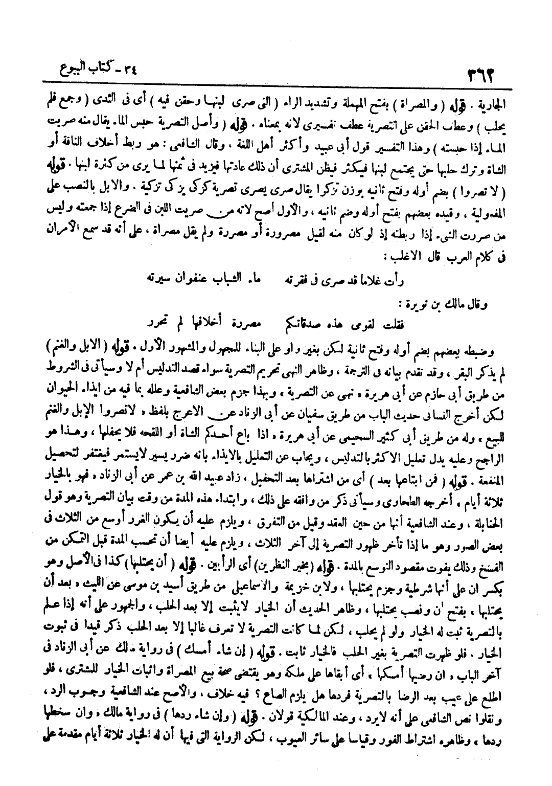 الْجَارِيَةِ قَوْلُهُ وَالْمُصَرَّاةُ بِفَتْحِ الْمُهْمَلَةِ وَتَشْدِيدِ الرَّاءِ الَّتِي صُرِّيَ لَبَنُهَا وَحُقِنَ فِيهِ أَيْ فِي الثَّدْيِ وَجُمِعَ فَلَمْ يُحْلَبْ وَعَطْفُ الْحَقْنِ عَلَى التَّصْرِيَةِ عَطْفٌ تَفْسِيرِيٌّ لِأَنَّهُ بِمَعْنَاهُ قَوْلُهُ وَأَصْلُ التَّصْرِيَةِ حَبْسُ الْمَاءِ يُقَالُ مِنْهُ صَرَيْتُ الْمَاءَ إِذَا حَبَسْتُهُ وَهَذَا التَّفْسِيرُ قَوْلُ أَبِي عُبَيْدٍ وَأَكْثَرُ أَهْلِ اللُّغَةِ وَقَالَ الشَّافِعِيُّ هُوَ رَبْطُ أحلاف النَّاقَةِ أَوِ الشَّاةِ وَتَرْكُ حَلْبِهَا حَتَّى يَجْتَمِعَ لَبَنُهَا فَيَكْثُرَ فَيَظُنَّ الْمُشْتَرِي أَنَّ ذَلِكَ عَادَتُهَا فَيَزِيدَ فِي ثَمَنِهَا لِمَا يَرَى مِنْ كَثْرَةِ لَبَنِهَا