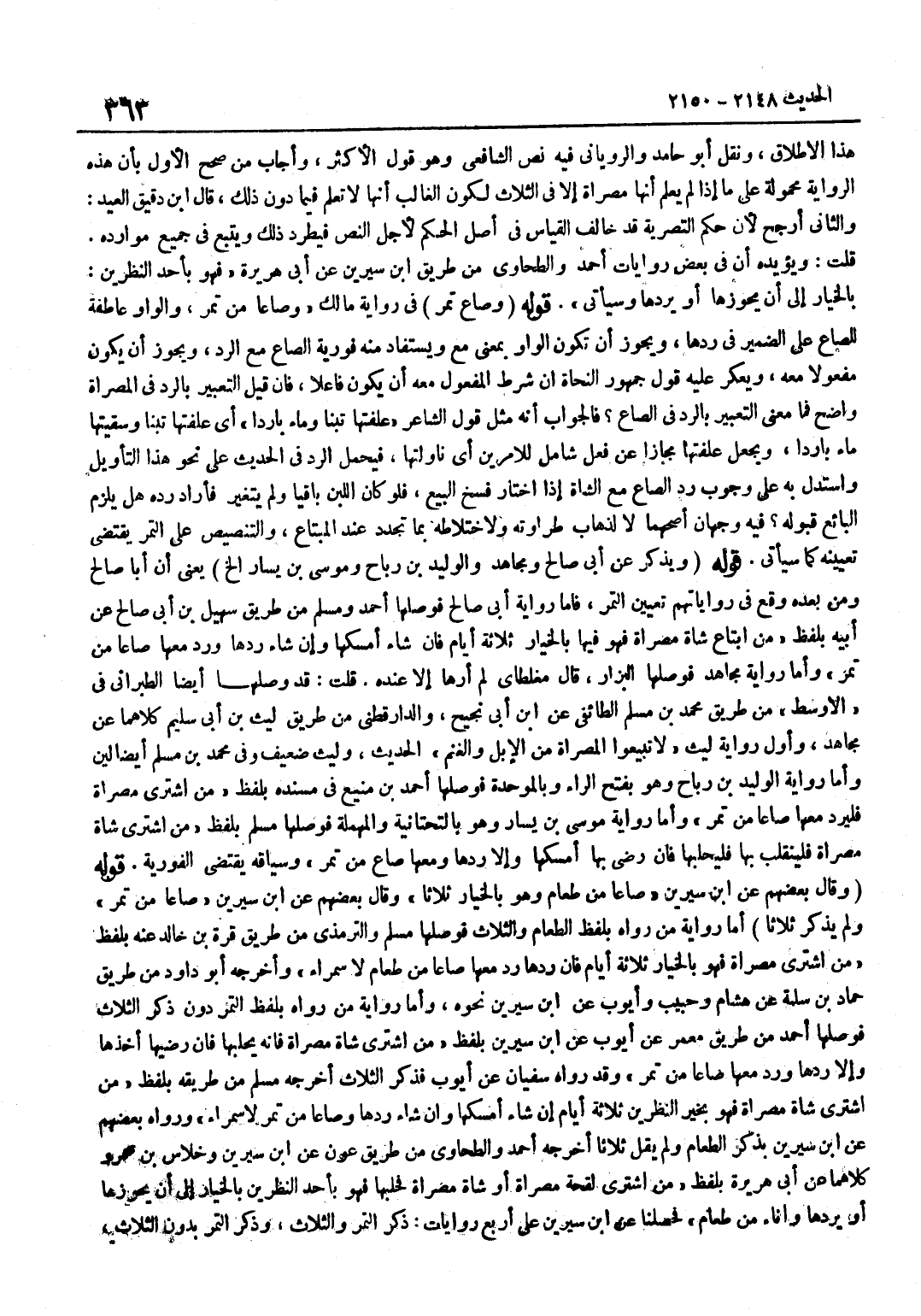 هَذَا الْإِطْلَاقِ وَنَقَلَ أَبُو حَامِدٍ وَالرُّويَانِيُّ فِيهِ نَصَّ الشَّافِعِيِّ وَهُوَ قَوْلُ الْأَكْثَرِ وَأَجَابَ مَنْ صَحَّحَ الْأَوَّلَ بِأَنَّ هَذِهِ الرِّوَايَةَ مَحْمُولَةٌ عَلَى مَا إِذَا لَمْ يَعْلَمْ أَنَّهَا مُصَرَّاةٌ إِلَّا فِي الثَّلَاثِ لِكَوْنِ الْغَالِبِ أَنَّهَا لَا تُعْلَمُ فِيمَا دون ذَلِك قَالَ بن دَقِيقِ الْعِيدِ وَالثَّانِي أَرْجَحُ لِأَنَّ حُكْمَ التَّصْرِيَةِ قَدْ خَالَفَ الْقِيَاسَ فِي أَصْلِ الْحُكْمِ لِأَجْلِ النَّصِّ فَيُطْرَدُ ذَلِكَ وَيُتَّبَعُ فِي جَمِيعِ مَوَارِدِهِ قُلْتُ وَيُؤَيِّدُهُ أَنَّ فِي بَعْضِ رِوَايَاتِ أَحْمَدَ والطَّحَاوِي من طَرِيق بن سِيرِينَ عَنْ أَبِي هُرَيْرَةَ فَهُوَ بِأَحَدِ النَّظَرَيْنِ بِالْخِيَارِ إِلَى أَنْ يَحُوزَهَا أَوْ يَرُدَّهَا وَسَيَأْتِي قَوْلُهُ وَصَاعَ تَمْرٍ فِي رِوَايَةِ مَالِكٍ وَصَاعًا من تمر وَالْوَاو عاطفة للضاع عَلَى الضَّمِيرِ فِي رَدَّهَا وَيَجُوزُ أَنْ تَكُونَ الْوَاوُ بِمَعْنَى مَعَ وَيُسْتَفَادُ مِنْهُ فَوْرِيَّةُ الصَّاعِ مَعَ الرَّدِّ وَيَجُوزُ أَنْ يَكُونَ مَفْعُولًا مَعَهُ وَيُعَكِّرُ عَلَيْهِ قَوْلُ جُمْهُورِ النُّحَاةِ إِنَّ شَرْطَ الْمَفْعُولِ مَعَهُ أَنْ يَكُونَ فَاعِلًا فَإِنْ قِيلَ التَّعْبِيرُ بِالرَّدِّ فِي الْمُصَرَّاةِ وَاضِحٌ فَمَا مَعْنَى التَّعْبِيرِ بِالرَّدِّ فِي الصَّاعِ فَالْجَوَابُ أَنَّهُ مِثْلُ قَول الشَّاعِر علفتها تبنا وَمَاء بَارِد أَيْ عَلَفْتُهَا تِبْنًا وَسَقَيْتُهَا مَاءً بَارِدًا وَيُجْعَلُ عَلَفْتُهَا مَجَازًا عَنْ فِعْلٍ شَامِلٍ لِلْأَمْرَيْنِ أَيْ نَاوَلْتُهَا فَيُحْمَلُ الرَّدُّ فِي الْحَدِيثِ عَلَى نَحْوِ هَذَا التَّأْوِيلِ وَاسْتُدِلَّ بِهِ عَلَى وُجُوبِ رَدِّ الصَّاعِ مَعَ الشَّاةِ إِذَا اخْتَارَ فَسْخَ الْبَيْعِ فَلَوْ كَانَ اللَّبَنُ بَاقِيًا وَلَمْ يَتَغَيَّرْ فَأَرَادَ رَدَّهُ هَلْ يَلْزَمُ الْبَائِعَ قَبُولُهُ فِيهِ وَجْهَانِ أَصَحُّهُمَا لَا لِذَهَابِ طَرَاوَتِهِ وَلِاخْتِلَاطِهِ بِمَا تَجَدَّدَ عِنْدَ الْمُبْتَاعِ وَالتَّنْصِيصُ عَلَى التَّمْرِ يَقْتَضِي تَعْيِينَهُ كَمَا سَيَأْتِي قَوْلُهُ وَيُذْكَرُ عَنْ أَبِي صَالِحٍ وَمُجَاهِدٍ وَالْوَلِيدِ بْنِ رَبَاحٍ وَمُوسَى بْنِ يَسَارٍ إِلَخْ يَعْنِي أَنَّ أَبَا صَالِحٍ وَمَنْ بَعْدَهُ وَقَعَ فِي رِوَايَاتِهِمْ تَعْيِينُ التَّمْرِ فَأَمَّا رِوَايَةُ أَبِي صَالِحٍ فَوَصَلَهَا أَحْمَدُ وَمُسْلِمٌ مِنْ طَرِيقِ سُهَيْلِ بْنِ أَبِي صَالِحٍ عَنْ أَبِيهِ بِلَفْظِ مَنِ ابْتَاعَ شَاةً مُصَرَّاةً فَهُوَ فِيهَا بِالْخِيَارِ ثَلَاثَةَ أَيَّامٍ فَإِنْ شَاءَ أَمْسَكَهَا وَإِنْ شَاءَ رَدَّهَا وَرَدَّ مَعَهَا صَاعًا مِنْ تَمْرٍ وَأَمَّا رِوَايَةُ مُجَاهِدٍ فَوَصَلَهَا الْبَزَّارُ قَالَ مُغَلْطَايْ لَمْ أَرَهَا إِلَّا عِنْدَهُ قُلْتُ قَدْ وَصَلَهَا أَيْضًا الطَّبَرَانِيُّ فِي الْأَوْسَطِ مِنْ طَرِيقِ مُحَمَّدِ بْنِ مُسْلِمٍ الطَّائِفِيِّ عَنْ بن أَبِي نَجِيحٍ وَالدَّارَقُطْنِيُّ مِنْ طَرِيقِ لَيْثِ بْنِ أَبِي سَلِيمٍ كِلَاهُمَا عَنْ مُجَاهِدٍ وَأَوَّلُ رِوَايَةِ لَيْثٍ لَا تَبِيعُوا الْمُصَرَّاةَ مِنَ الْإِبِلِ وَالْغَنَمِ الْحَدِيثَ وَلَيْثٌ ضَعِيفٌ وَفِي مُحَمَّدِ بْنِ مُسْلِمٍ أَيْضًا لِينٌ وَأَمَّا رِوَايَةُ الْوَلِيدِ بْنِ رَبَاحٍ وَهُوَ بِفَتْحِ الرَّاءِ وَبِالْمُوَحَّدَةِ فَوَصَلَهَا أَحْمَدُ بْنُ مَنِيعٍ فِي مُسْنَدِهِ بِلَفْظِ مَنِ اشْتَرَى مُصَرَّاةً فَلْيَرُدَّ مَعَهَا صَاعًا مِنْ تَمْرٍ وَأَمَّا رِوَايَةُ مُوسَى بْنِ يَسَارٍ وَهُوَ بِالتَّحْتَانِيَّةِ وَالْمُهْمَلَةِ فَوَصَلَهَا مُسْلِمٌ بِلَفْظِ مَنِ اشْتَرَى شَاةً مُصَرَّاةً فَلْيَنْقَلِبْ بِهَا فَلْيَحْلِبْهَا 