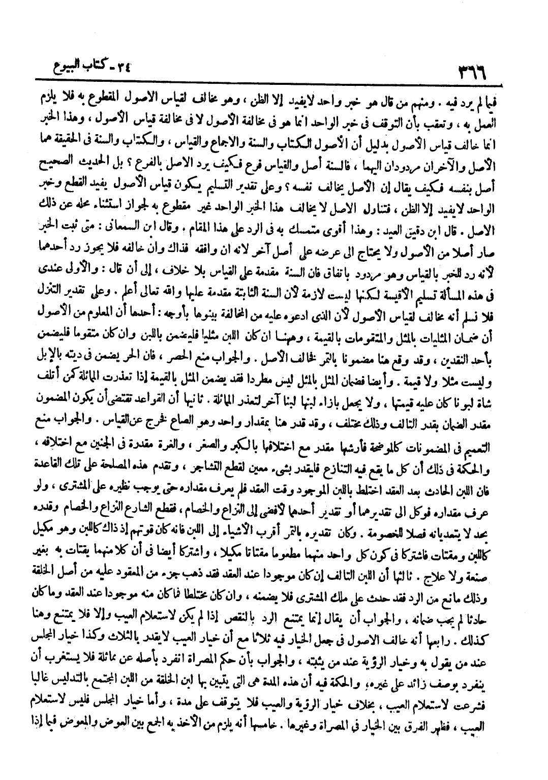فِيمَا لَمْ يَرِدْ فِيهِ وَمِنْهُمْ مَنْ قَالَ هُوَ خَبَرٌ وَاحِدٌ لَا يُفِيدُ إِلَّا الظَّنَّ وَهُوَ مُخَالِفٌ لِقِيَاسِ الْأُصُولِ الْمَقْطُوعِ بِهِ فَلَا يَلْزَمُ الْعَمَلُ بِهِ وَتُعُقِّبَ بِأَنَّ التَّوَقُّفَ فِي خَبَرِ الْوَاحِدِ إِنَّمَا هُوَ فِي مُخَالَفَةِ الْأُصُولِ لَا فِي مُخَالفَة قِيَاس الْأُصُول وَهَذَا الْخَبَر إِنَّمَا خَالَفَ قِيَاسَ الْأُصُولِ بِدَلِيلِ أَنَّ الْأُصُولَ الْكِتَابُ وَالسُّنَّةُ وَالْإِجْمَاعُ وَالْقِيَاسُ وَالْكِتَابُ وَالسُّنَّةُ فِي الْحَقِيقَةِ هُمَا الْأَصْلُ وَالْآخَرَانِ مَرْدُودَانِ إِلَيْهِمَا فَالسُّنَّةُ أَصْلٌ وَالْقِيَاسُ فَرْعٌ فَكَيْفَ يُرَدُّ الْأَصْلُ بِالْفَرْعِ بَلِ الْحَدِيثُ الصَّحِيحُ أَصْلٌ بِنَفْسِهِ فَكَيْفَ يُقَالُ إِنَّ الْأَصْلَ يُخَالِفُ نَفْسَهُ وَعَلَى تَقْدِيرِ التَّسْلِيمِ يَكُونُ قِيَاسُ الْأُصُولِ يُفِيدُ الْقَطْعَ وَخَبَرُ الْوَاحِدِ لَا يُفِيدُ إِلَّا الظَّنَّ فَتَنَاوُلُ الْأَصْلِ لَا يُخَالِفُ هَذَا الْخَبَرَ الْوَاحِدَ غَيْرَ مَقْطُوعٍ بِهِ لِجَوَازِ اسْتِثْنَاءِ مَحَلِّهِ عَنْ ذَلِكَ الْأَصْلِ قَالَ بن دَقِيقِ الْعِيدِ وَهَذَا أَقْوَى مُتَمَسَّكٍ بِهِ فِي الرَّد على هَذَا الْمقَام وَقَالَ بن السَّمْعَانِيِّ مَتَى ثَبَتَ الْخَبَرُ صَارَ أَصْلًا مِنَ الْأُصُولِ وَلَا يُحْتَاجُ إِلَى عَرْضِهِ عَلَى أَصْلٍ آخَرَ لِأَنَّهُ إِنْ وَافَقَهُ فَذَاكَ وَإِنْ خَالَفَهُ فَلَا يَجُوزُ رَدُّ أَحَدِهِمَا لِأَنَّهُ رَدٌّ لِلْخَبَرِ بِالْقِيَاسِ وَهُوَ مَرْدُودٌ بِاتِّفَاقٍ فَإِنَّ السُّنَّةَ مُقَدَّمَةٌ عَلَى الْقِيَاسِ بِلَا خِلَافٍ إِلَى أَنْ قَالَ وَالْأَوْلَى عِنْدِي فِي هَذِهِ الْمَسْأَلَةِ تَسْلِيمُ الْأَقْيِسَةِ لَكِنَّهَا لَيْسَتْ لَازِمَةً لِأَنَّ السُّنَّةَ الثَّابِتَةَ مُقَدَّمَةٌ عَلَيْهَا وَاللَّهُ تَعَالَى أَعْلَمُ وَعَلَى تَقْدِيرِ التَّنَزُّلِ فَلَا نُسَلِّمُ أَنَّهُ مُخَالِفٌ لِقِيَاسِ الْأُصُولِ لِأَنَّ الَّذِي ادَّعَوْهُ عَلَيْهِ مِنَ الْمُخَالَفَةِ بَيَّنُوهَا بِأَوْجُهٍ أَحَدُهَا أَنَّ الْمَعْلُومَ مِنَ الْأُصُولِ أَنَّ ضَمَانَ الْمِثْلِيَّات بِالْمثلِ والمتقومات بِالْقيمَةِ وَهَهُنَا إِنْ كَانَ اللَّبَنُ مِثْلِيًّا فَلْيُضْمَنْ بِاللَّبَنِ وَإِنْ كَانَ مُتَقَوَّمًا فَلْيُضْمَنْ بِأَحَدِ النَّقْدَيْنِ وَقَدْ وَقَعَ هُنَا مَضْمُونًا بِالتَّمْرِ فَخَالَفَ الْأَصْلَ وَالْجَوَابُ مَنْعُ الْحَصْرِ فَإِنَّ الْحُرَّ يُضْمَنُ فِي دِيَتِهِ بِالْإِبِلِ وَلَيْسَتْ مِثْلًا وَلَا قِيمَةً وَأَيْضًا فَضَمَانُ الْمِثْلِ بِالْمِثْلِ لَيْسَ مُطَّرِدًا فَقَدْ يُضْمَنُ الْمِثْلُ بِالْقِيمَةِ إِذَا تَعَذَّرَتِ الْمُمَاثَلَةُ كَمَنْ أَتْلَفَ شَاةً لَبُونًا كَانَ عَلَيْهِ قِيمَتُهَا وَلَا يُجْعَلُ بِإِزَاءِ لَبَنِهَا لَبَنًا آخَرَ لِتَعَذُّرِ الْمُمَاثَلَةِ ثَانِيهَا أَنَّ الْقَوَاعِدَ تَقْتَضِي أَنْ يَكُونَ الْمَضْمُونُ مُقَدَّرَ الضَّمَانِ بِقَدْرِ التَّالِفِ وَذَلِكَ مُخْتَلِفٌ وَقَدْ قُدِّرَ هُنَا بِمِقْدَارٍ وَاحِدٍ وَهُوَ الصَّاعُ فَخَرَجَ عَنِ الْقِيَاسِ وَالْجَوَابُ مَنْعُ التَّعْمِيمِ فِي الْمَضْمُونَاتِ كَالْمُوضِحَةِ فَأَرْشُهَا مُقَدَّرٌ مَعَ اخْتِلَافِهَا بِالْكِبَرِ وَالصِّغَرِ وَالْغُرَّةُ مُقَدَّرَةٌ فِي الْجَنِينِ مَعَ اخْتِلَافِهِ وَالْحِكْمَةُ فِي ذَلِكَ أَنَّ كُلَّ مَا يَقَعُ فِيهِ التَّنَازُعُ فَلْيُقَدَّرْ بِشَيْءٍ مُعَيَّنٍ لِقَطْعِ التَّشَاجُرِ وَتُقَدَّمُ هَذِهِ الْمَصْلَحَةُ عَلَى تِلْكَ الْقَاعِدَةِ فَإِنَّ اللَّبَنَ الْحَادِثَ بَعْدَ الْعَقْدِ اخْتَلَطَ بِاللَّبَنِ الْمَوْجُودِ وَقْتَ الْعَقْدِ فَلَمْ يُعْرَفْ مِقْدَارُهُ حَتَّى يُوجَب