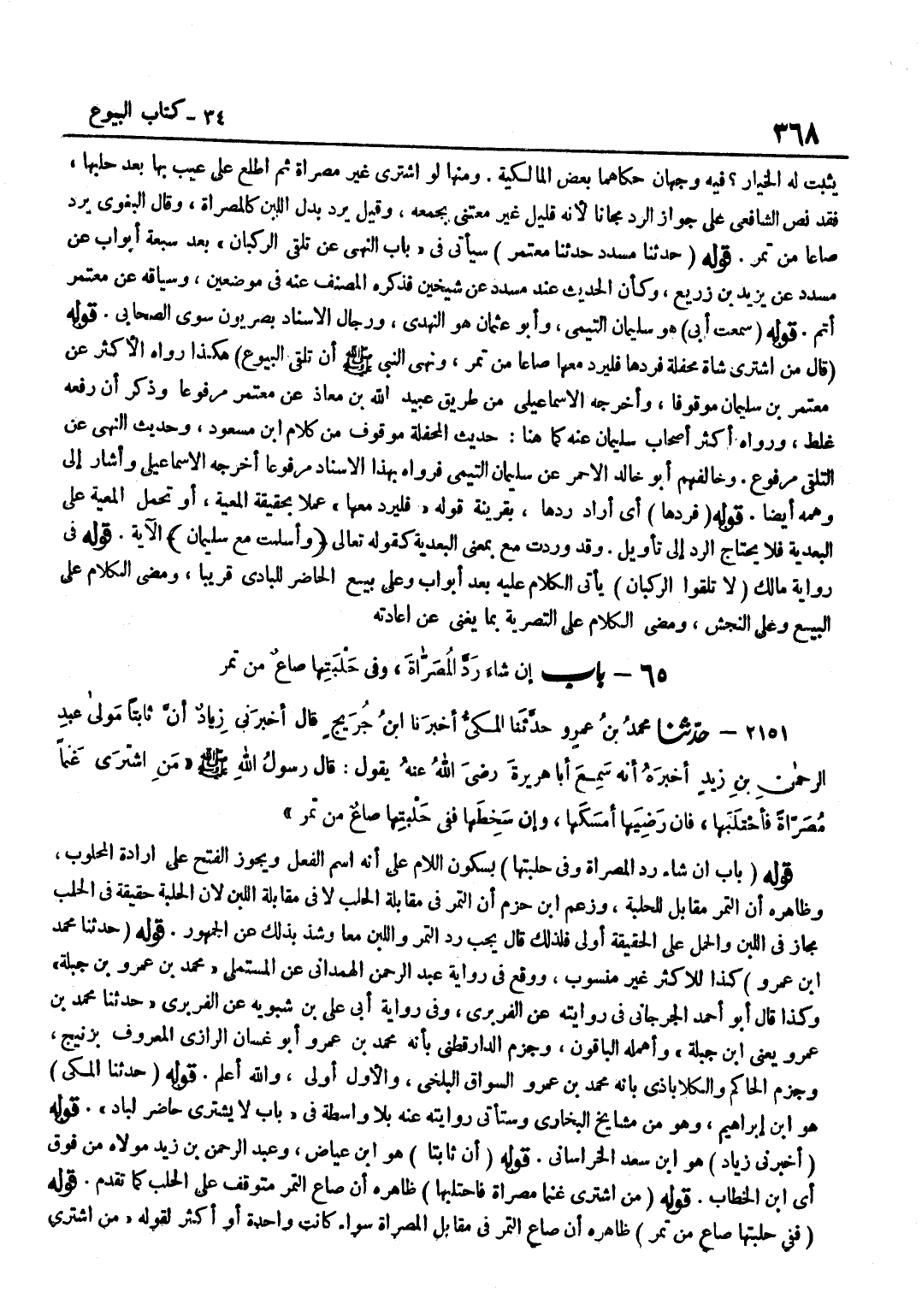 [2151] قَوْلُهُ حَدَّثَنَا مُحَمَّدُ بْنُ عَمْرٍو كَذَا لِلْأَكْثَرِ غَيْرَ مَنْسُوبٍ وَوَقَعَ فِي رِوَايَةِ عَبْدِ الرَّحْمَنِ الْهَمْدَانِيِّ عَنِ الْمُسْتَمْلِي مُحَمَّدُ بْنُ عَمْرِو بْنِ جَبَلَةَ وَكَذَا قَالَ أَبُو أَحْمَدَ الْجُرْجَانِيُّ فِي رِوَايَتِهِ عَنِ الْفَرَبْرِيِّ وَفِي رِوَايَةِ أَبِي عَلِيِّ بْنِ شَبُّوَيْهِ عَنِ الْفَرَبْرِيِّ حَدَّثَنَا مُحَمَّدُ بْنُ عَمْرٍو يَعْنِي بن جَبَلَةَ وَأَهْمَلَهُ الْبَاقُونَ وَجَزَمَ الدَّارَقُطْنِيُّ بِأَنَّهُ مُحَمَّدُ بْنُ عَمْرٍو أَبُو غَسَّانَ الرَّازِيُّ الْمَعْرُوفُ بِزُنَيْجٍ وَجَزَمَ الْحَاكِمُ وَالْكَلَابَاذِيُّ بِأَنَّهُ مُحَمَّدُ بْنُ عَمْرٍو السَّوَّاقُ الْبَلْخِيُّ وَالْأَوَّلُ أَوْلَى وَاللَّهُ أَعْلَمُ قَوْلُهُ حَدثنَا المكى هُوَ بن إِبْرَاهِيمَ وَهُوَ مِنْ مَشَايِخِ الْبُخَارِيِّ وَسَتَأْتِي رِوَايَتُهُ عَنْهُ بِلَا وَاسِطَةٍ فِي بَابِ لَا يَشْتَرِي حَاضر لباد قَوْله أَخْبرنِي زِيَاد هُوَ بن سعد الخرساني قَوْله أَن ثَابتا هُوَ بن عِيَاضٍ وَعَبْدُ الرَّحْمَنِ بْنُ زَيْدٍ مَوْلَاهُ مِنْ فَوق أَي بن الْخَطَّابِ قَوْلُهُ مَنِ اشْتَرَى غَنَمًا مُصَرَّاةً فَاحْتَلَبَهَا ظَاهِرُهُ أَنَّ صَاعَ التَّمْرِ مُتَوَقِّفٌ عَلَى الْحَلْبِ كَمَا تَقَدَّمَ قَوْلُهُ فَفِي حَلْبَتِهَا صَاعٌ مِنْ تَمْرٍ ظَاهِرُهُ أَنَّ صَاعَ التَّمْرِ فِي مُقَابِلِ الْمُصَرَّاةِ سَوَاءٌ كَانَتْ وَاحِدَةً أَوْ أَكْثَرَ لِقَوْلِهِ من اشْترى